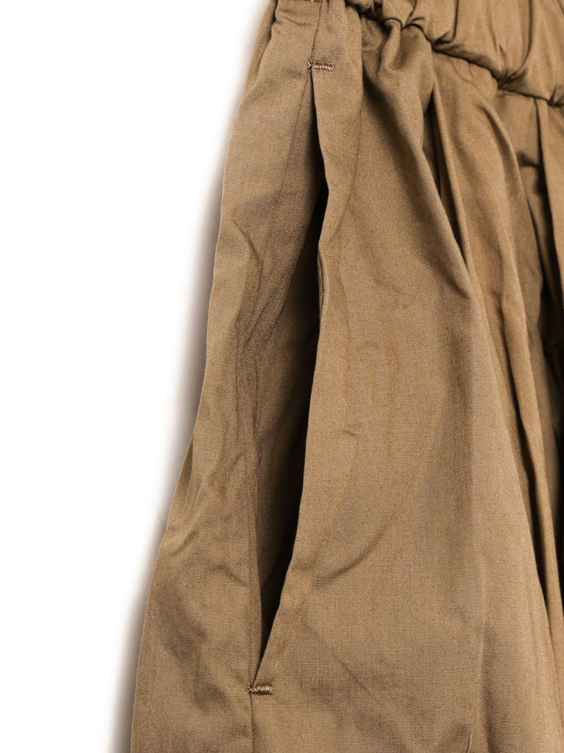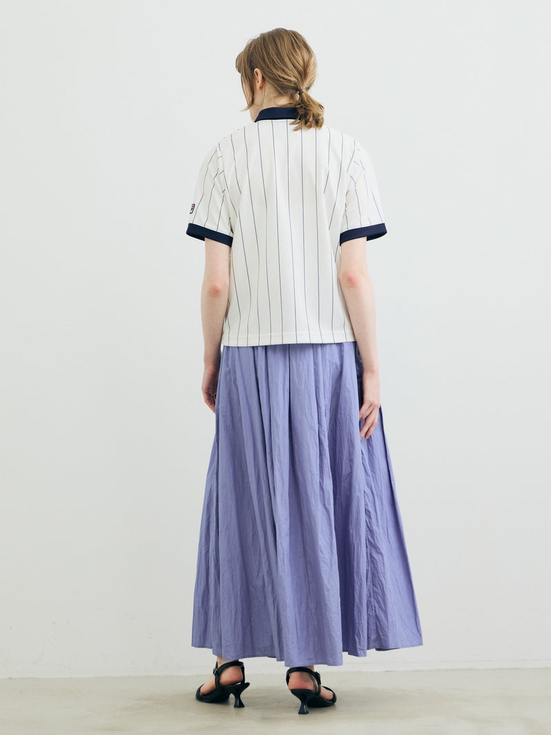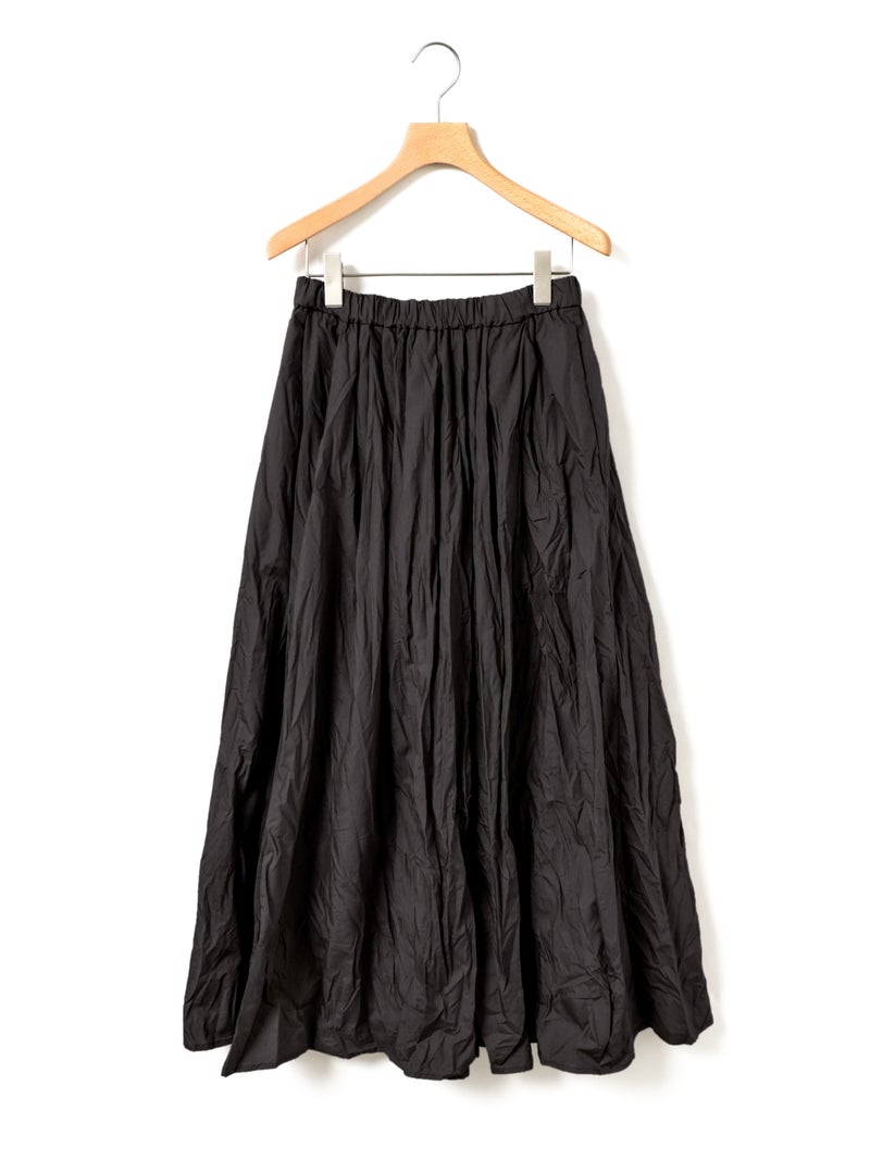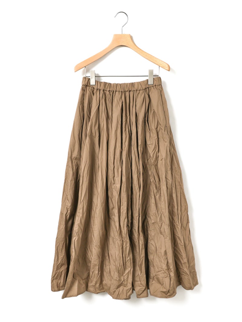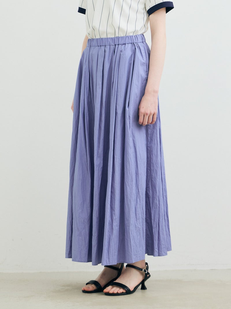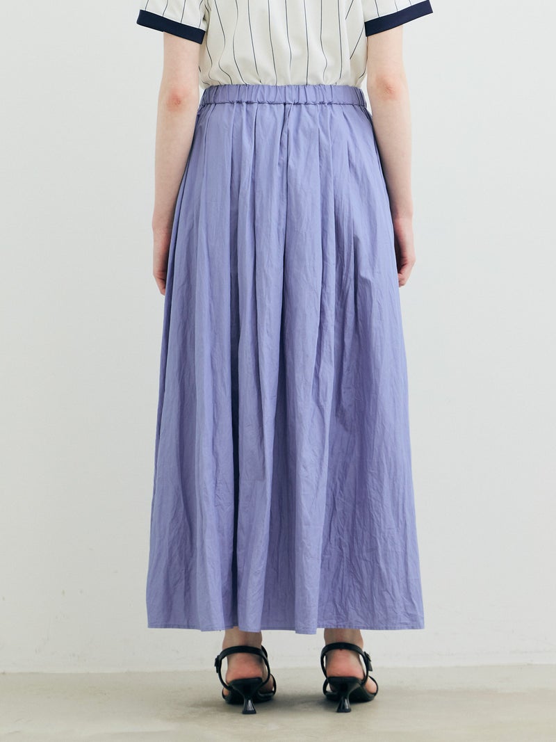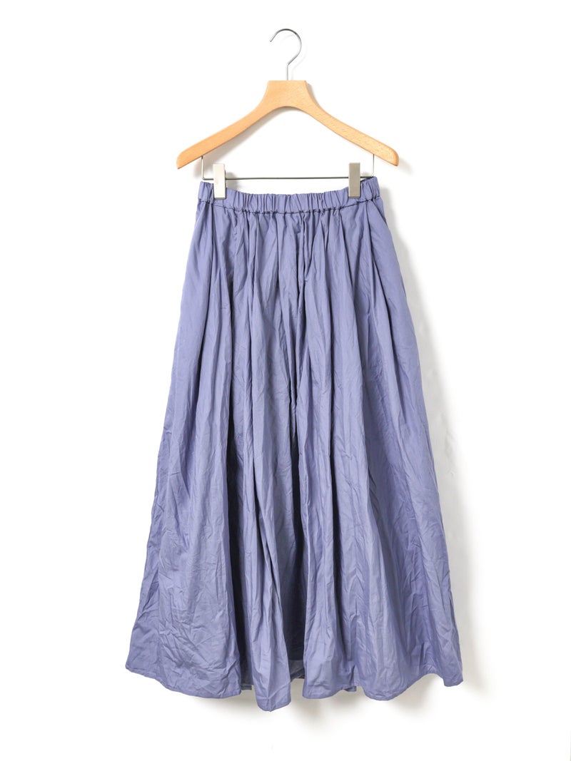 25SSに展開した1-860063/タックボリュームスカートの生地替えでデザインしたタックボリュームスカートです。タックを変更し、均等にタックを入れることで全体的にボリューム感のあるシルエットを表現。キープコーマ糸を打ち込んだ密度の高いブロード地を使用したことで糸の密度が高く、軽いけど適度にハリ感があり洗い加工をかけた風合いが魅力的に仕上がった1枚です。ねじった状態で納品されるため、しわ感は自分で調整できるのもポイント。夏場も快適に着用していただける女性らしいアイテムです。