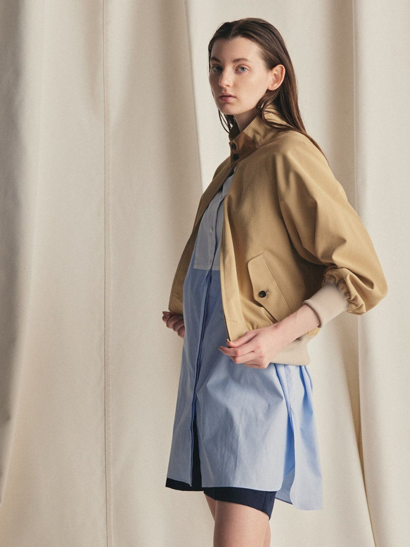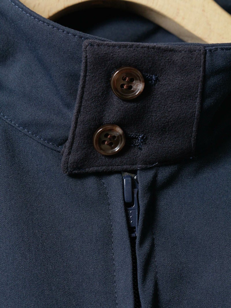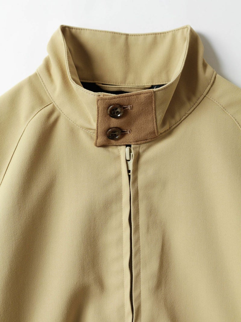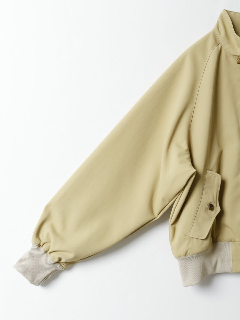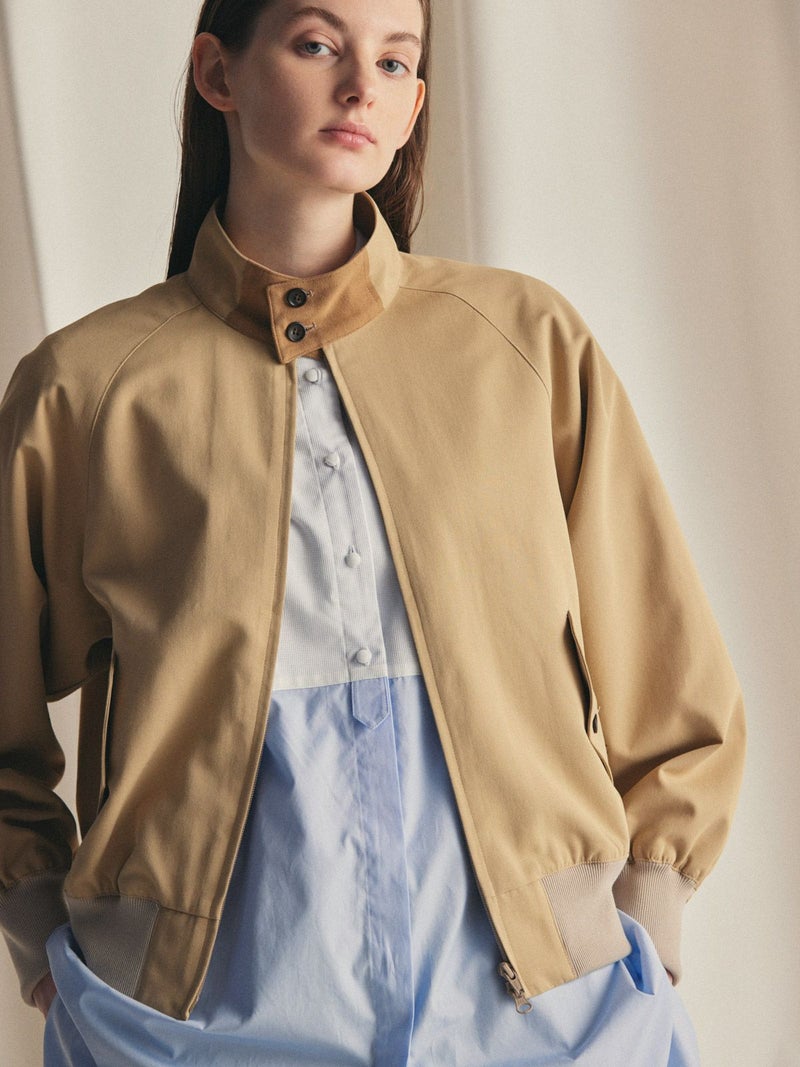 80年代のスウィングトップをベースに作られたヴィンテージのハリントンジャケットを元にデザイン。メンズライクなサイズとシルエットに上品さと女性らしさを兼ね備えたジャケットです。メンズサイズを着る女性特有のドレープ感を強調させるためにセレクトした落ち感のあるツイル素材を使用。綿に比べシワになりにくくコットンライクな風合いを体感できる1着。ハリトンジャケットの1番の特徴であるドッグイヤーカラーの襟端をフェイクスウェードで切り替え上品さをプラスしています。