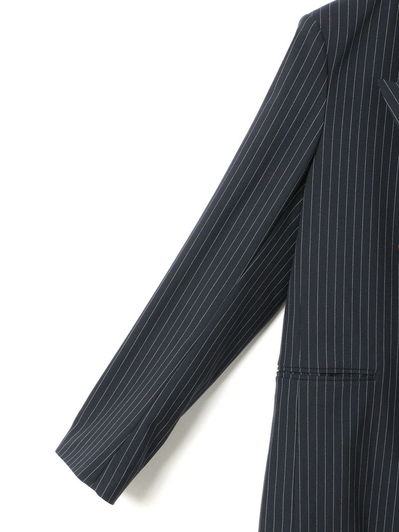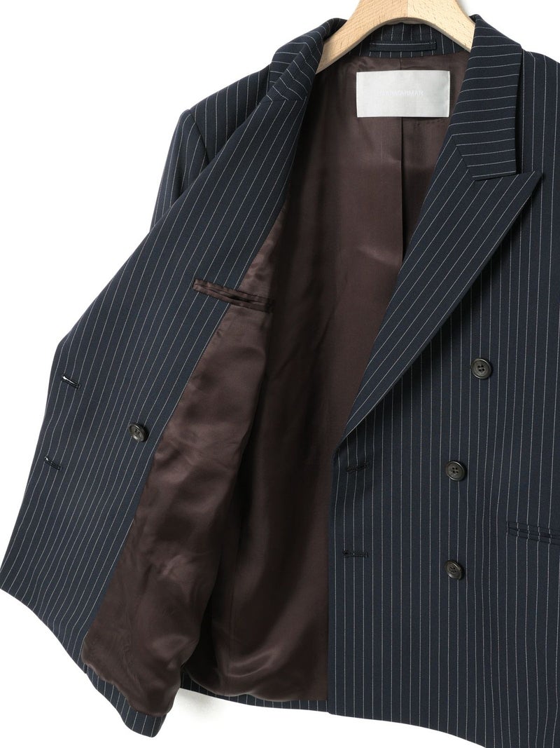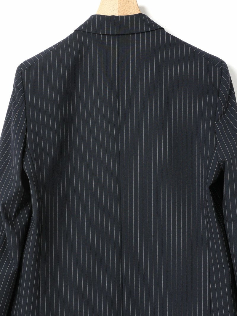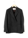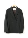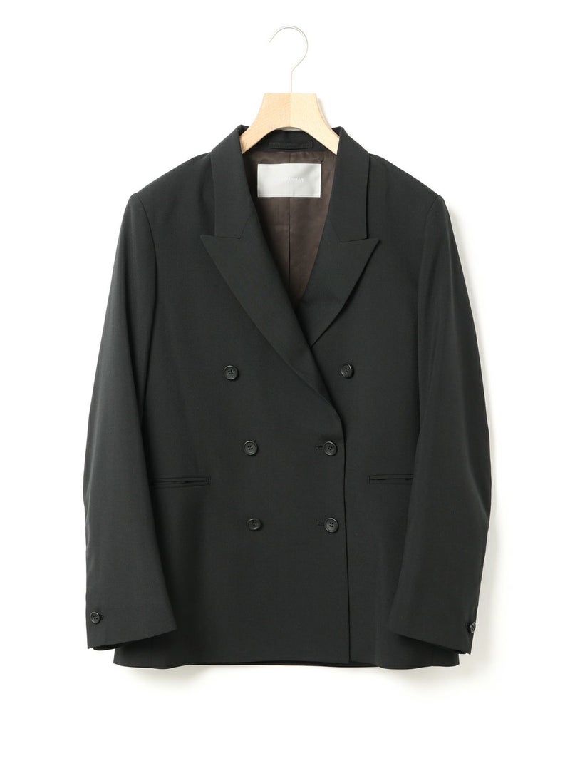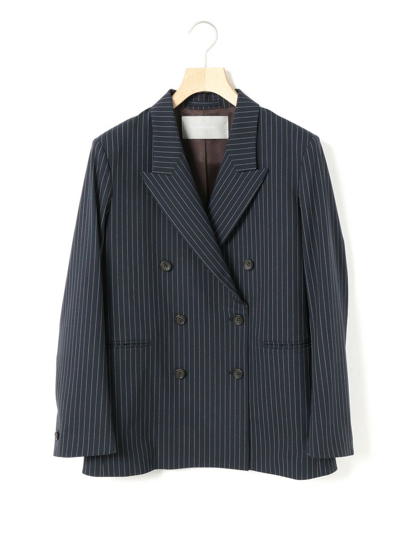 ダブルのジャケットを着崩せる人。古着屋で買ったメンズのジャケットを格好良くラフに着る。そんな女性をイメージしてデザインしました。少し低目のゴージライン。少し広めのラペル。フロントにダーツのない、極力シェイプされていないシルエット。肩周りは程よくゆとりはあるものの決してビッグシルエットにならない。着丈は少しだけ長目。シルエットや細かいディテールのバランスで、懐かしくもフレッシュに感じるアイテムに仕上げた1枚です。素材:無地→防シワ性があり、ドライタッチで通年着用が可能なウール混。ストライプ→2WAYストレッチのTR素材(スラックスと同素材、セットアップ着用可)。