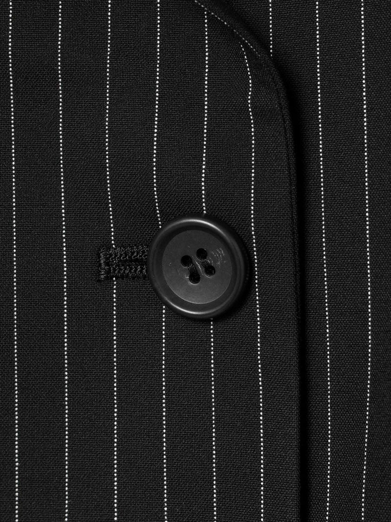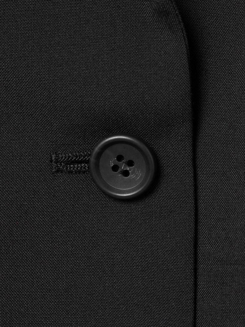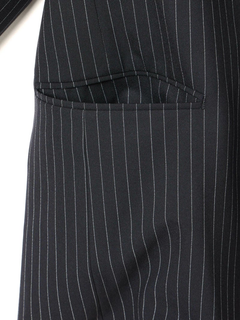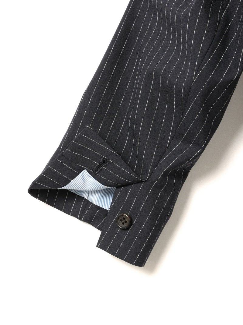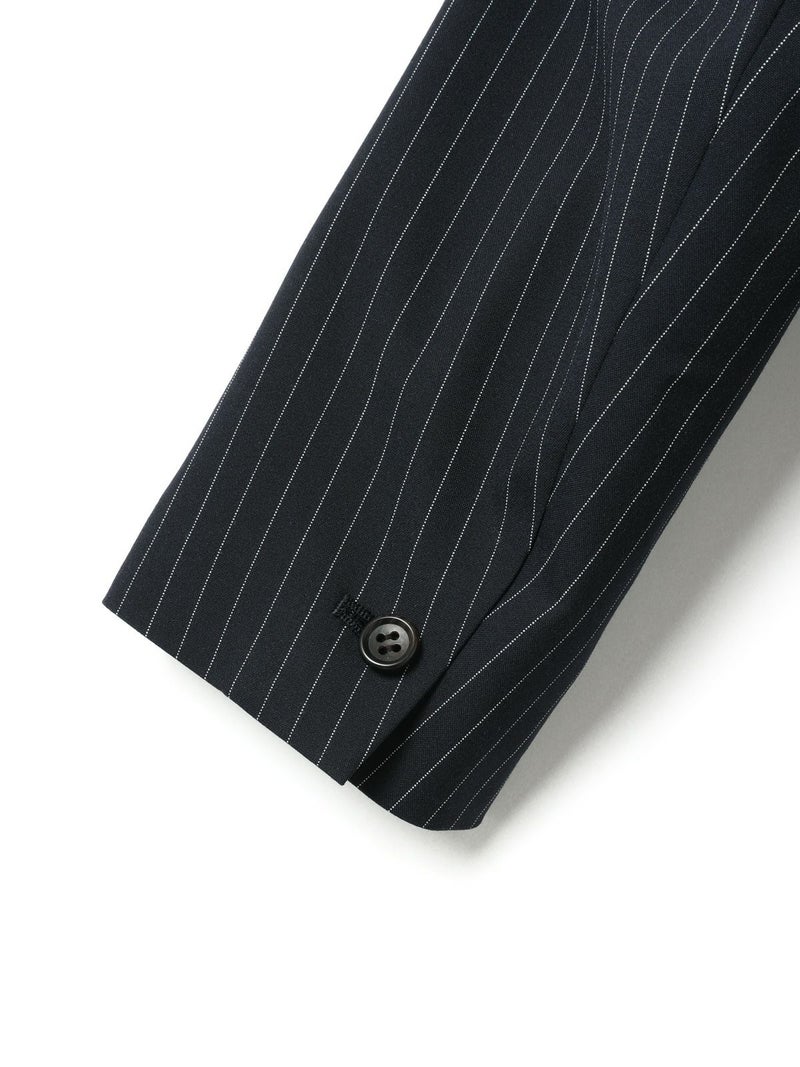 ダブルのジャケットを着崩せる人。古着屋で買ったメンズのジャケットを格好良くラフに着る。そんな女性をイメージしてデザインしました。少し低目のゴージライン。少し広めのラペル。フロントにダーツのない、極力シェイプされていないシルエット。肩周りは程よくゆとりはあるものの決してビッグシルエットにならない。着丈は少しだけ長目。シルエットや細かいディテールのバランスで、懐かしくもフレッシュに感じるアイテムに仕上げた1枚です。素材:無地→防シワ性があり、ドライタッチで通年着用が可能なウール混。ストライプ→2WAYストレッチのTR素材(スラックスと同素材、セットアップ着用可)。