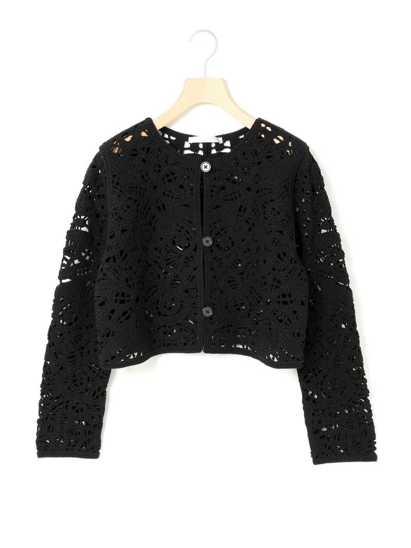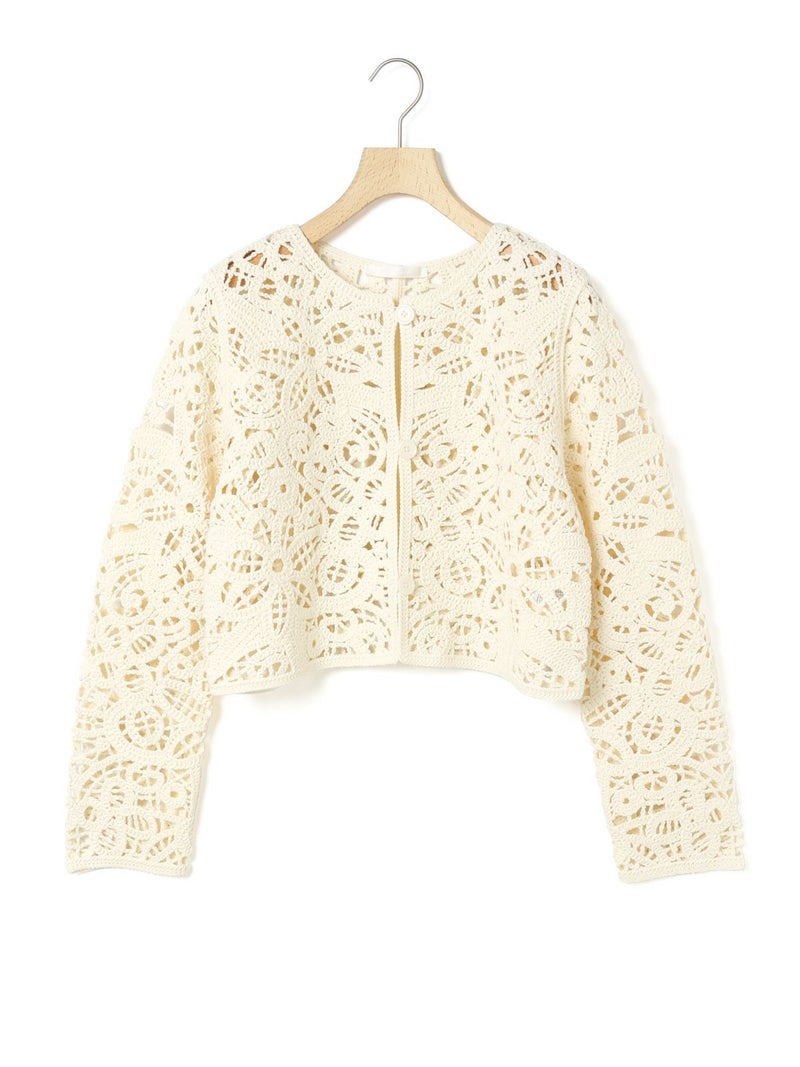 特殊なレース編みによって、ニットでレースを表現したデザイン性のあるレース編みショートカーディガンです。レースの編み方に合わせて図案を作成し、柄の表現に拘っているので立体的で印象的な仕上がりになっています。形は何にでも羽織って合わせやすいシンプルなカーディガン。少しショート丈にしており、重々しくならずコンパクトに着用ができます。また、ハイウエストのボトムとの相性も良く、今年らしいコーディネートバランスを作ることができるのもオススメです。