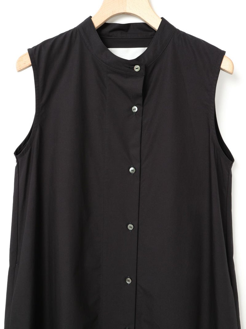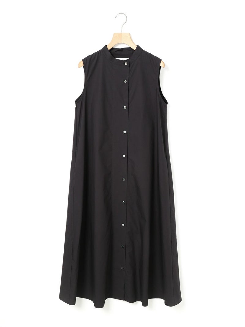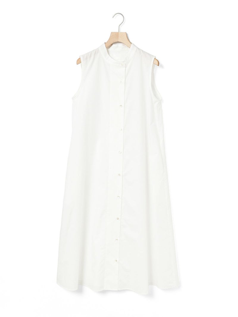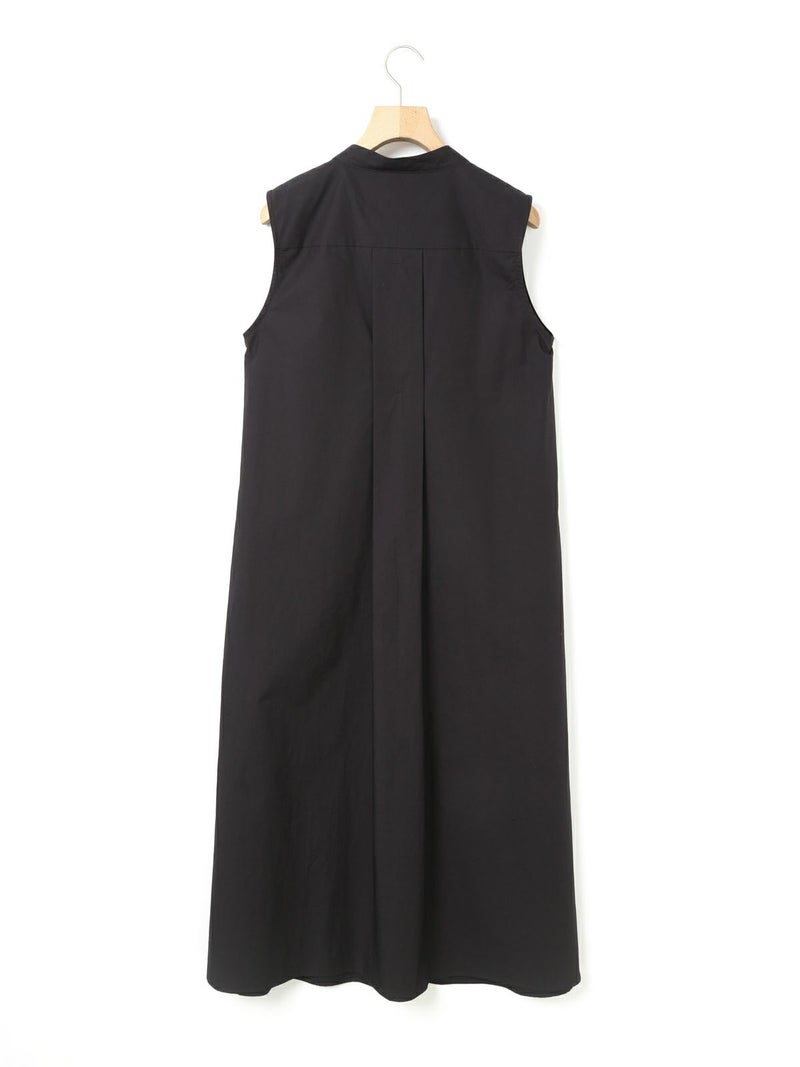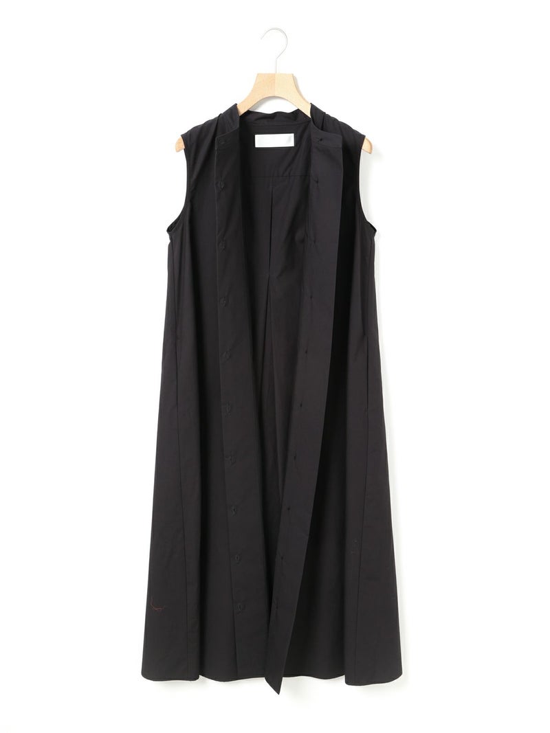 ジレとしてもスタイリングできるノーカラージレワンピースです。スッキリとしたAラインのシルエットながら前立てをあえて存在感ある太さにしボタン位置を中央よりもずらしデザイン性を加えました。また、後ろ身頃のタックをステッチで抑えワンポイントのあるバックスタイルにしています。シンプルに1枚着でもよく、デザイン性あるシャツワンピースに仕上げた1枚です。キレイ目のタイプライター素材を使用。(2-830033/オープンカラーハーフスリーブシャツと共通素材※カラー展開は異なります)。