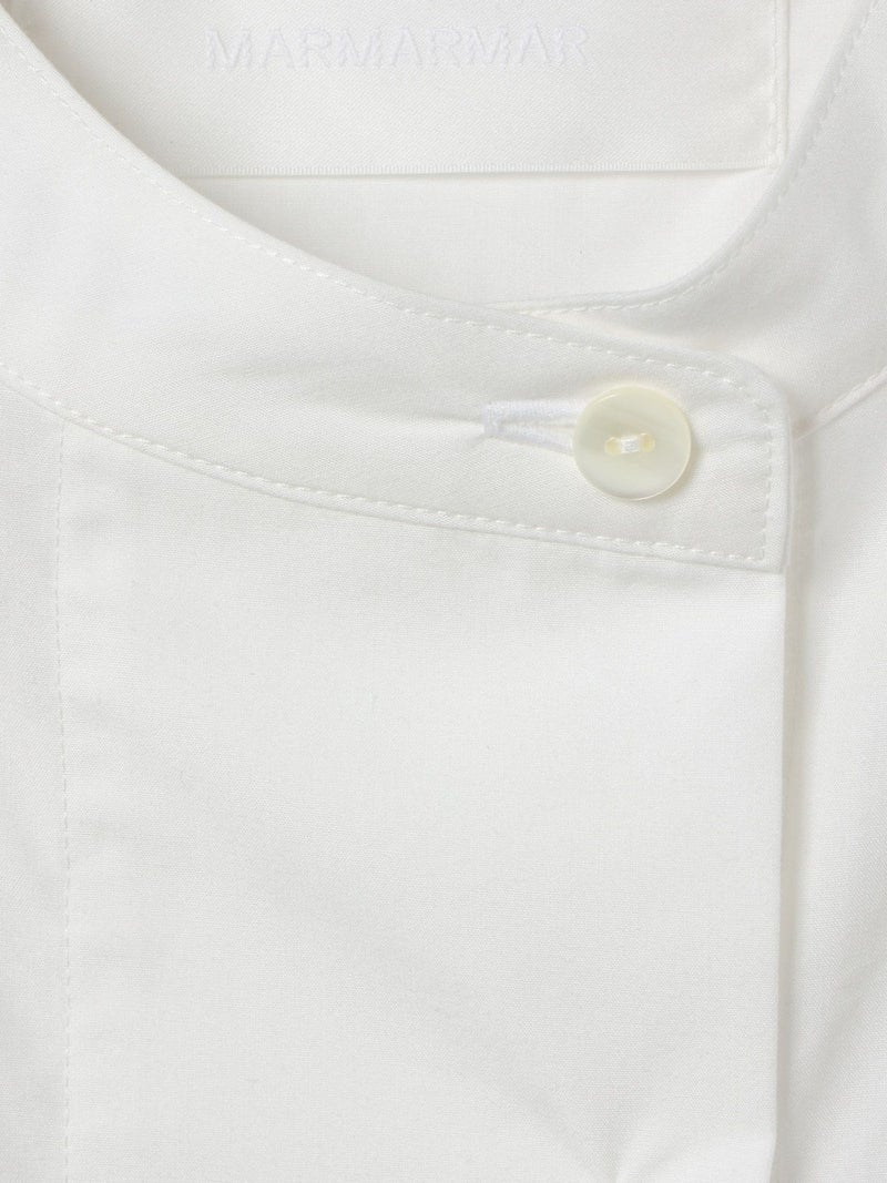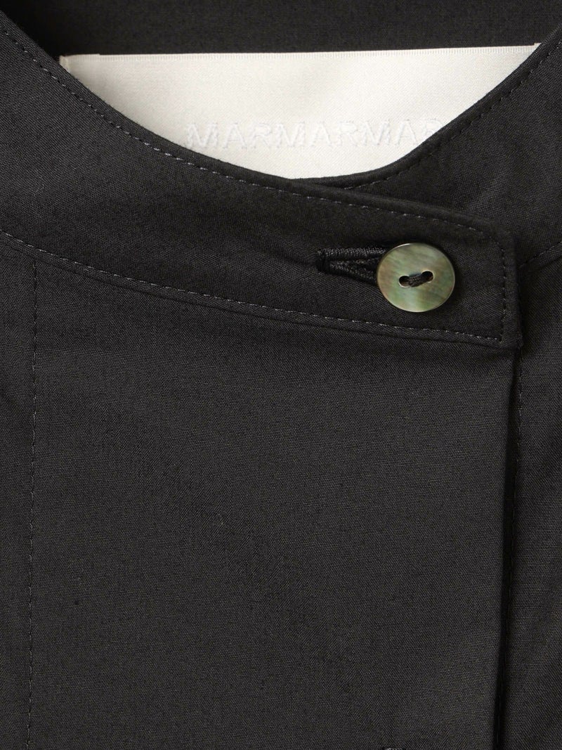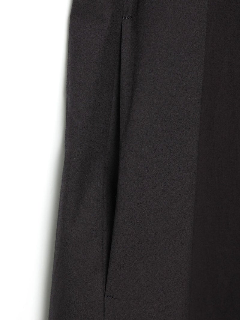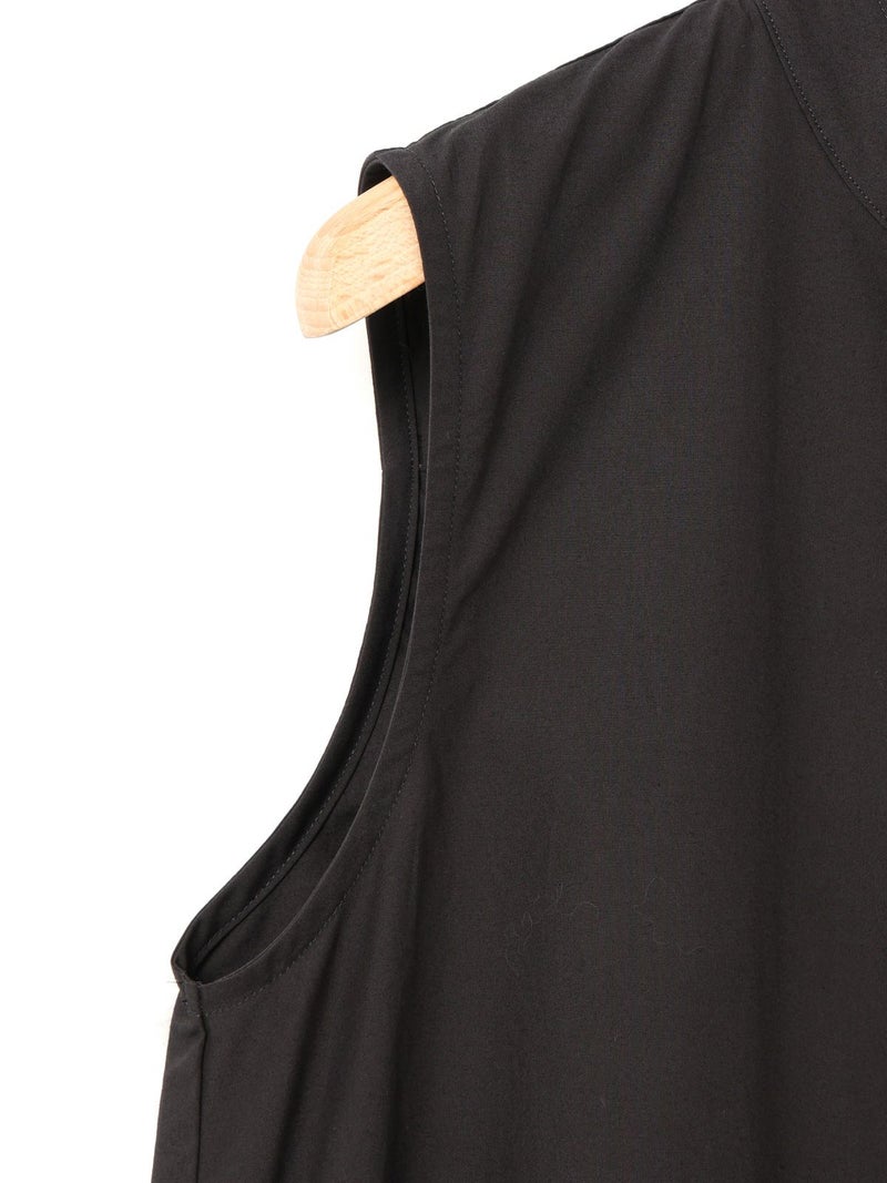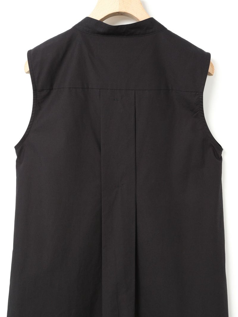 ジレとしてもスタイリングできるノーカラージレワンピースです。スッキリとしたAラインのシルエットながら前立てをあえて存在感ある太さにしボタン位置を中央よりもずらしデザイン性を加えました。また、後ろ身頃のタックをステッチで抑えワンポイントのあるバックスタイルにしています。シンプルに1枚着でもよく、デザイン性あるシャツワンピースに仕上げた1枚です。キレイ目のタイプライター素材を使用。(2-830033/オープンカラーハーフスリーブシャツと共通素材※カラー展開は異なります)。
