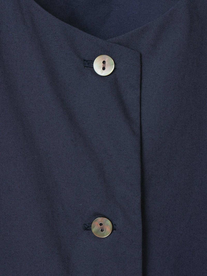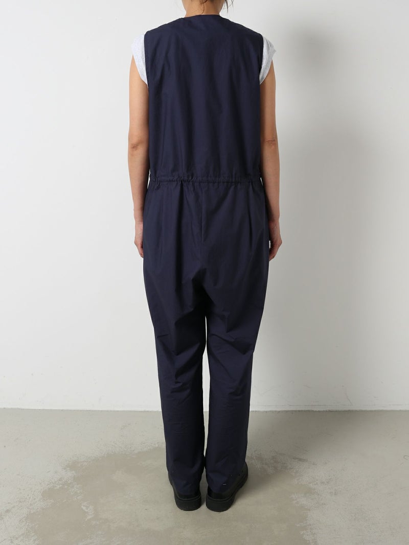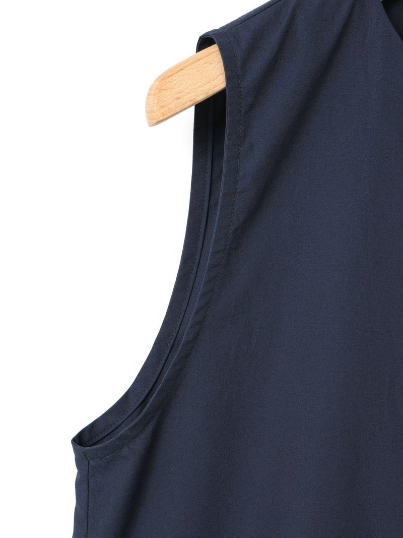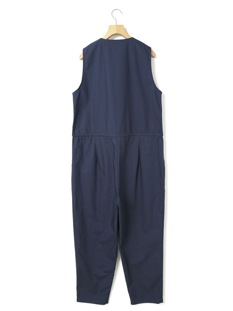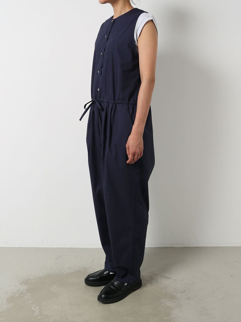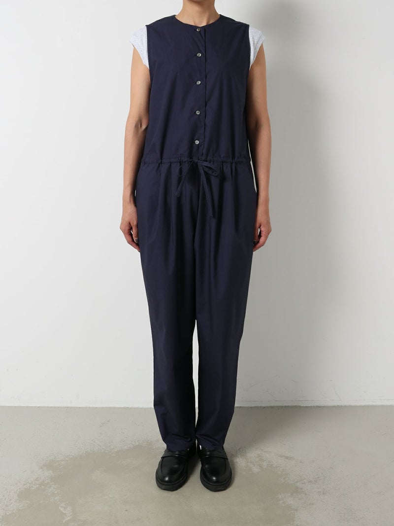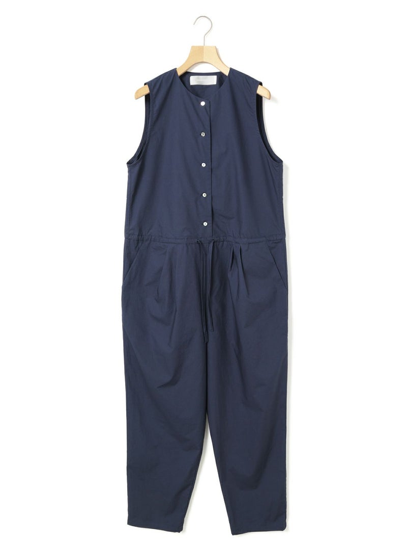24春夏で展開した2-850008 /ノースリーブオールインワンのデザインをアレンジして新登場。襟はスッキリとしたノーカラーで何にでも重ねて合わせられるようにしました。ウエストドロストの紐も細めにスッキリと見えるようにし、シンプルで飽きのこないデザインにしています。インにTシャツ等をレイヤードしても、ノースリーブで一枚着としても着用できるオールインワン。リラックス感がありながらバンドカラーでトラッドな雰囲気もあるアイテムです。上身頃のボタンをいくつか外し、紐を結んでブラウジングするラフな着こなしがオススメ。折り返しが可能な素材感及び裾巾なのでロールアップとブラウジング加減で幅広い身長の方に対応可。高密度に打ち込んだハリのある綿100%のタイプライター素材。洗い仕上げで自然なシワ感を残した風合いが特徴です。