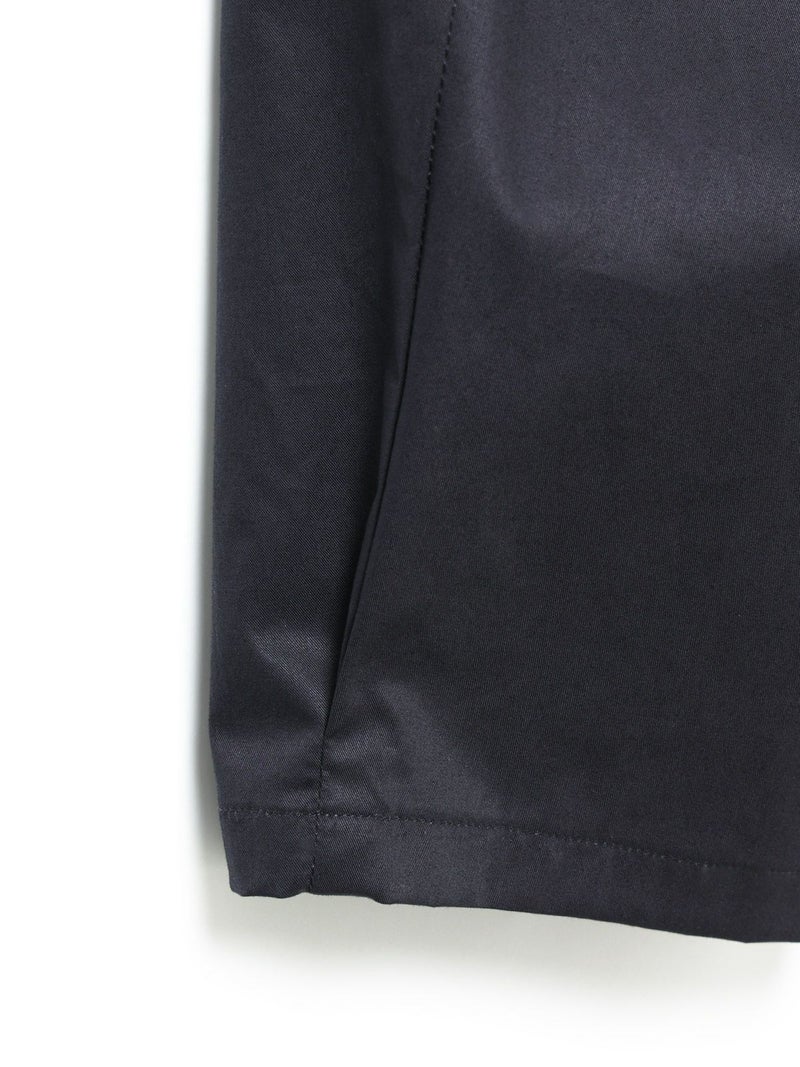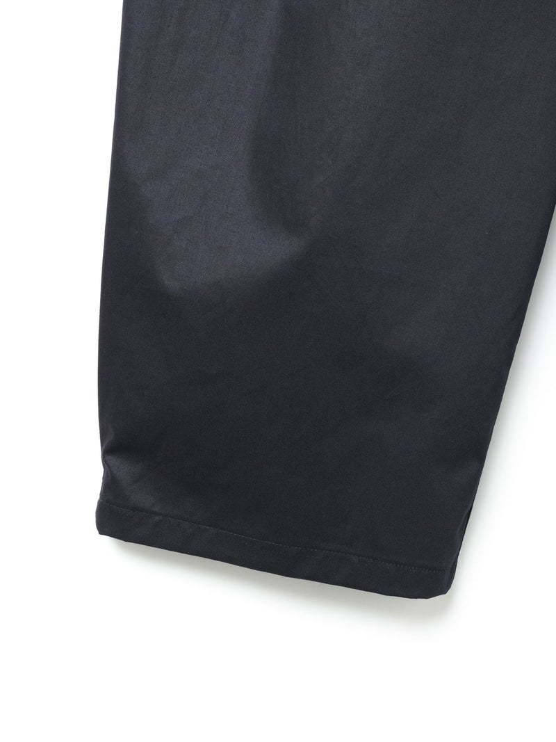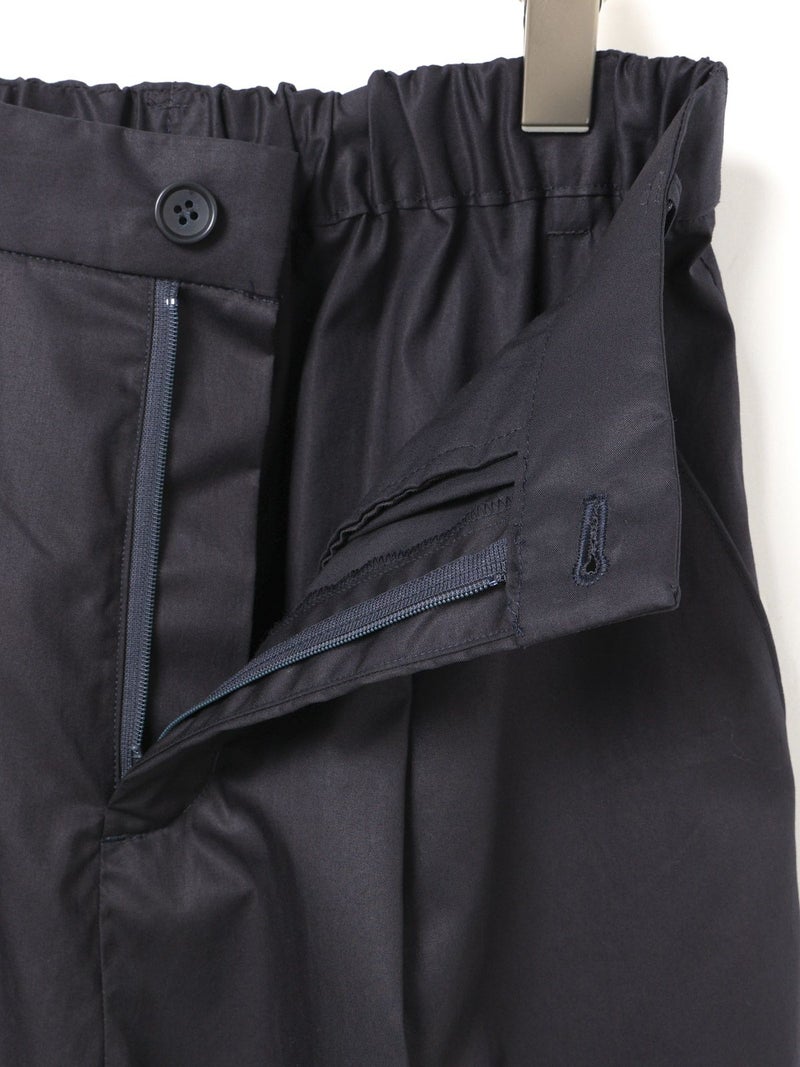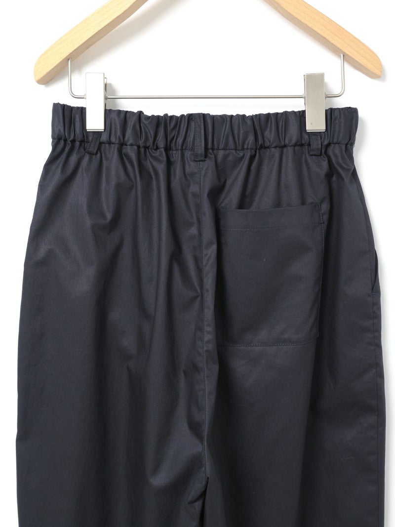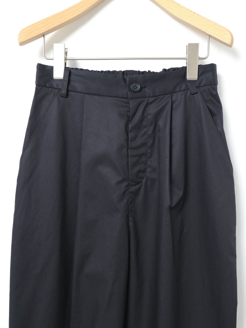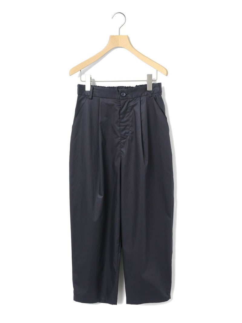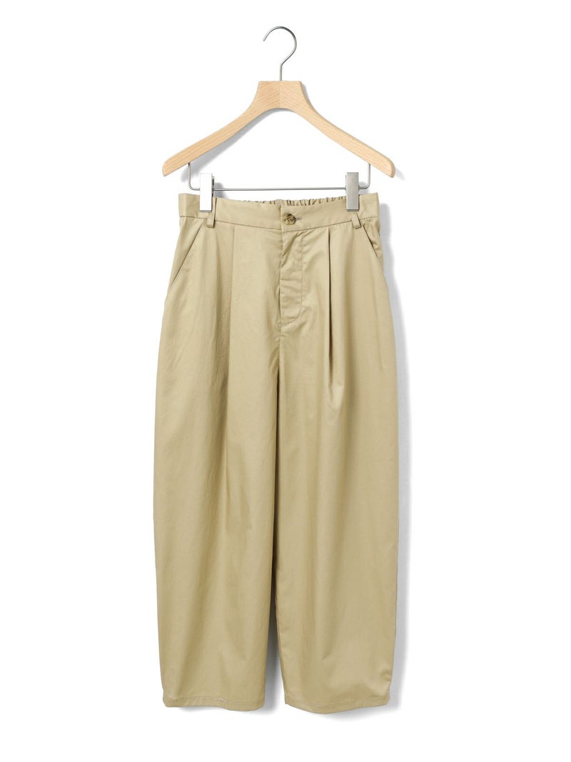 シルエットにややデザイン性をもたせたテーパードパンツ、ハイウエストアンクルパンツです。少し高めなウエスト位置がスッキリとした印象で、ヒップから裾にかけてやや丸みをつけてカーブシルエットに仕上げました。それでいて全体的にはスッキリとした印象で着用いただけるパンツです。後ろウエストはゴムになっているので着心地がラクです。さりげなく裾にタックが入っているところもデザインポイントです。中肉の少しハリ感のあるコットン100%のツイル素材を使用。シルエットの特徴を感じていただける1枚です。