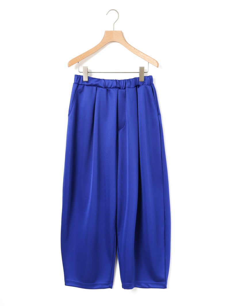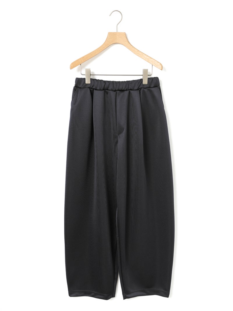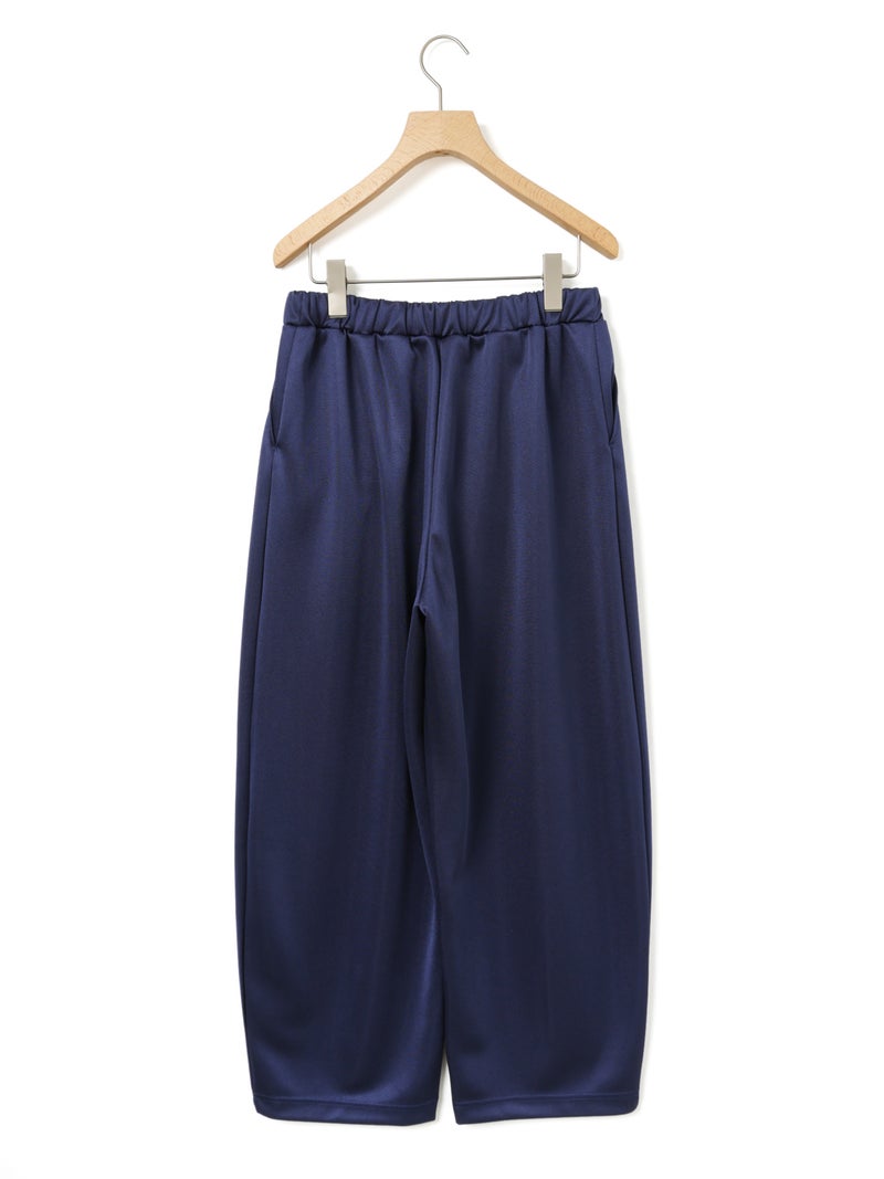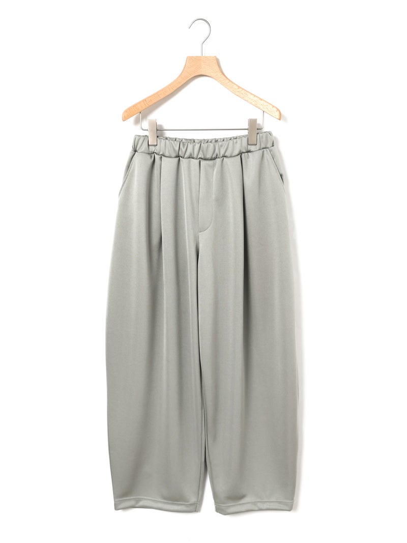 トレンドのカーブシルエットを取り入れたキレイ目なトラックパンツ、カーブレッグジャージパンツです。近年多く見られるカーブシルエットをスポーティなジャージ素材を使用して、トラックパンツに取り入れデザインしました。フロントにタックを設けることで、少しスラックスライクな印象に仕上げております。カジュアルにもキレイ目にも穿いていただける魅力的な一本です。柔らかいジャージ素材でも美しく立体的なカーブを作れるようにパターンメイクに拘りました。フルレングス設定ですが裾巾を少し小さく設定し、生地が裾に溜まるようになっているので、裾口を引きずる心配をすることなく着用いただけます。吸汗速乾性に優れ洗濯機で簡単にお手入れができるので、夏場も快適に着回しができ、一本持っておくと非常に重宝するアイテムです。