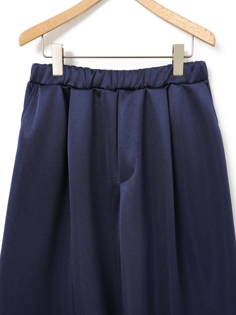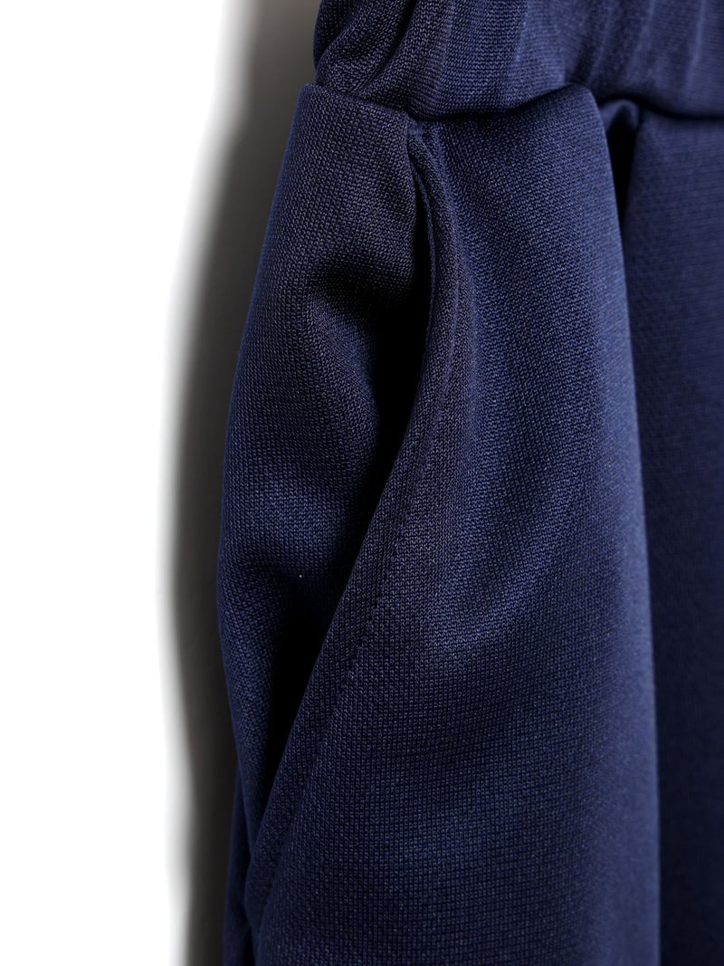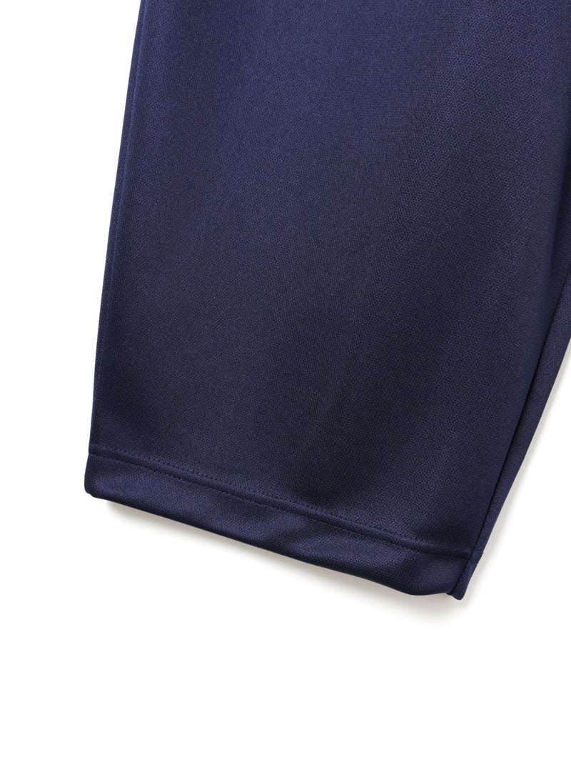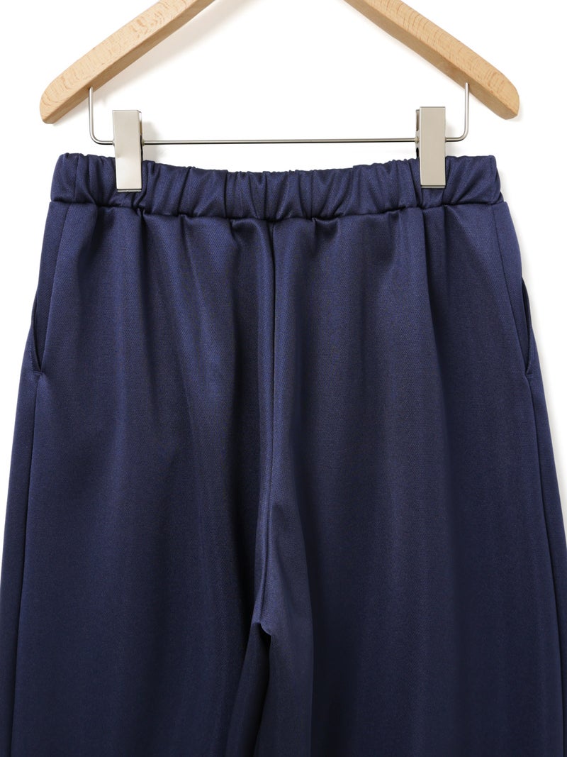 トレンドのカーブシルエットを取り入れたキレイ目なトラックパンツ、カーブレッグジャージパンツです。近年多く見られるカーブシルエットをスポーティなジャージ素材を使用して、トラックパンツに取り入れデザインしました。フロントにタックを設けることで、少しスラックスライクな印象に仕上げております。カジュアルにもキレイ目にも穿いていただける魅力的な一本です。柔らかいジャージ素材でも美しく立体的なカーブを作れるようにパターンメイクに拘りました。フルレングス設定ですが裾巾を少し小さく設定し、生地が裾に溜まるようになっているので、裾口を引きずる心配をすることなく着用いただけます。吸汗速乾性に優れ洗濯機で簡単にお手入れができるので、夏場も快適に着回しができ、一本持っておくと非常に重宝するアイテムです。