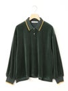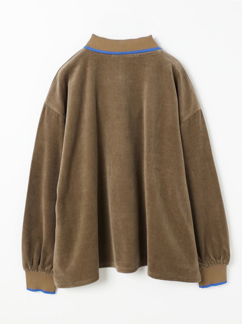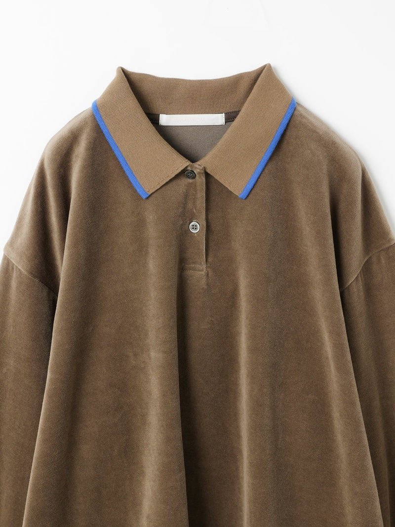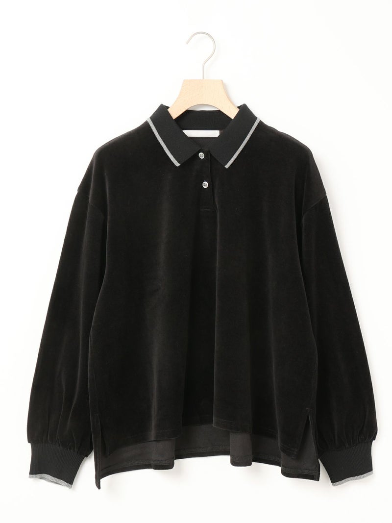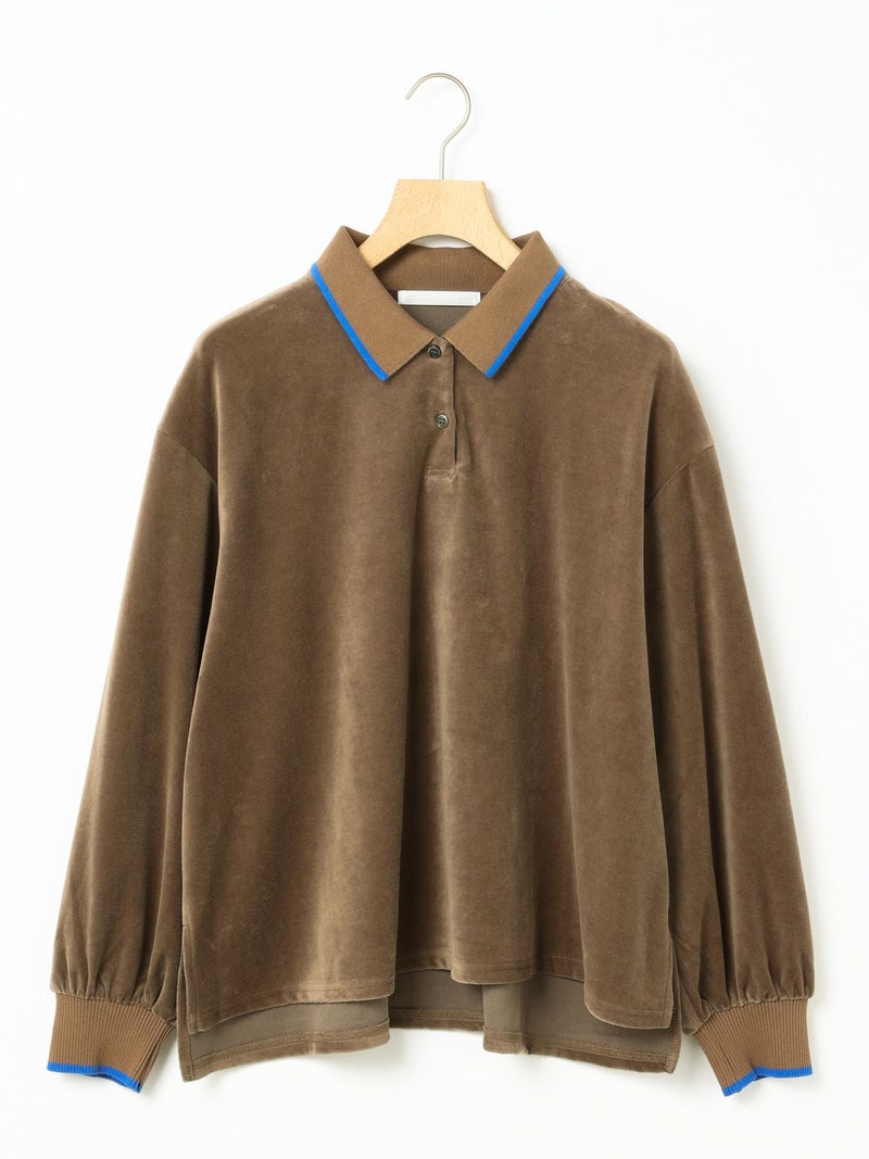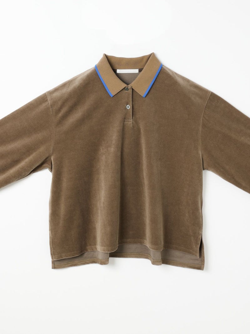 ワイドシルエットのポロシャツに編み立て襟と袖口に配したユニホームライクなラインカラーがアクセントになったラインポロプルオーバー。ベージュ×ブルー、グリーン×イエロー、ブラック×グレー。袖口はフィット感のあるリブ使い。リラックスしたサイズ感でカジュアルになりすぎないのがポイント。起毛素材特有のソフトな風合いを出しつつ、裏面のポリエステルで適度な張り感を残した心地いいベロア素材を使用。裾は若干の前後差を付けたサイドスリット入り。(3-810013/ラインポロワンピースと同素材)。どこか懐かしさのある1枚です。