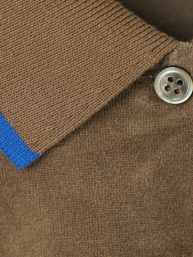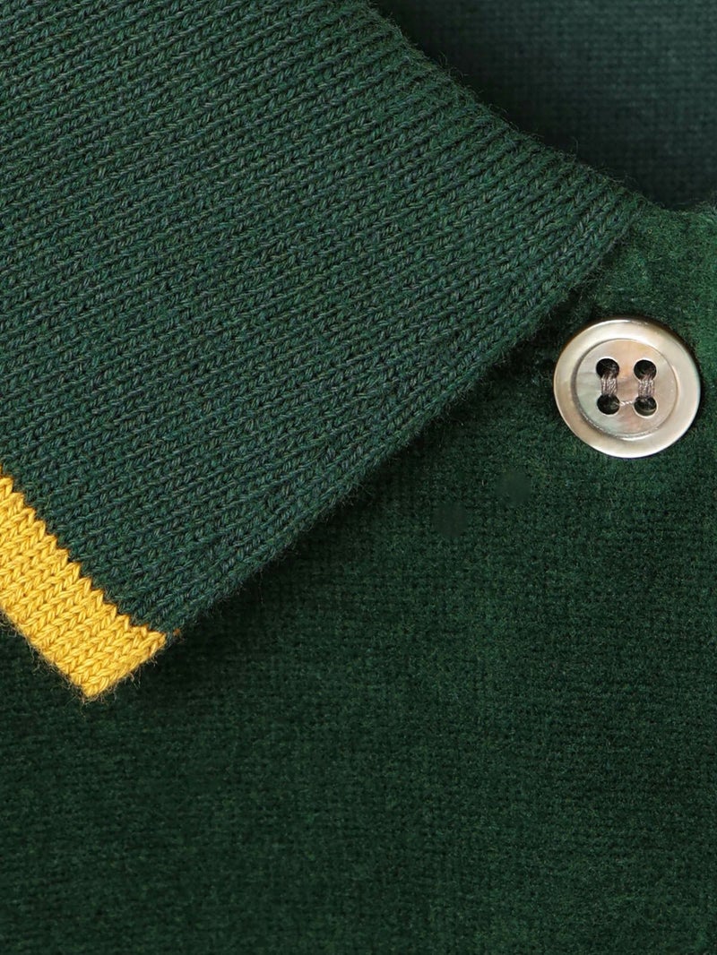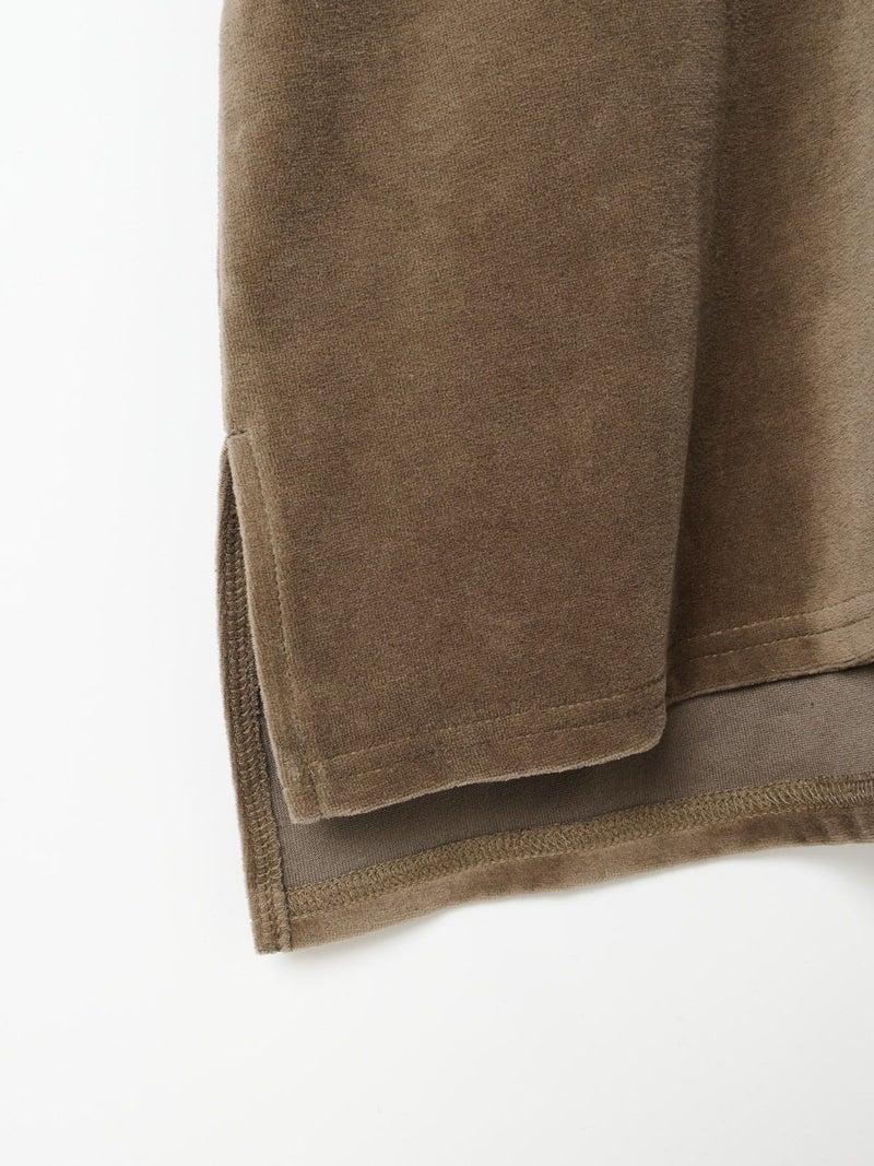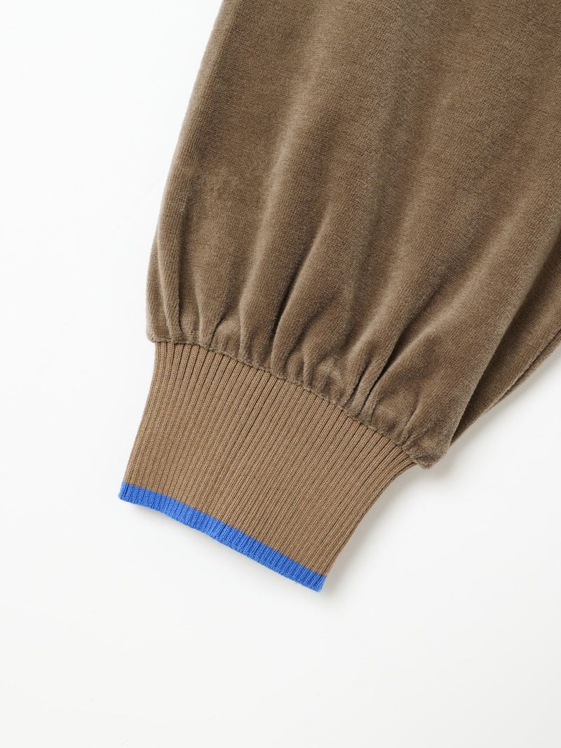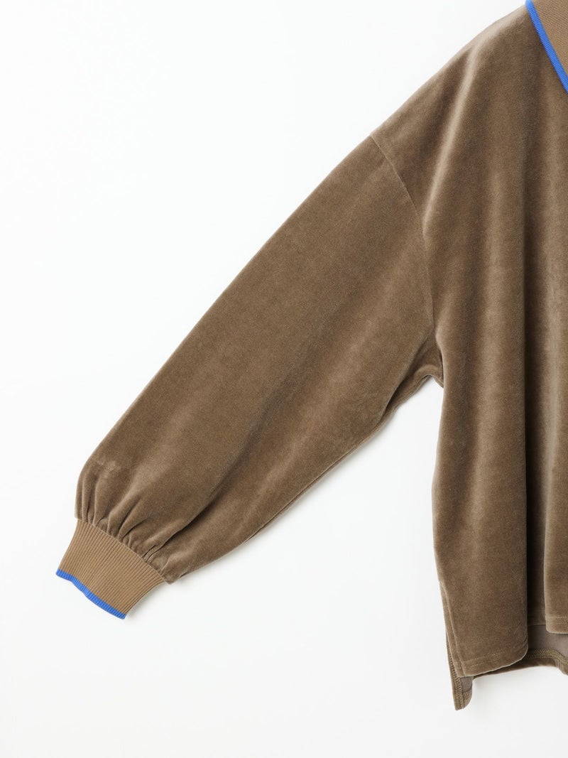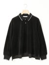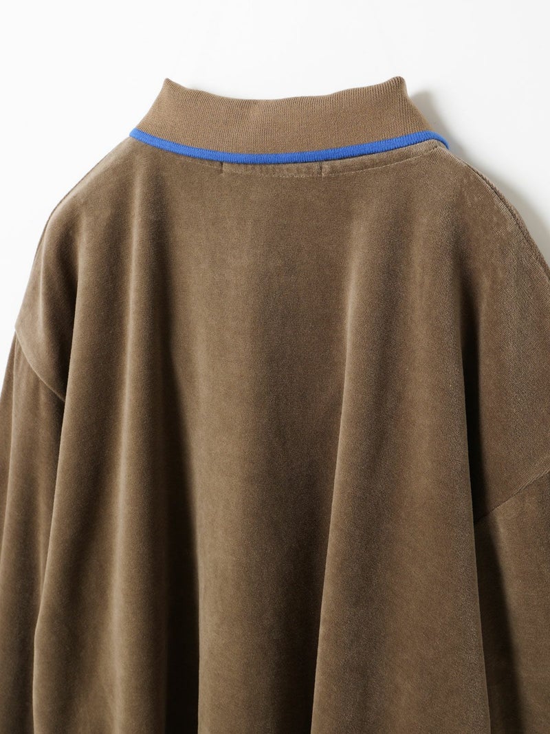 ワイドシルエットのポロシャツに編み立て襟と袖口に配したユニホームライクなラインカラーがアクセントになったラインポロプルオーバー。ベージュ×ブルー、グリーン×イエロー、ブラック×グレー。袖口はフィット感のあるリブ使い。リラックスしたサイズ感でカジュアルになりすぎないのがポイント。起毛素材特有のソフトな風合いを出しつつ、裏面のポリエステルで適度な張り感を残した心地いいベロア素材を使用。裾は若干の前後差を付けたサイドスリット入り。(3-810013/ラインポロワンピースと同素材)。どこか懐かしさのある1枚です。