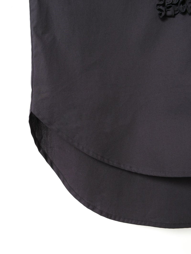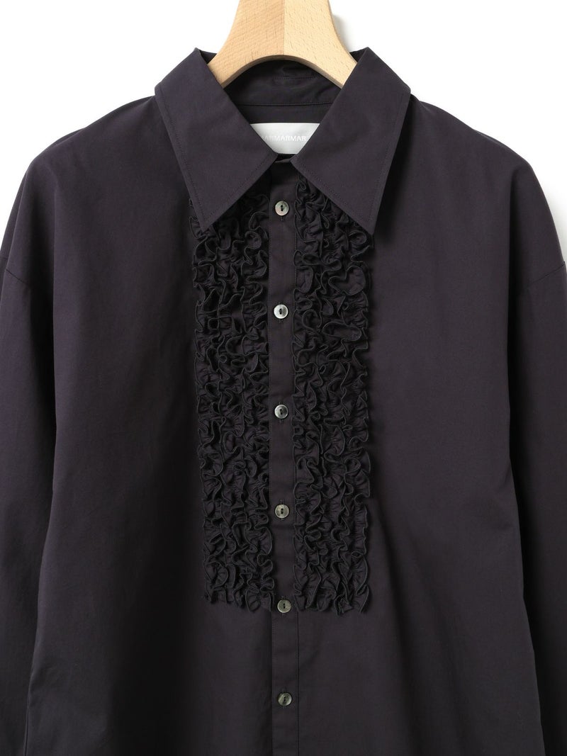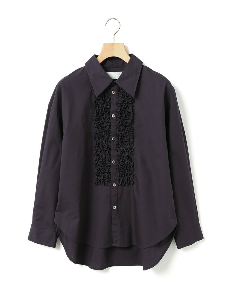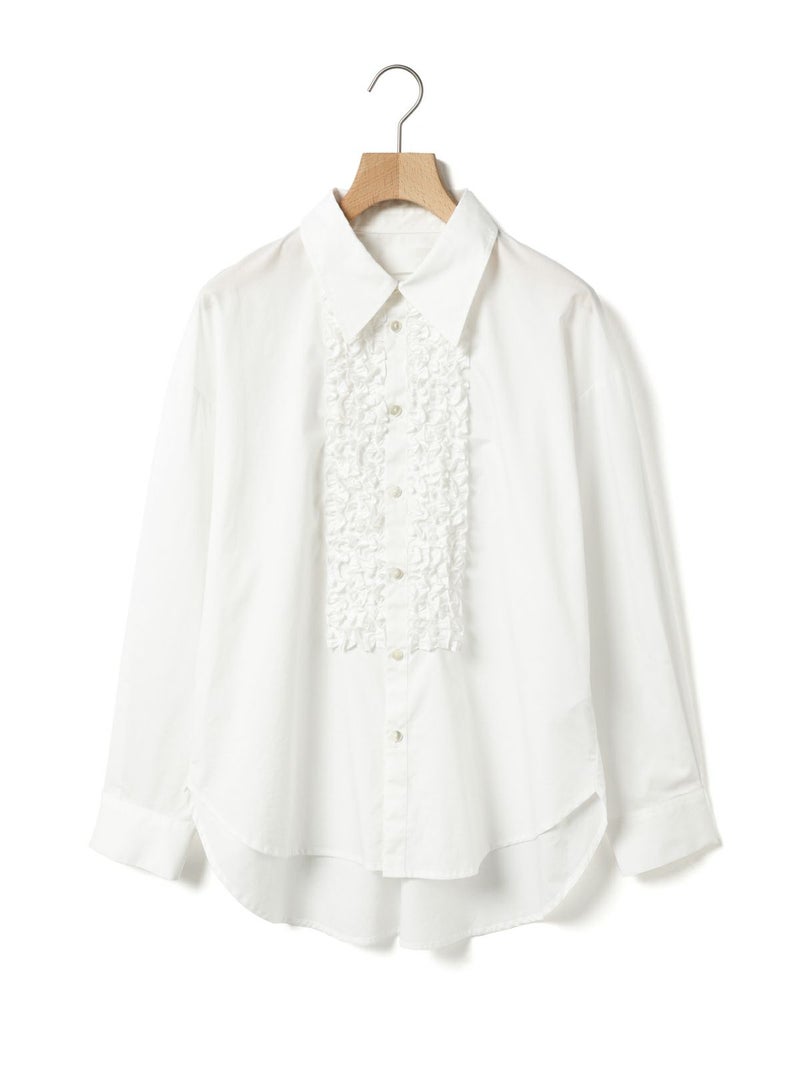 身生地で立体的に作られたフロントのフリルが目を引くフリルドレスシャツです。シャツのシルエットはシンプルに着やすいサイズ感になっており、キレイ目にもカジュアルにも合わせやすく仕上げています。クラシックなイメージのあるシャツなのでややフォーマルな装いにも使え、またデニムやカジュアルパンツに合わせることでミックス感のあるスタイリングも楽しめるアイテムです。