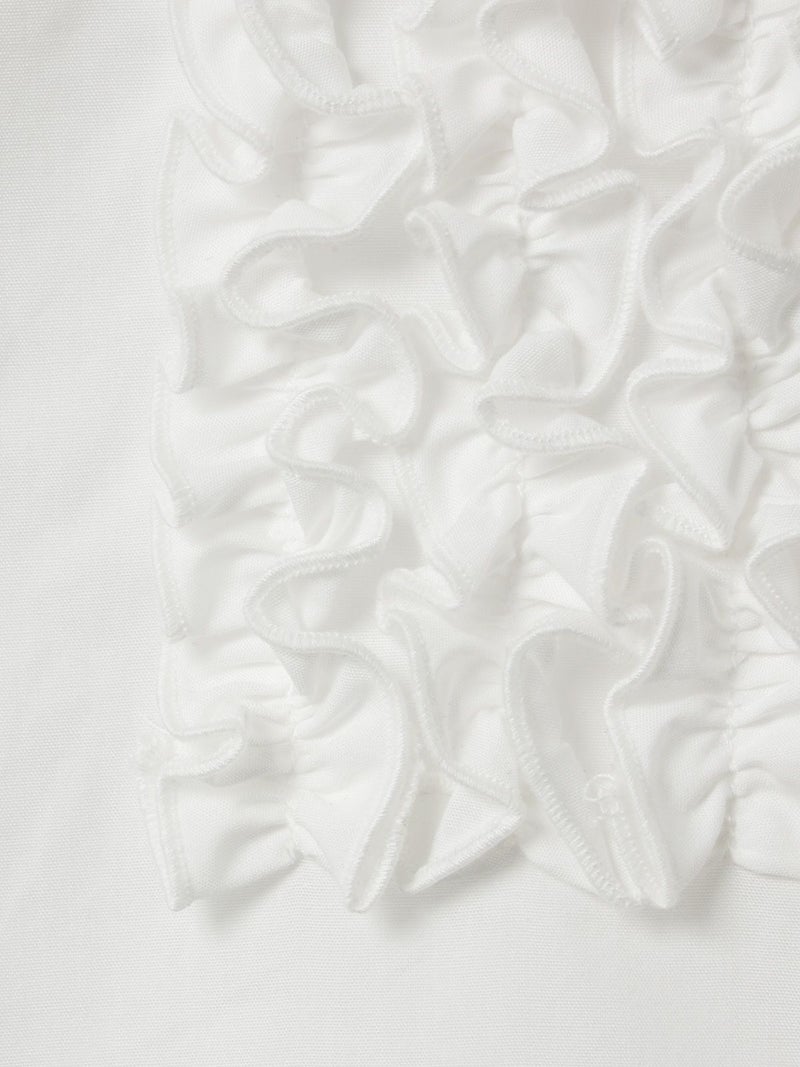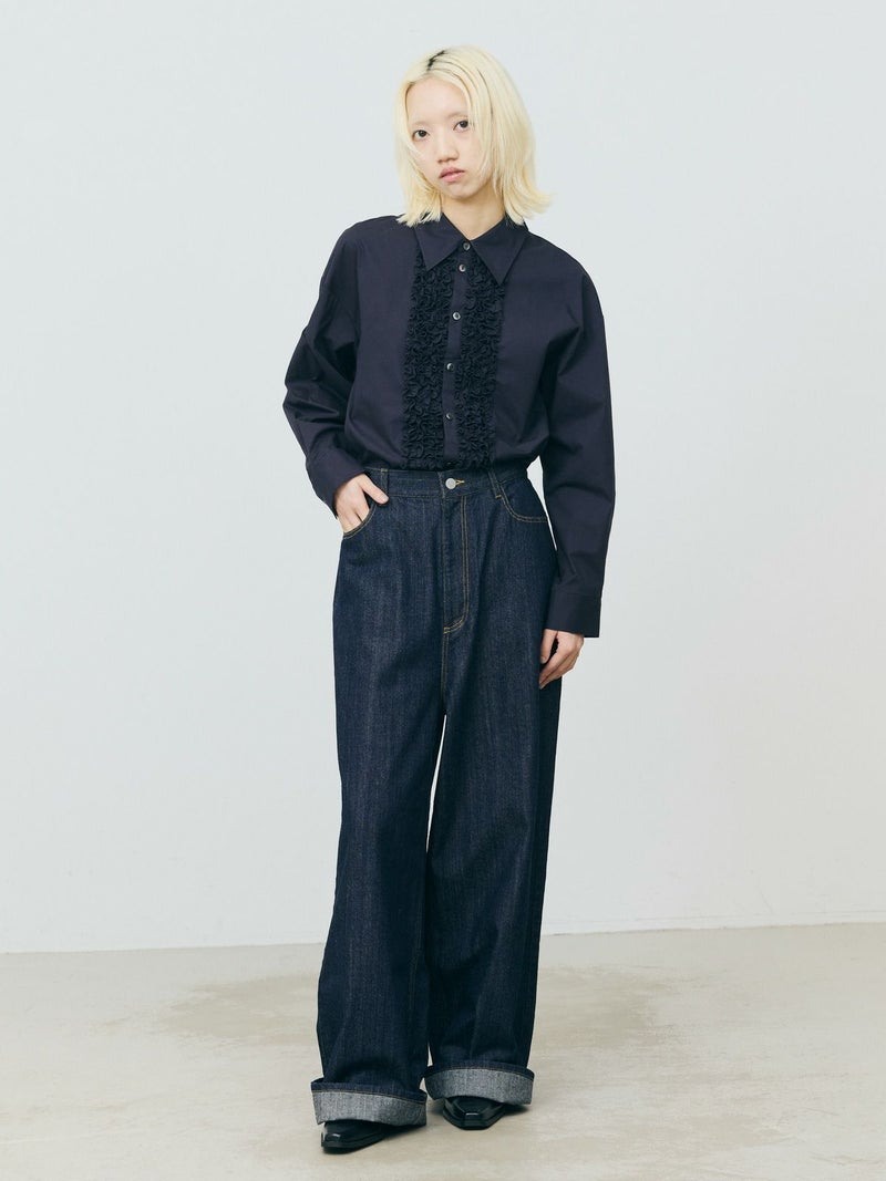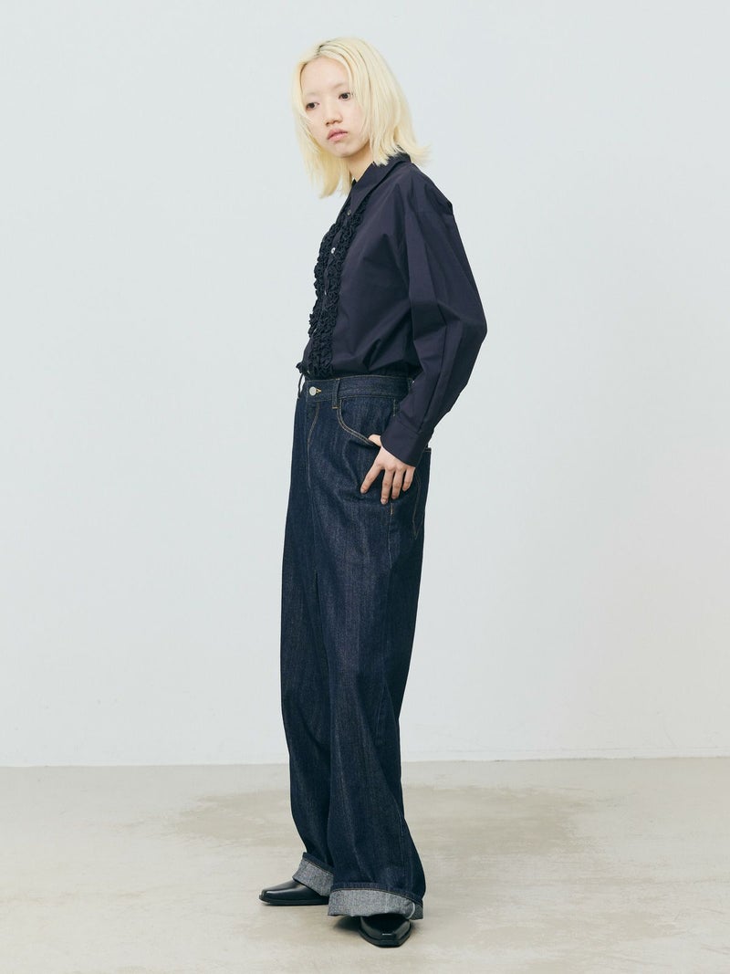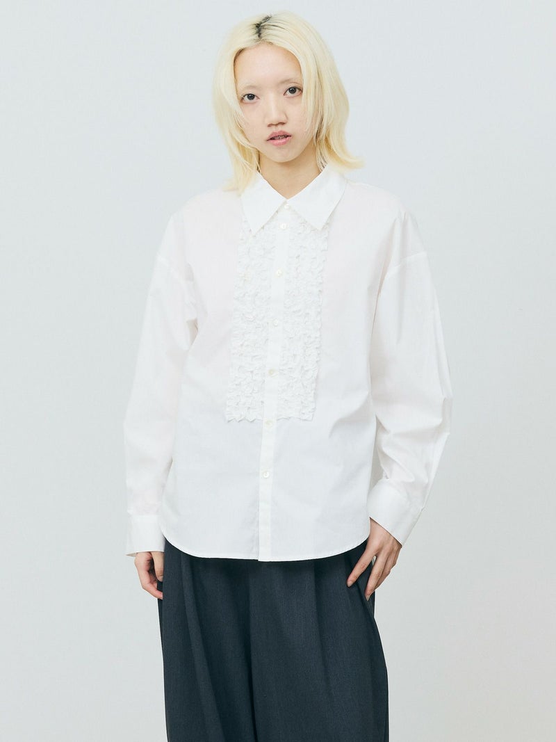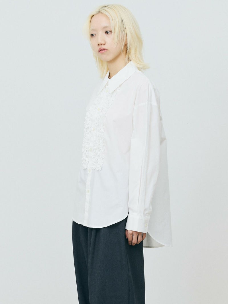 身生地で立体的に作られたフロントのフリルが目を引くフリルドレスシャツです。シャツのシルエットはシンプルに着やすいサイズ感になっており、キレイ目にもカジュアルにも合わせやすく仕上げています。クラシックなイメージのあるシャツなのでややフォーマルな装いにも使え、またデニムやカジュアルパンツに合わせることでミックス感のあるスタイリングも楽しめるアイテムです。