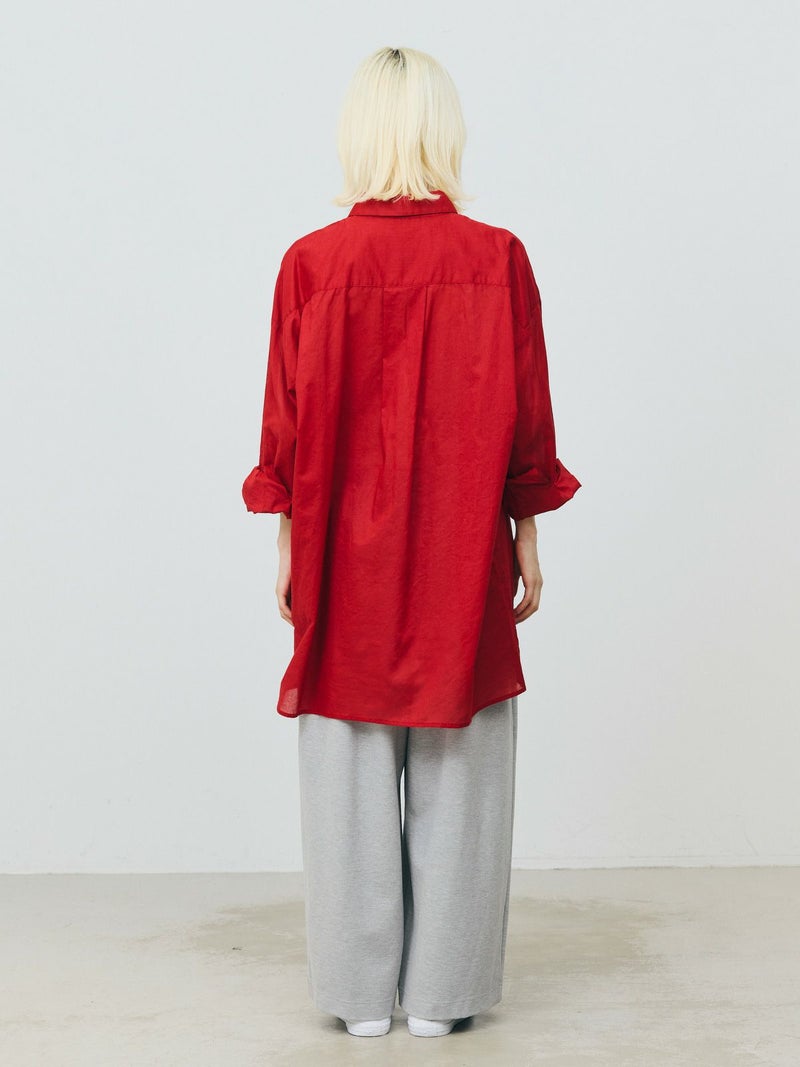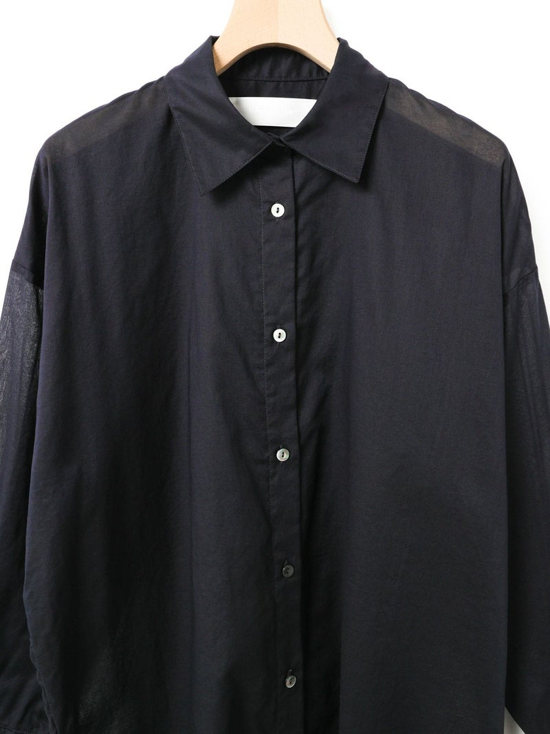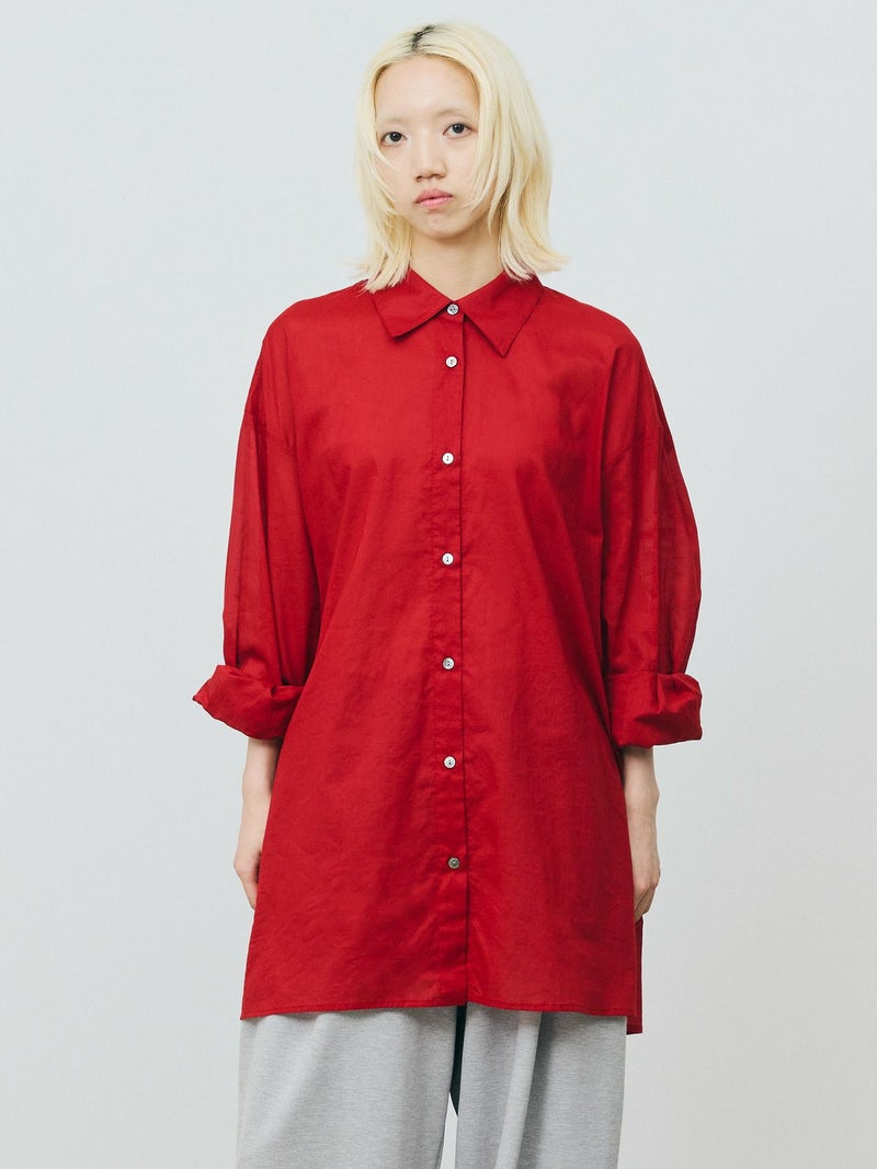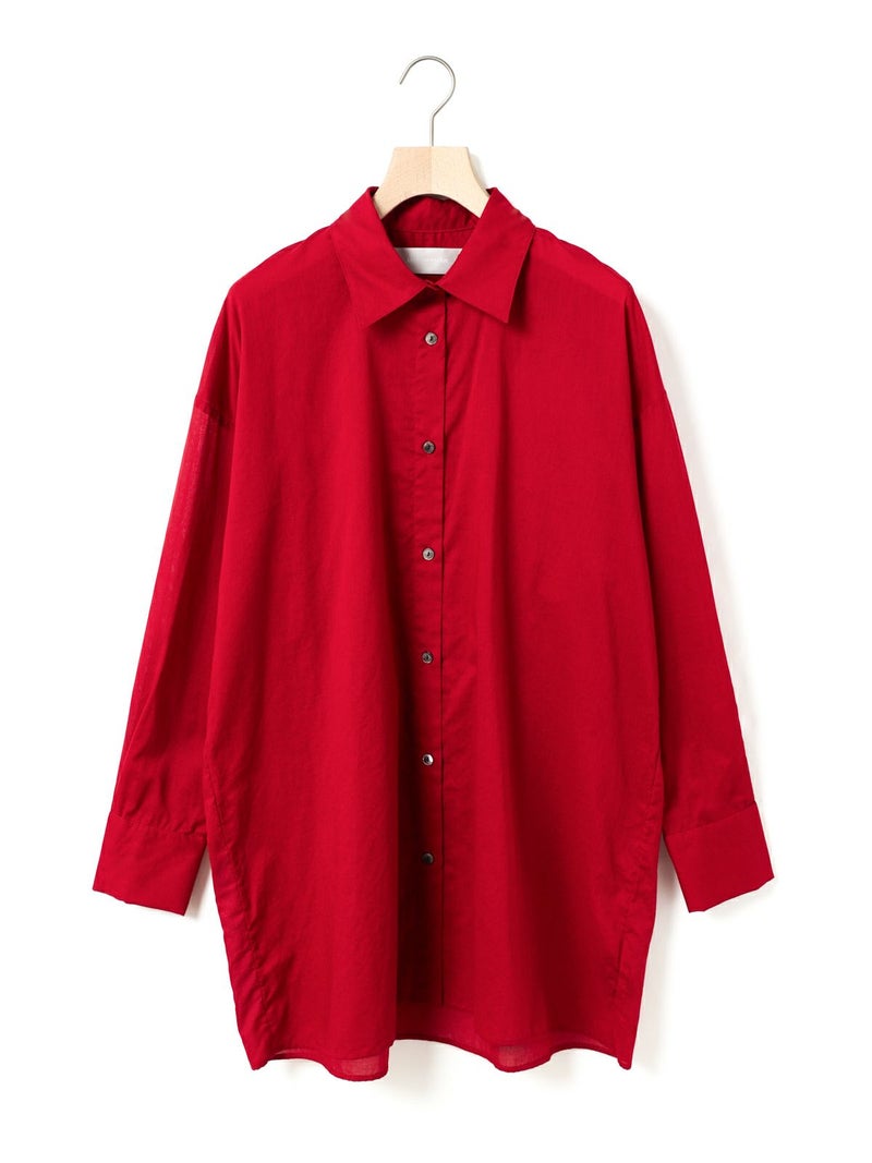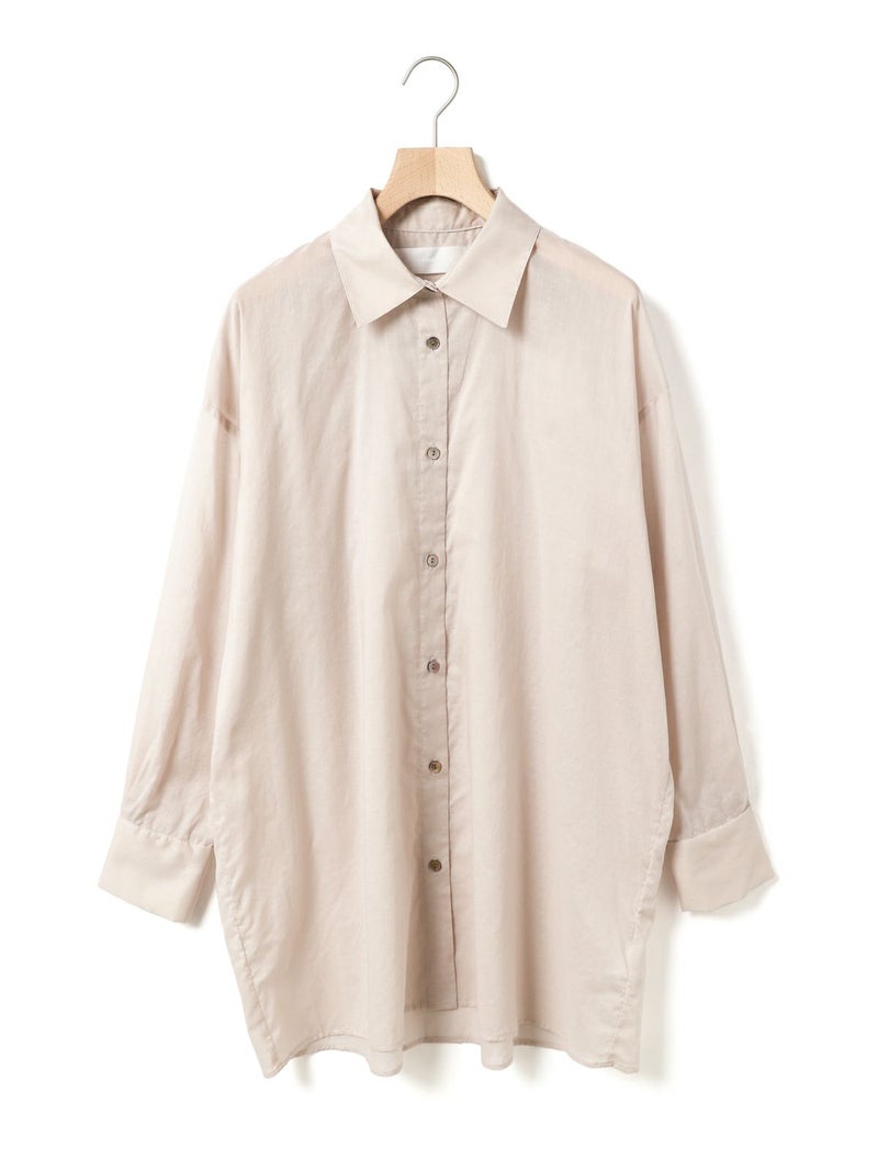 長い期間で色々なスタイリングを楽しめるシアー素材のシャツの提案です。暑さが残る時期には軽く羽織って涼しく着ていただけるシアーワイドシャツ。冷房や日除け対策としても使い勝手が良いシャツで、シアー素材ならではのレイヤードスタイルもオススメです。上にニットやベストなどを合わせてもらうと素材のコントラストが素敵なコーディネートを演出。シンプルなシャツなので、デザインポイントにカフスの釦調整が可能なディテールを入れています。