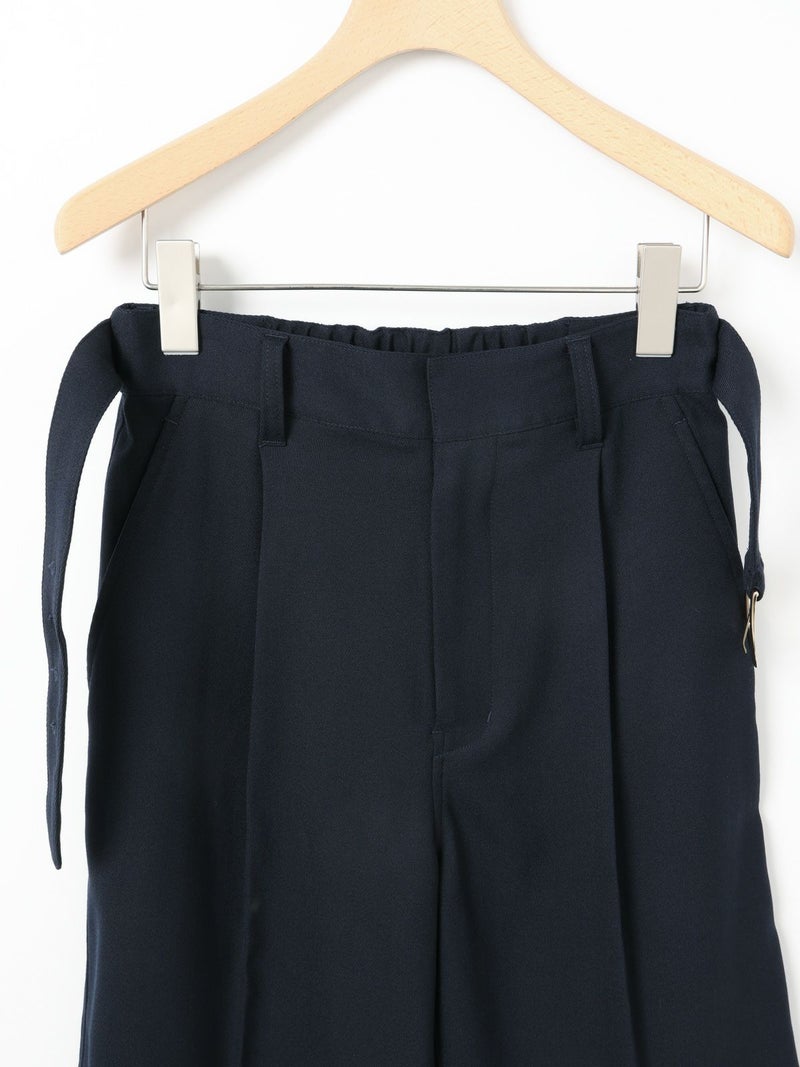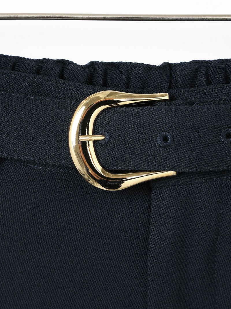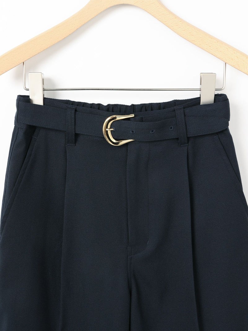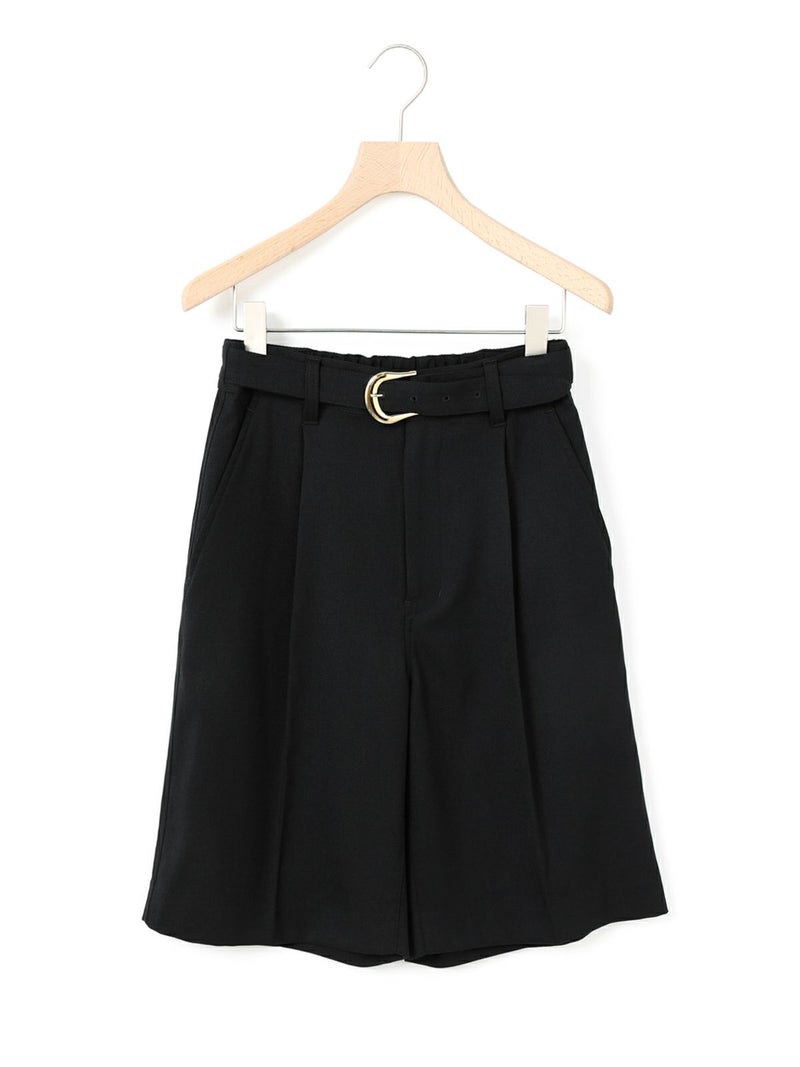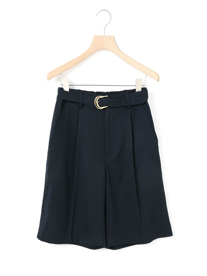 ブレザーとセットアップで着られるショートスラックス。ブレザー(3-870014)とのセットアップでの提案で、単純なショートスラックスにはせずこだわりを持たせたデザインに仕上げました。ブレザーの一番のアイキャッチーポイントでもある金ボタンを合わせ、金色をスラックスにもいやらしくなく取り入れた1枚。アイビーやトラッド感を増し、尚且つデザインのポイントになるよう共地のベルトにホースシュー型のゴールドバックルを付けポイントに。※ホースシューとは馬蹄。乗馬やポロはアイビーやトラッドにとても密接で親和性もあります。そのカタチのバックルが付いたショートスラックスはブレザーの組下にピッタリ。膝丈のワンタックのクリース付き、少しゆったりとしたシルエットが特徴。生地:バージンウールsuper100'sとレーヨンのブレンドにポリエステルをプラスすることでウォッシャブルを可能にしたクリアな綾目がクラシカルでメンズライクなトリコチン素材。※素材自体は洗えますが、デザインの特性上、センタープレスが消えた際のアイロンが困難なため、洗濯表記はドライにしております。