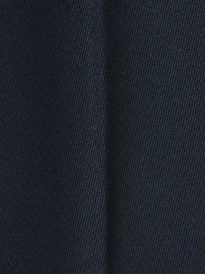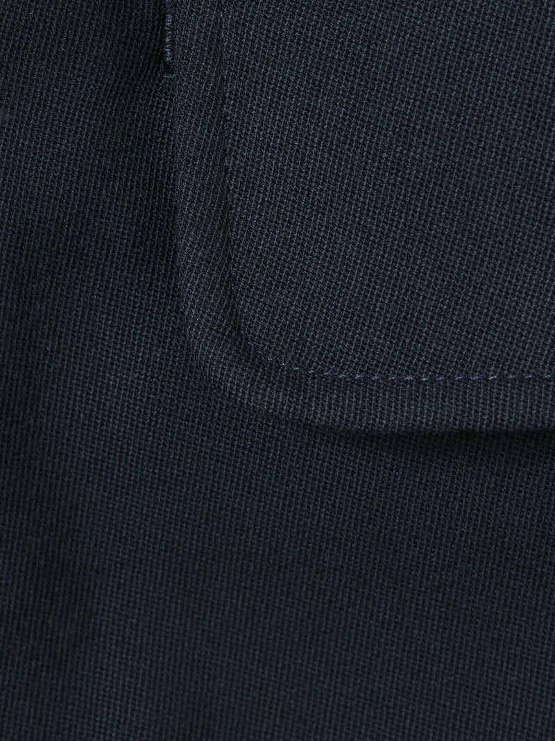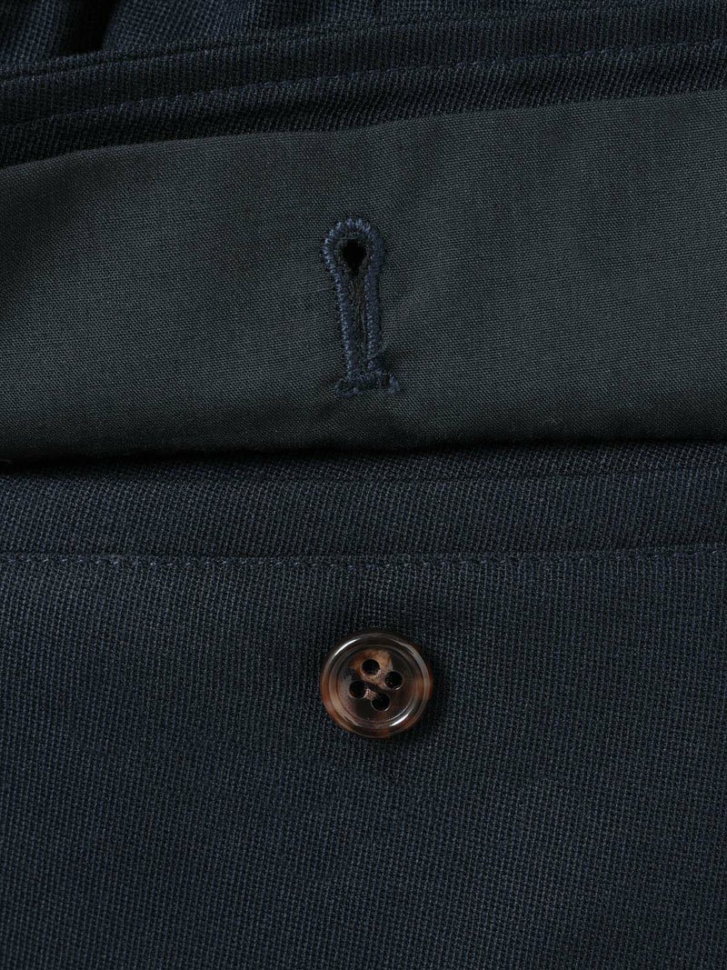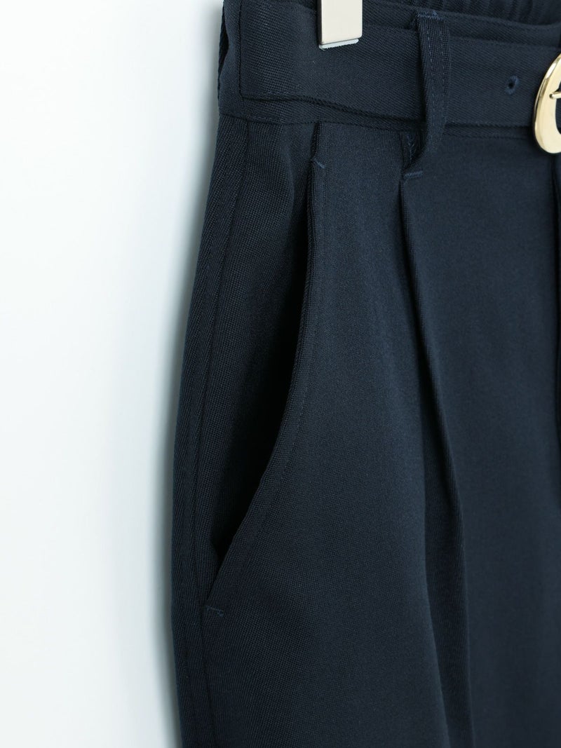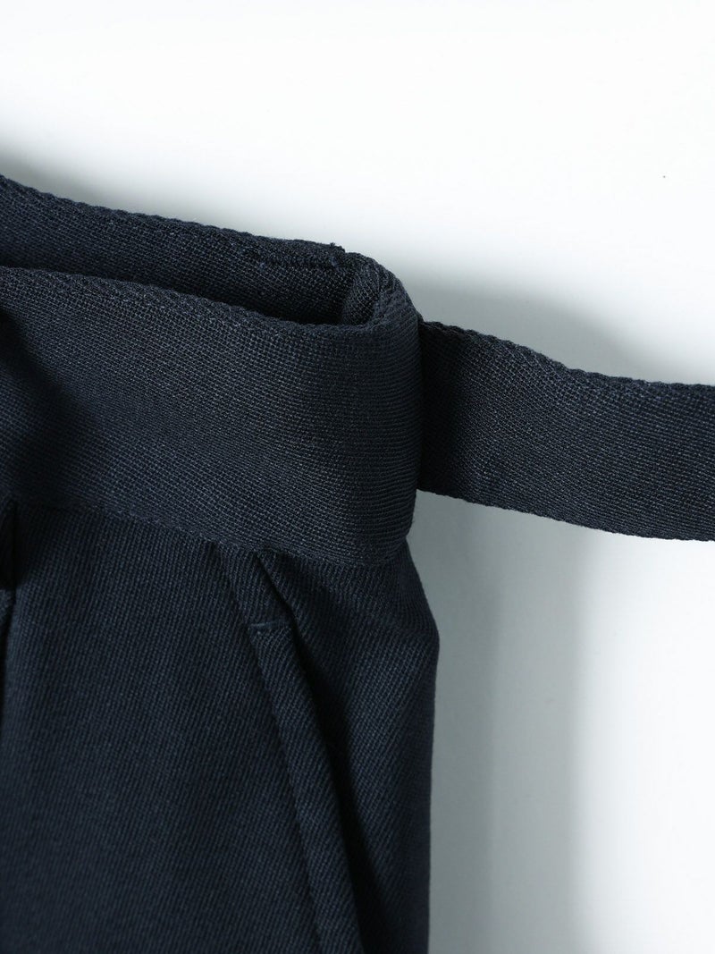 ブレザーとセットアップで着られるショートスラックス。ブレザー(3-870014)とのセットアップでの提案で、単純なショートスラックスにはせずこだわりを持たせたデザインに仕上げました。ブレザーの一番のアイキャッチーポイントでもある金ボタンを合わせ、金色をスラックスにもいやらしくなく取り入れた1枚。アイビーやトラッド感を増し、尚且つデザインのポイントになるよう共地のベルトにホースシュー型のゴールドバックルを付けポイントに。※ホースシューとは馬蹄。乗馬やポロはアイビーやトラッドにとても密接で親和性もあります。そのカタチのバックルが付いたショートスラックスはブレザーの組下にピッタリ。膝丈のワンタックのクリース付き、少しゆったりとしたシルエットが特徴。生地:バージンウールsuper100'sとレーヨンのブレンドにポリエステルをプラスすることでウォッシャブルを可能にしたクリアな綾目がクラシカルでメンズライクなトリコチン素材。※素材自体は洗えますが、デザインの特性上、センタープレスが消えた際のアイロンが困難なため、洗濯表記はドライにしております。