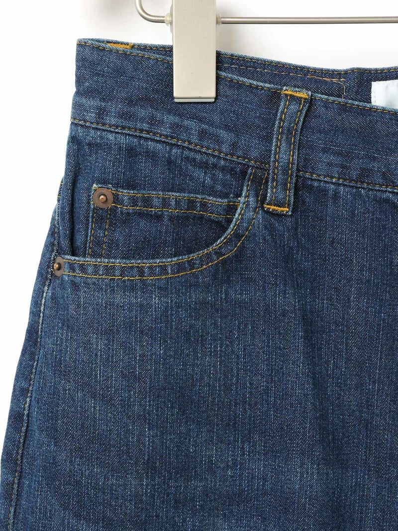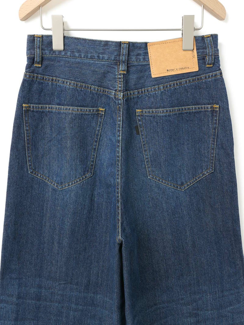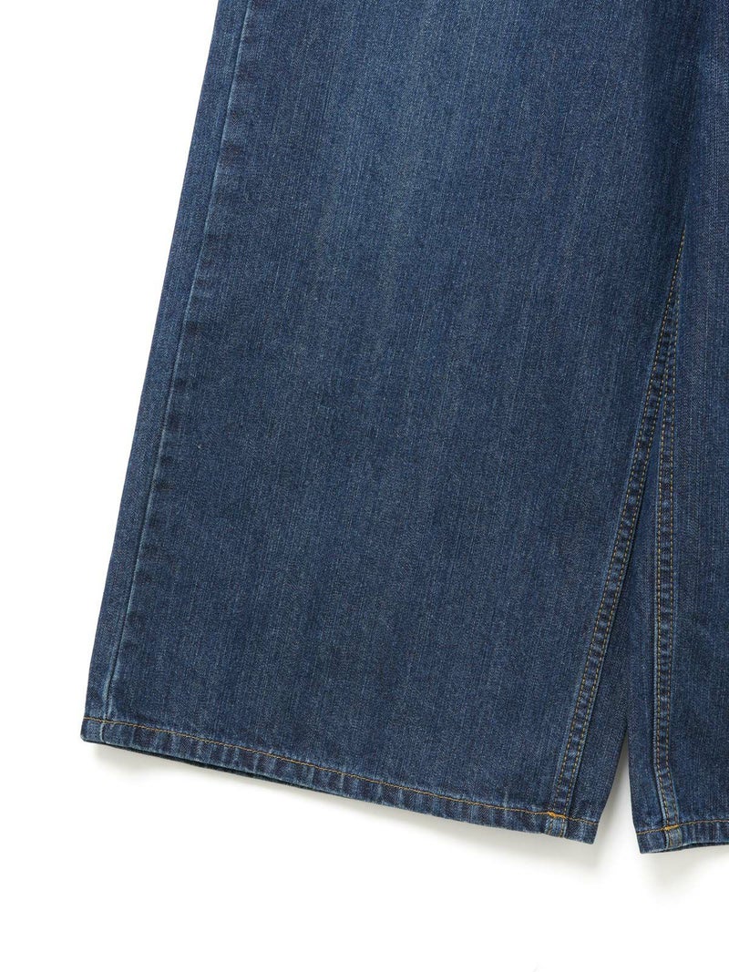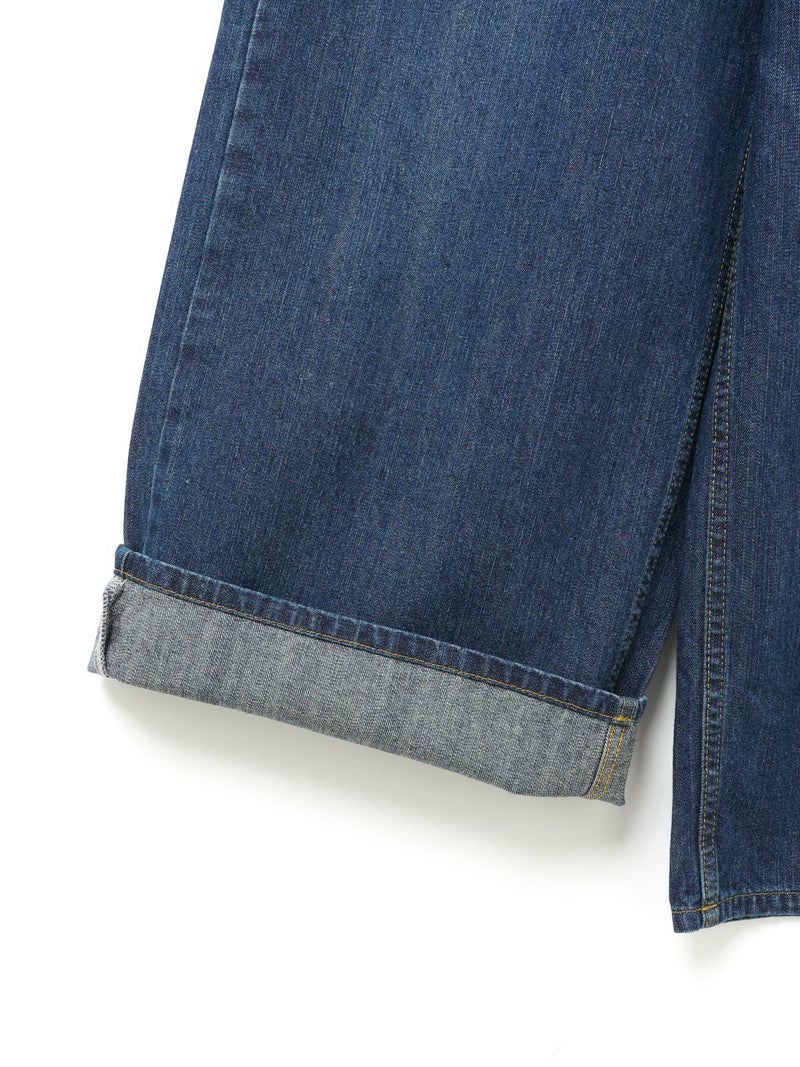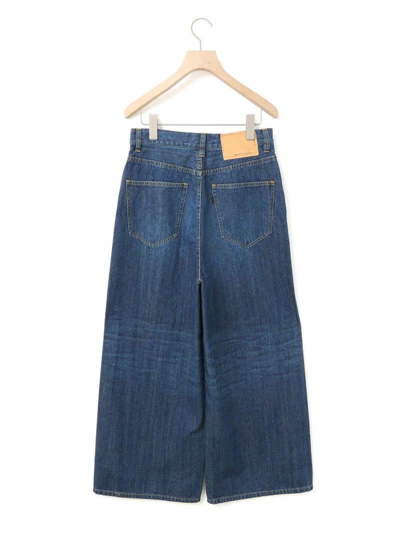 メンズっぽさのあるワイドシルエットが特徴のワイドデニムです。腰の位置を2wayで設定しています。ウエスト寸は腰で留まるくらいのゆとりが少しあるサイズ設定。ローウエストでメンズのデニムを穿いているようなダボっとさが魅力です。股上を長く設定しており、ベルトで留めてハイウエストで着ることができ、ハイウエストで着た時はローウエストとはまた違ったシルエットになり今季らしいハイウエストシルエットを表現。ハイウエストで着用したときにワンクッションあるくらいの着丈設定ですので、お好みでロールアップや丈バランスを楽しんでいただけます。10OZ デニムを使用(※定番デニムよりやや薄い生地感となっています)