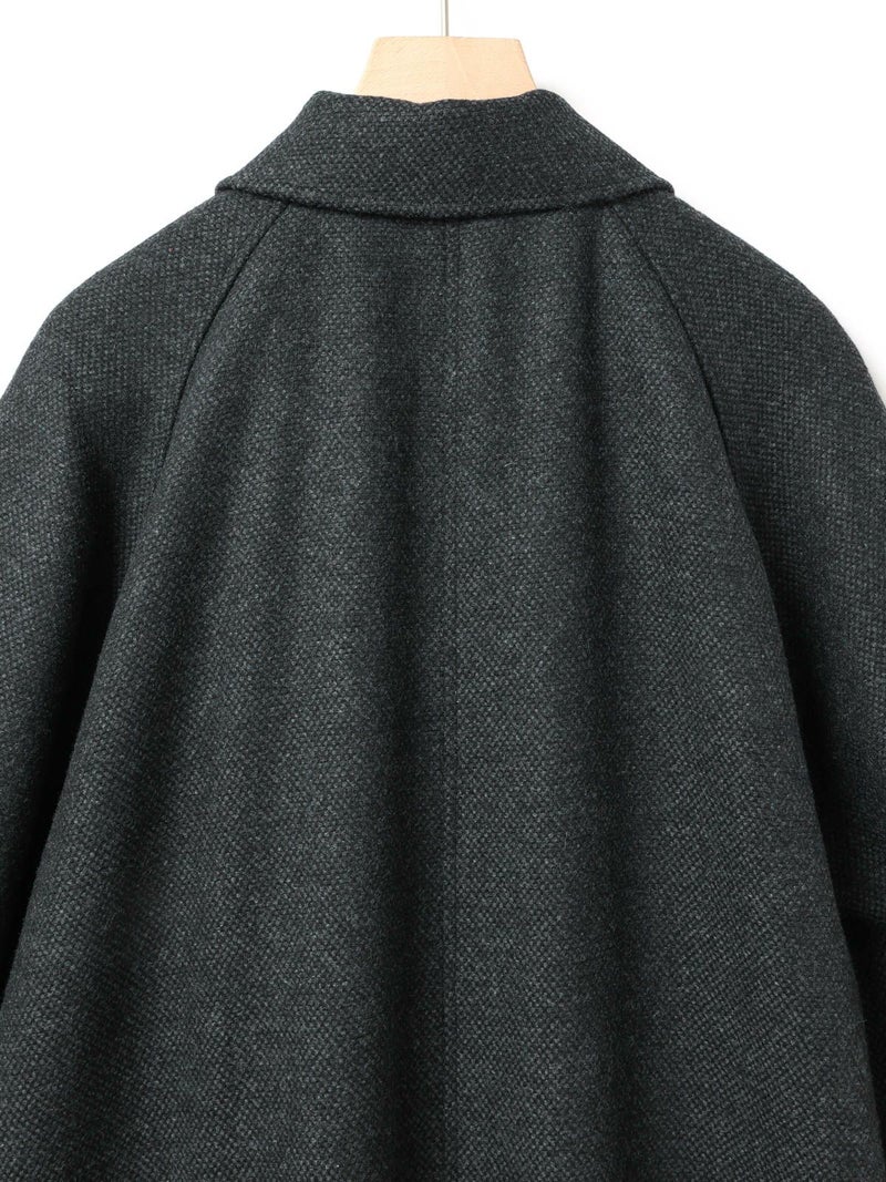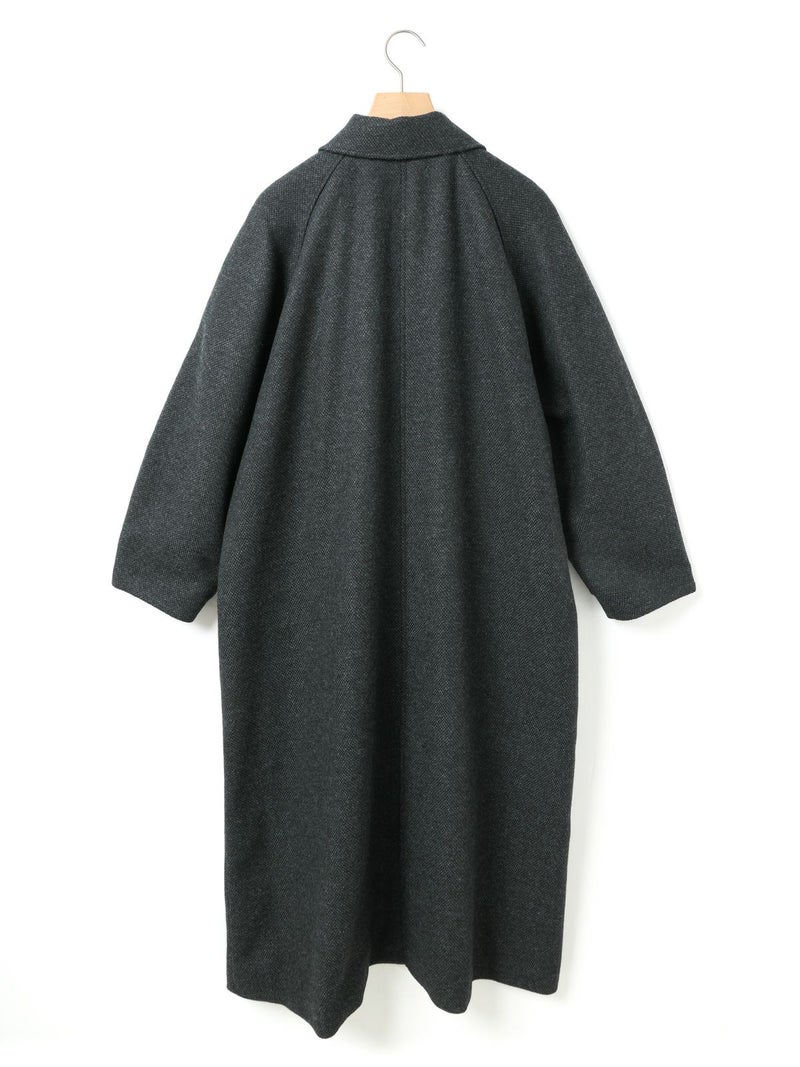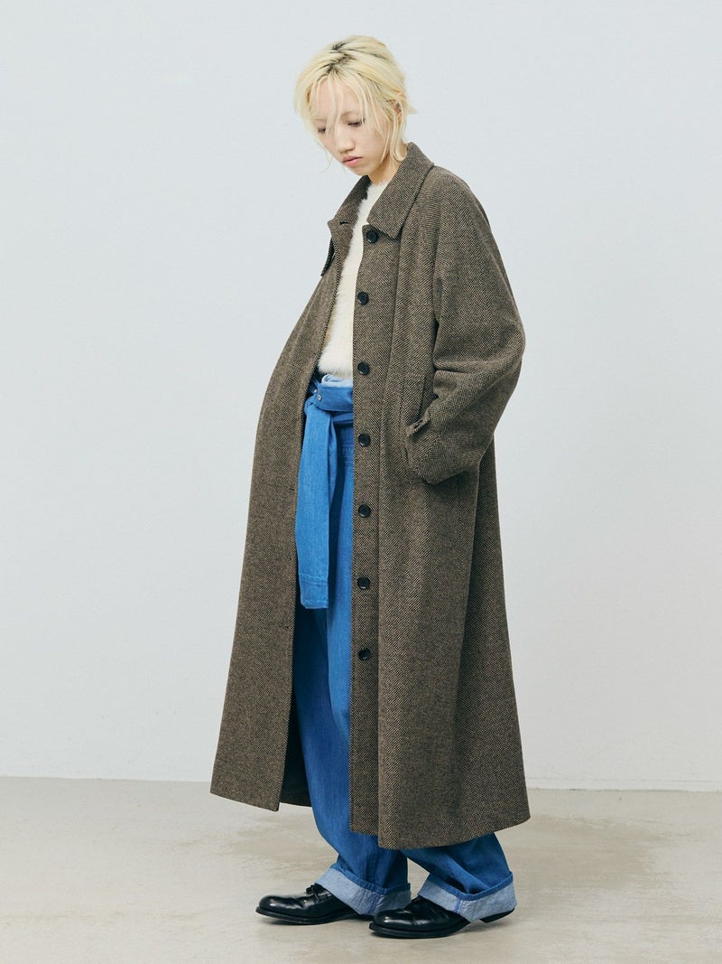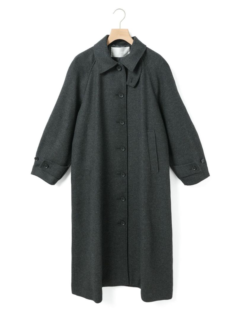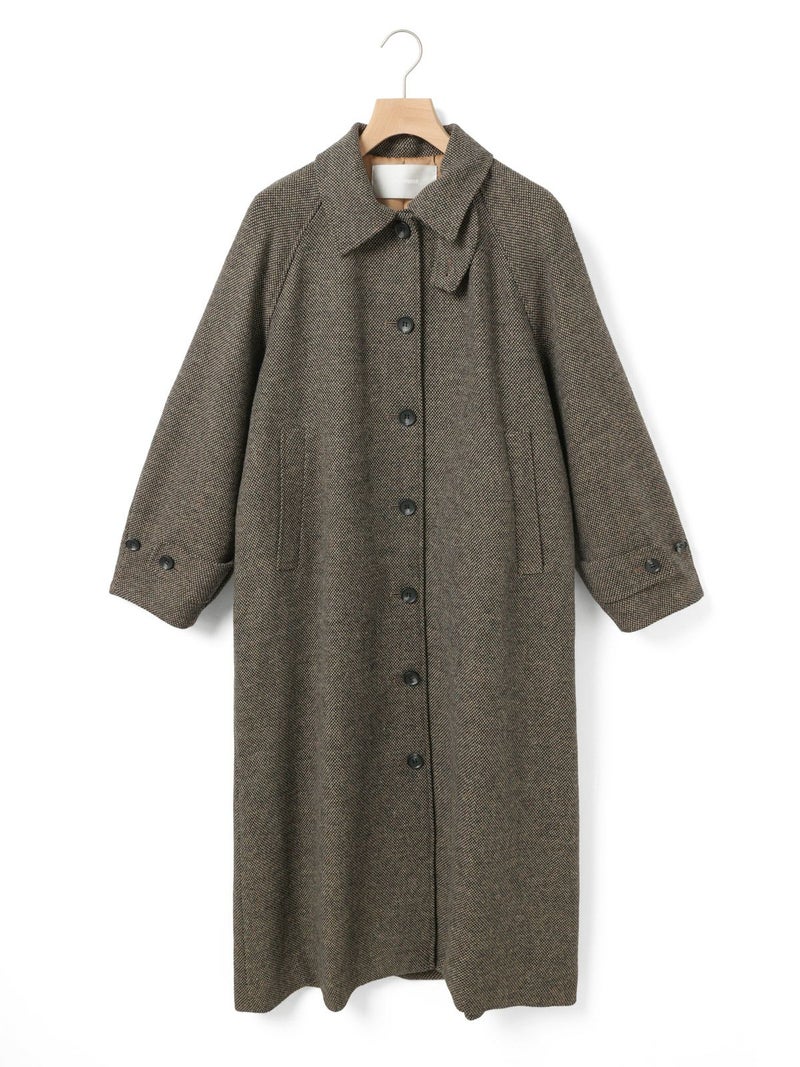 ツイード調の生地を一から作り、その柄と生地の軽さに拘ってデザインしたバルマカーンコートです。大人っぽいロングコートにしているため、生地の重さを何度も調節し、縦長なラインがキレイに出る様シルエットの調整にも注意をしました。全体的には縦長のすっきりとしたシルエットでありながら、ラグランスリーブの袖まわりはゆったりと丸みが出る袖にしています。そのため、中にニットやスウェットなどボリュームのあるアイテムとも合わせやすくなっています。チンストラップはトラッドなコートのワンポイントになっており、取り外し可能。ボリュームのある袖の形状を楽しめる様、袖口をボタンでサイズ調整ができるようにしています。ロングをお探しの方にはお勧めのアウターです。