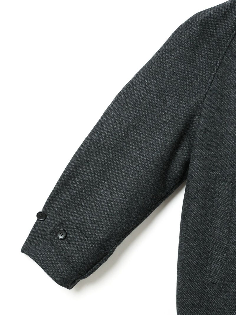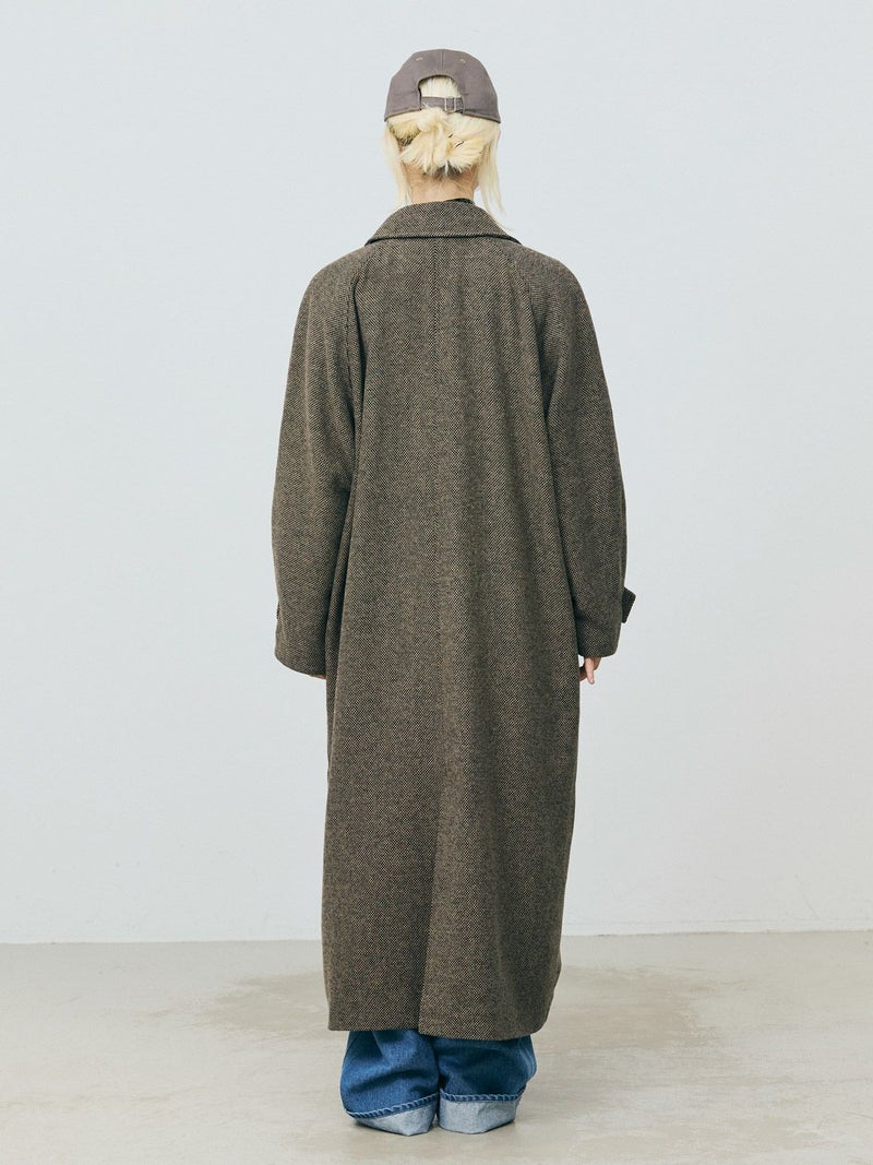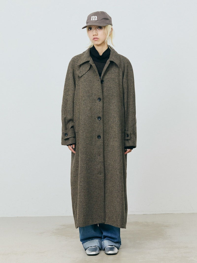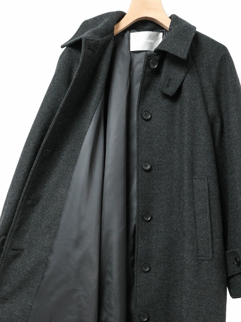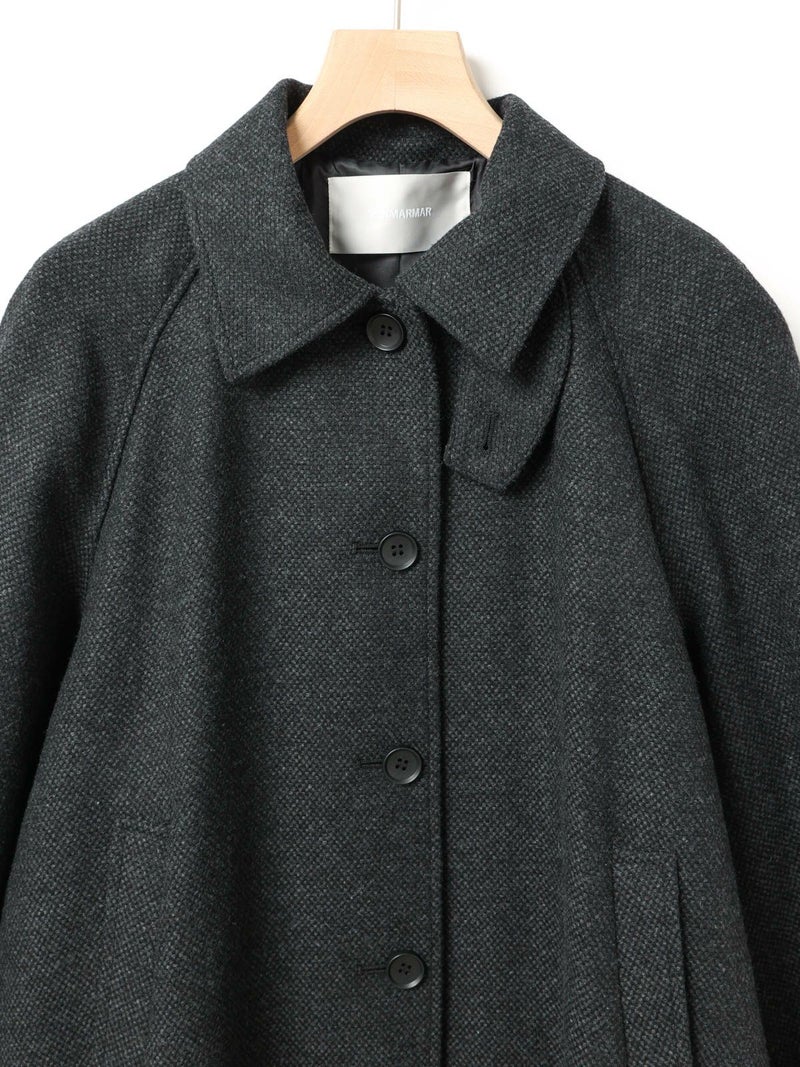 ツイード調の生地を一から作り、その柄と生地の軽さに拘ってデザインしたバルマカーンコートです。大人っぽいロングコートにしているため、生地の重さを何度も調節し、縦長なラインがキレイに出る様シルエットの調整にも注意をしました。全体的には縦長のすっきりとしたシルエットでありながら、ラグランスリーブの袖まわりはゆったりと丸みが出る袖にしています。そのため、中にニットやスウェットなどボリュームのあるアイテムとも合わせやすくなっています。チンストラップはトラッドなコートのワンポイントになっており、取り外し可能。ボリュームのある袖の形状を楽しめる様、袖口をボタンでサイズ調整ができるようにしています。ロングをお探しの方にはお勧めのアウターです。