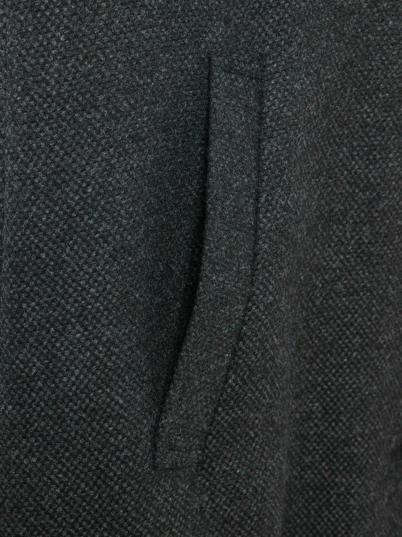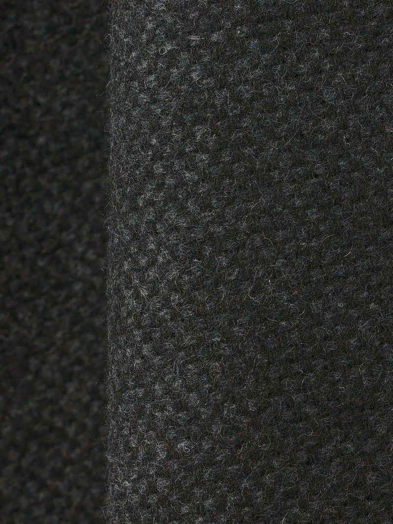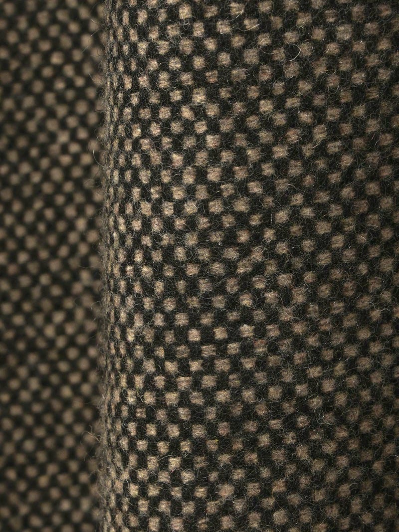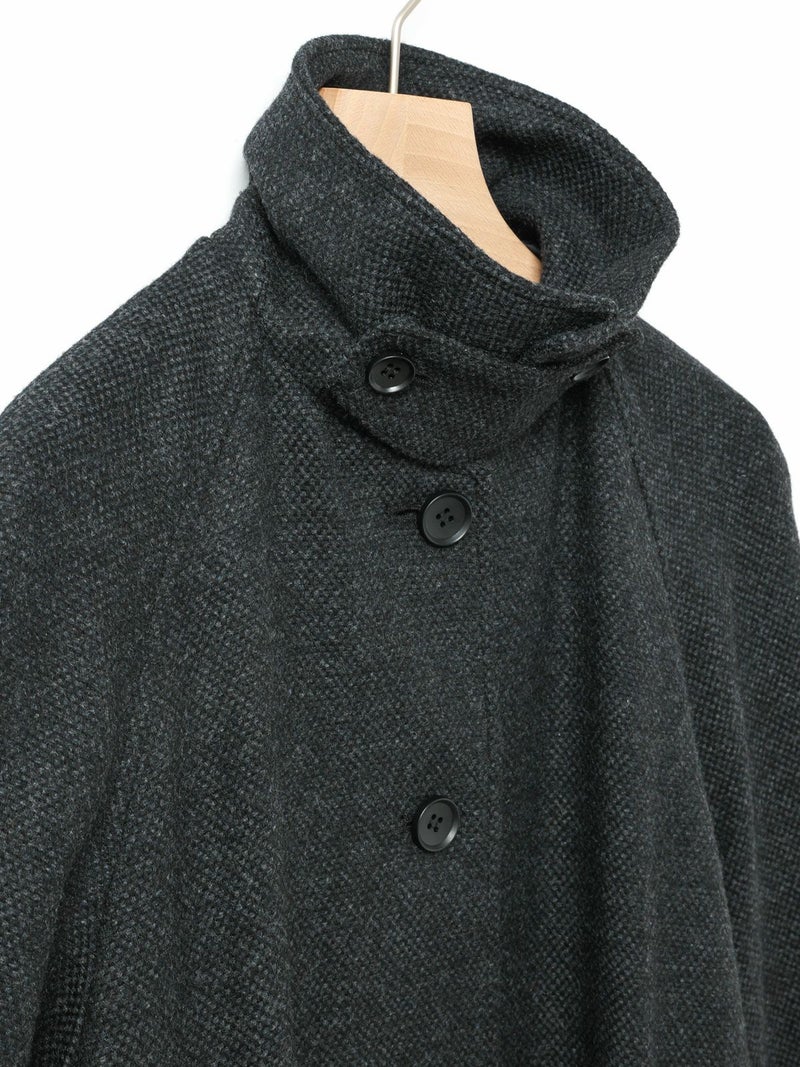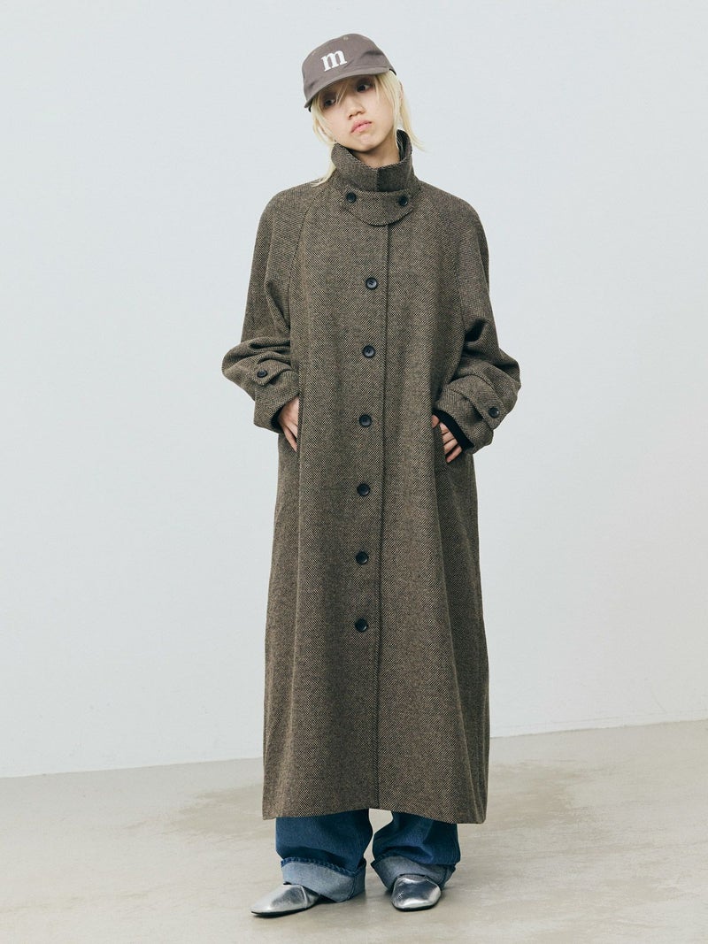 ツイード調の生地を一から作り、その柄と生地の軽さに拘ってデザインしたバルマカーンコートです。大人っぽいロングコートにしているため、生地の重さを何度も調節し、縦長なラインがキレイに出る様シルエットの調整にも注意をしました。全体的には縦長のすっきりとしたシルエットでありながら、ラグランスリーブの袖まわりはゆったりと丸みが出る袖にしています。そのため、中にニットやスウェットなどボリュームのあるアイテムとも合わせやすくなっています。チンストラップはトラッドなコートのワンポイントになっており、取り外し可能。ボリュームのある袖の形状を楽しめる様、袖口をボタンでサイズ調整ができるようにしています。ロングをお探しの方にはお勧めのアウターです。
