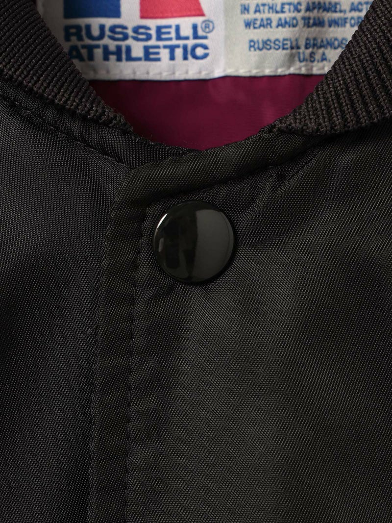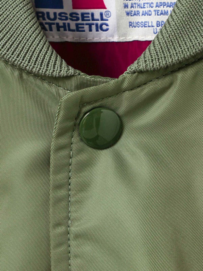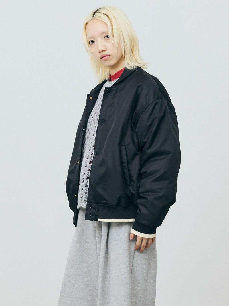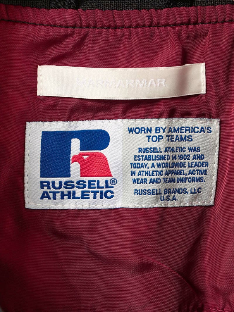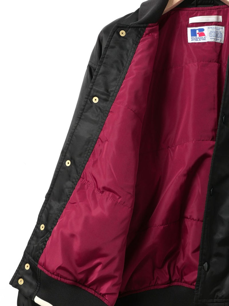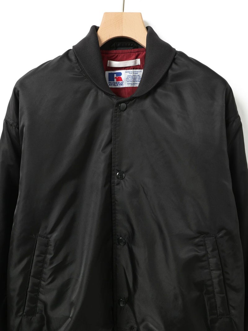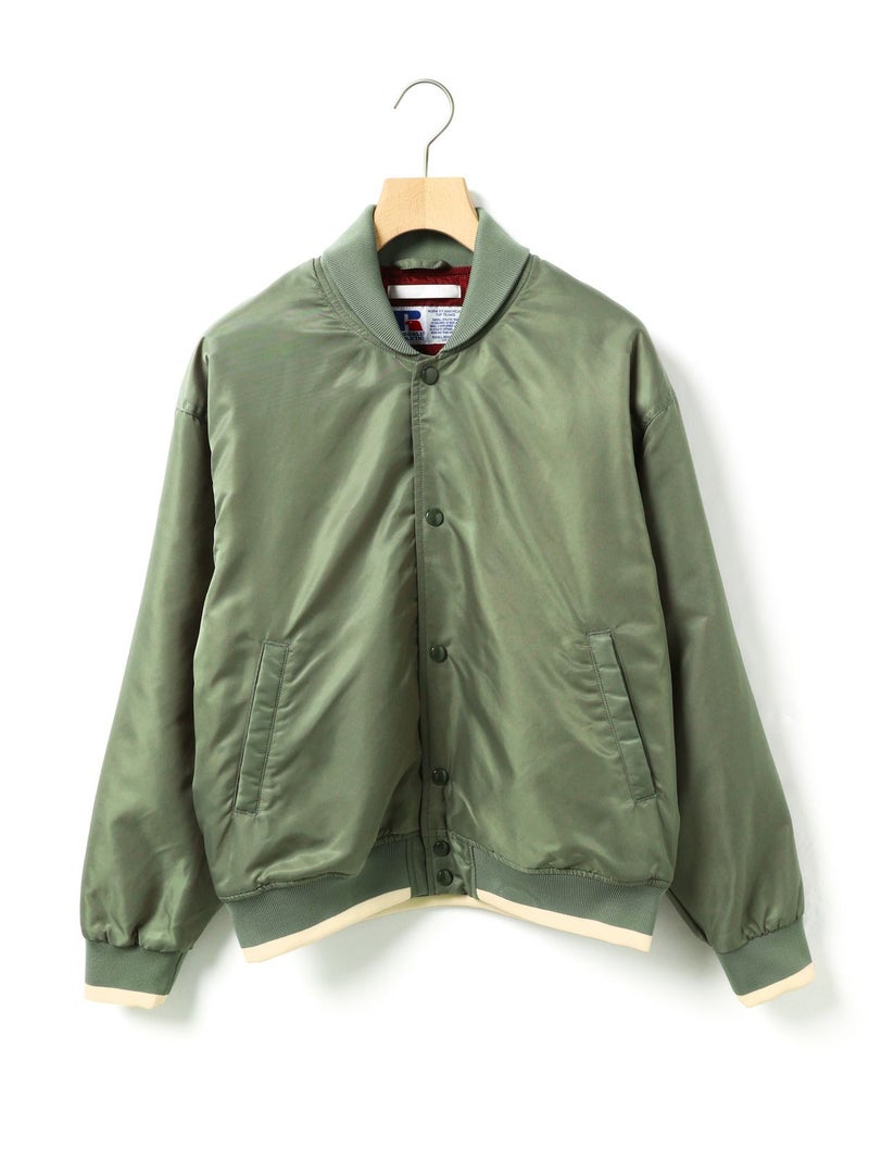 RUSSELL ×MARMARMAR のコラボレーションアイテム、ナイロン素材を使用した中綿入りのスタジアムジャケットです。オーバーなサイジングですが重くなく、さまざまなトップスの上にレイヤードしてお楽しみいただけます。ポイントとしてドンキーコートからインスパイアされた衿を二つ折りにして着用するディティールを採用しました。そのままでも、襟を立ててハイネック気味に着ていただいても可愛く着用していただけます。