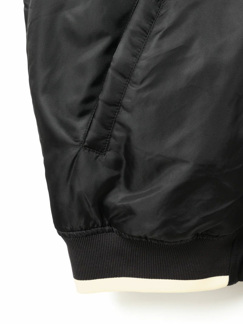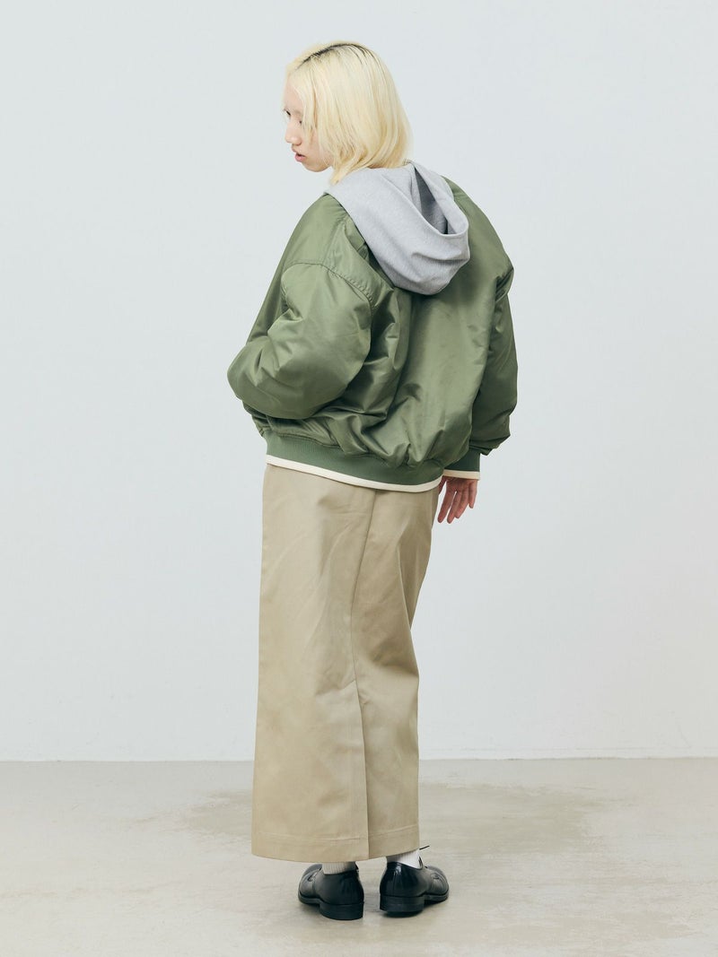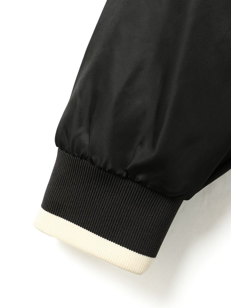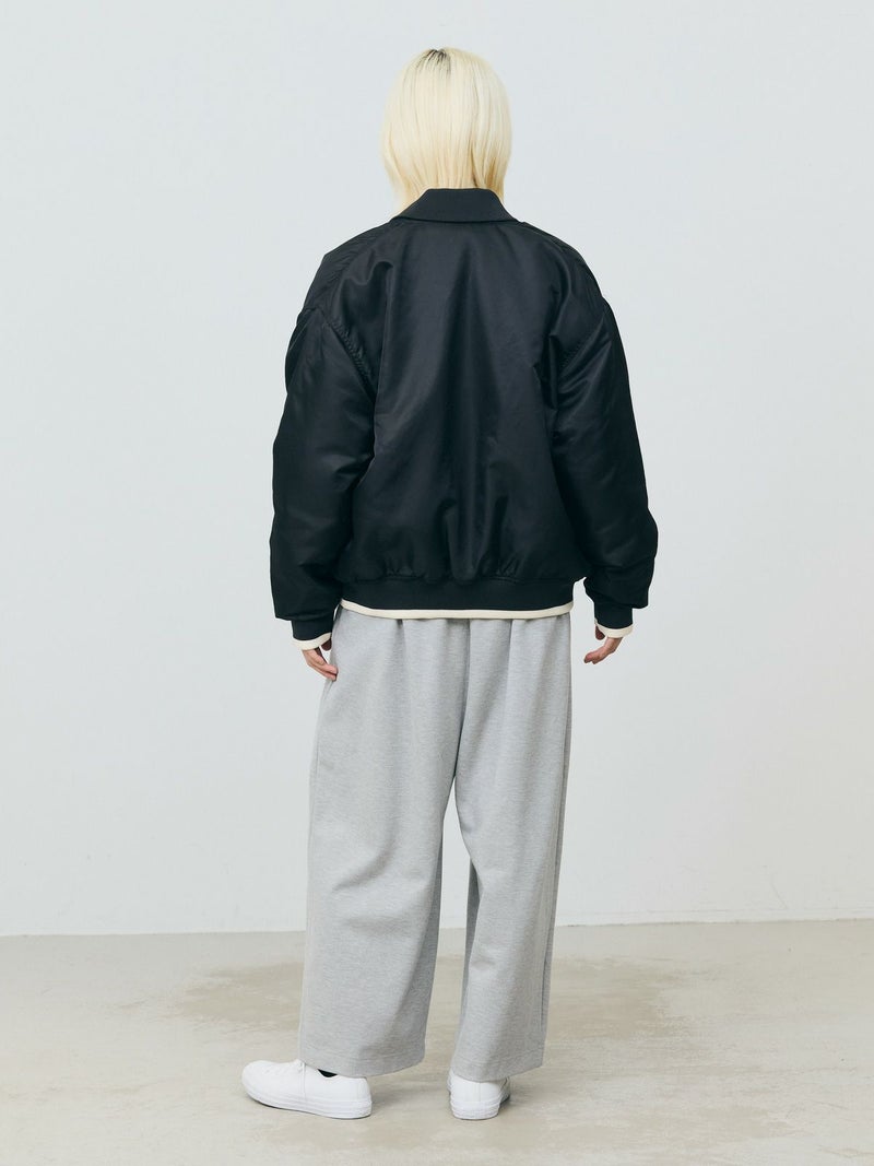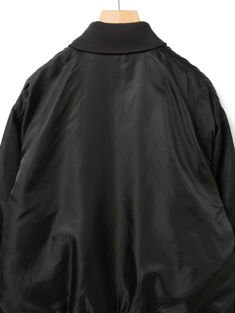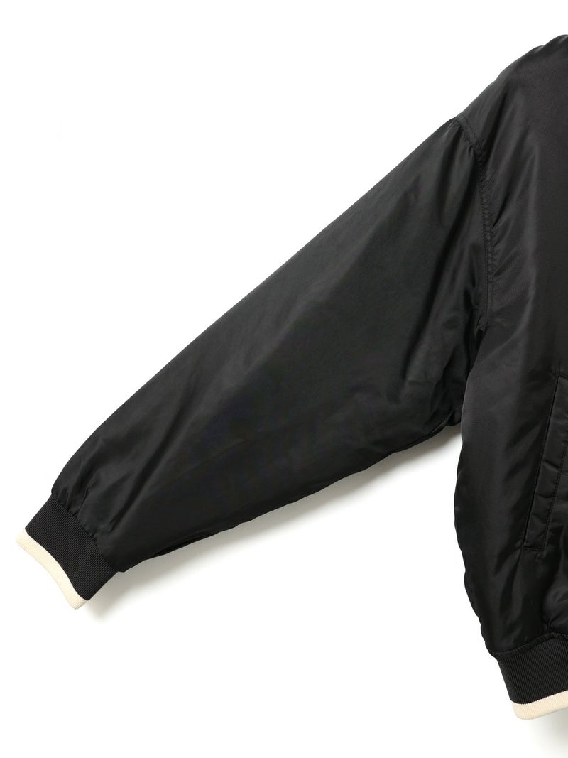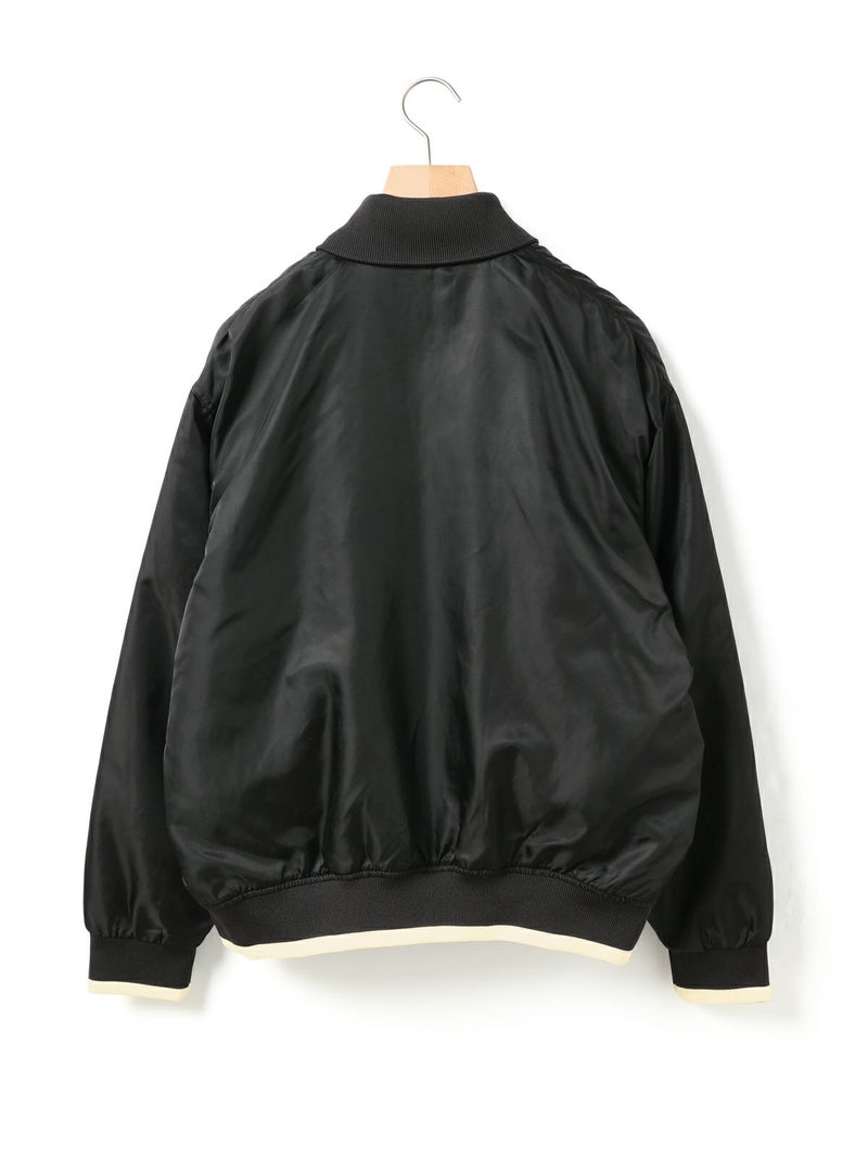 RUSSELL ×MARMARMAR のコラボレーションアイテム、ナイロン素材を使用した中綿入りのスタジアムジャケットです。オーバーなサイジングですが重くなく、さまざまなトップスの上にレイヤードしてお楽しみいただけます。ポイントとしてドンキーコートからインスパイアされた衿を二つ折りにして着用するディティールを採用しました。そのままでも、襟を立ててハイネック気味に着ていただいても可愛く着用していただけます。