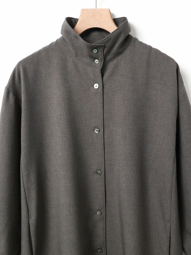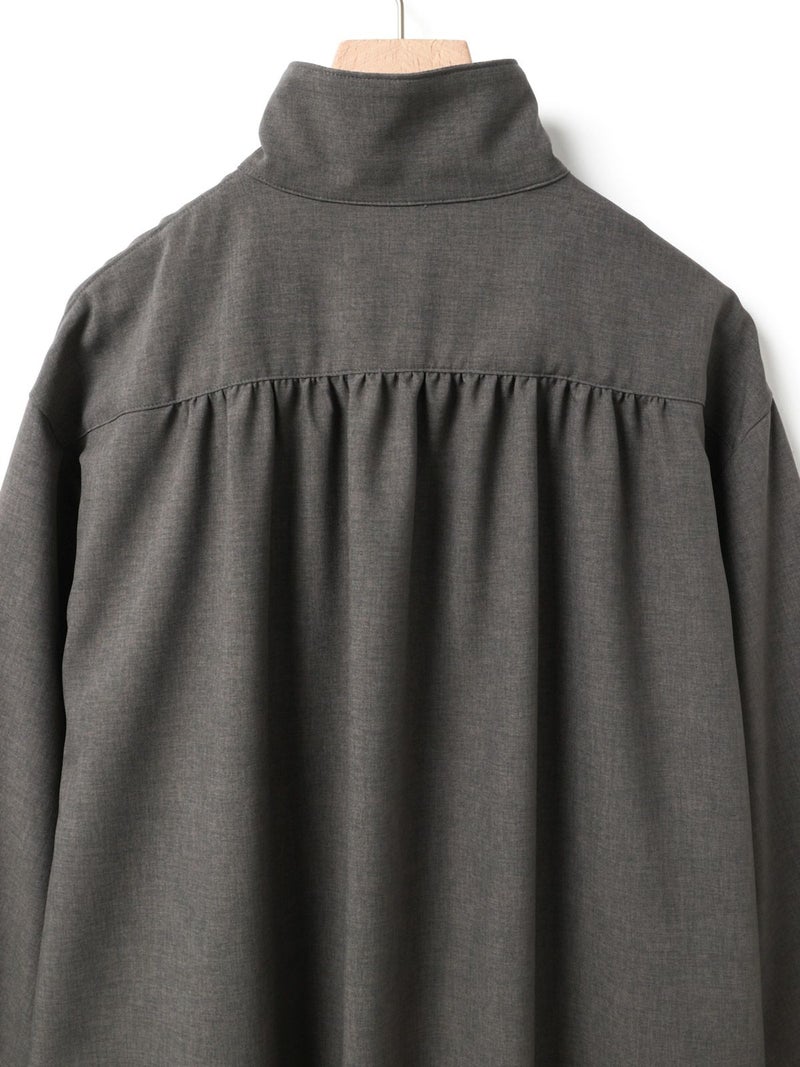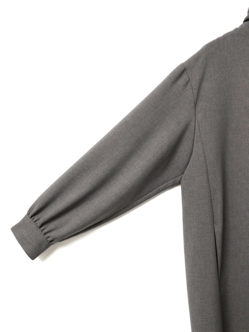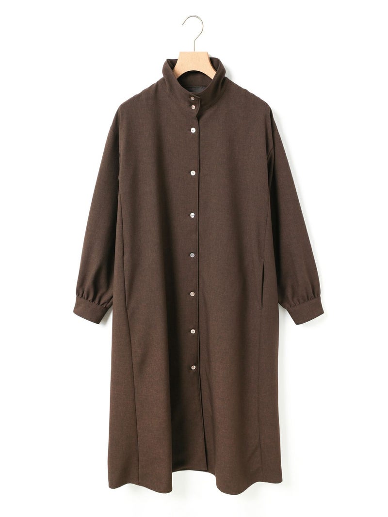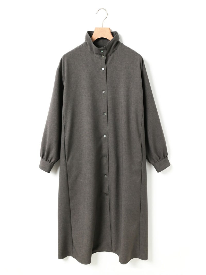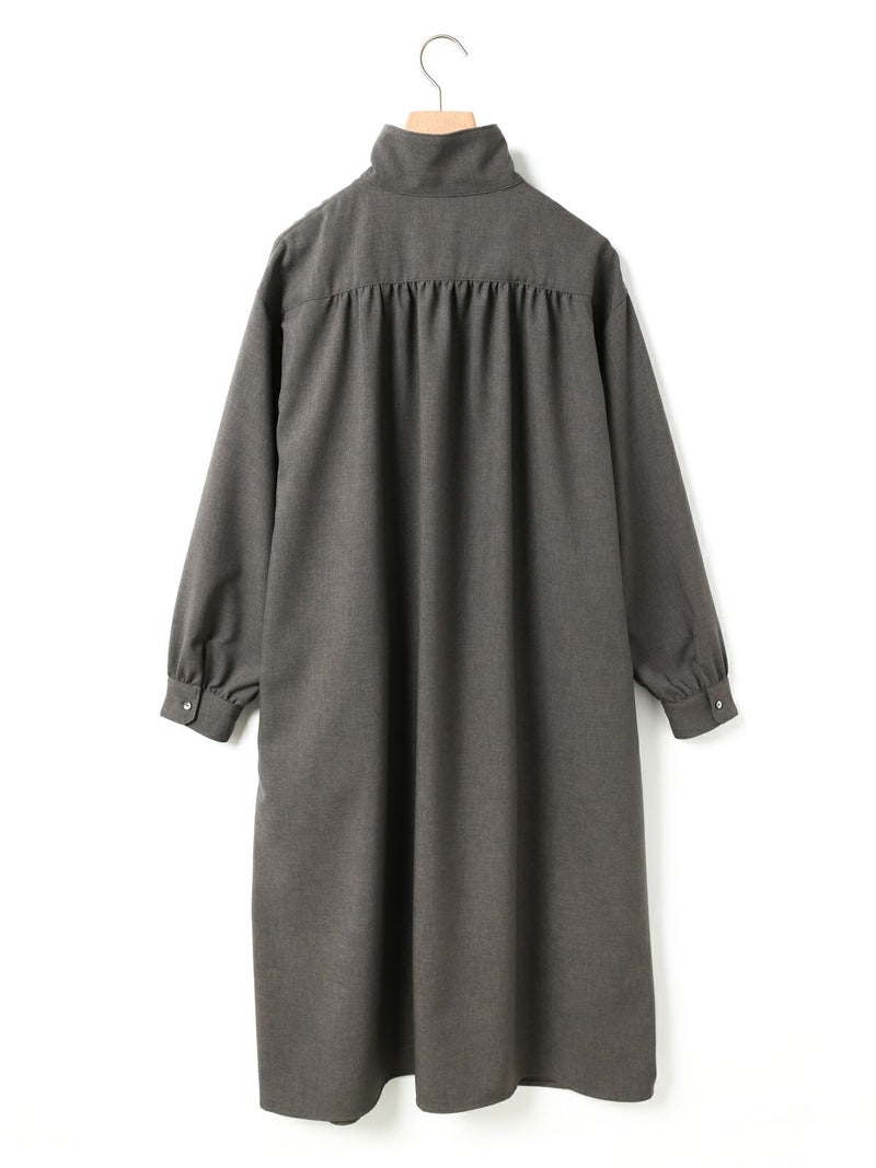 ウールライクな素材を使用したバックギャザーワンピース。ほんのり温かみのあるウールタッチの素材を使用しワンピースとしてはもちろん、組み合わせ次第でコートライクにも着用できる一着に仕上げました。コート感覚で中にニットなどの厚手の衣料も着こめるようにややゆとりのあるサイズ感に設定。裏ヨーク部分には裏地を施し、スムーズに着脱できるようにしております。背中と袖にはギャザーを入れて女性らしさをプラス。脇線を前側に振ることで、ポケットが使いやすい仕様になっているのもこだわりのポイントです。