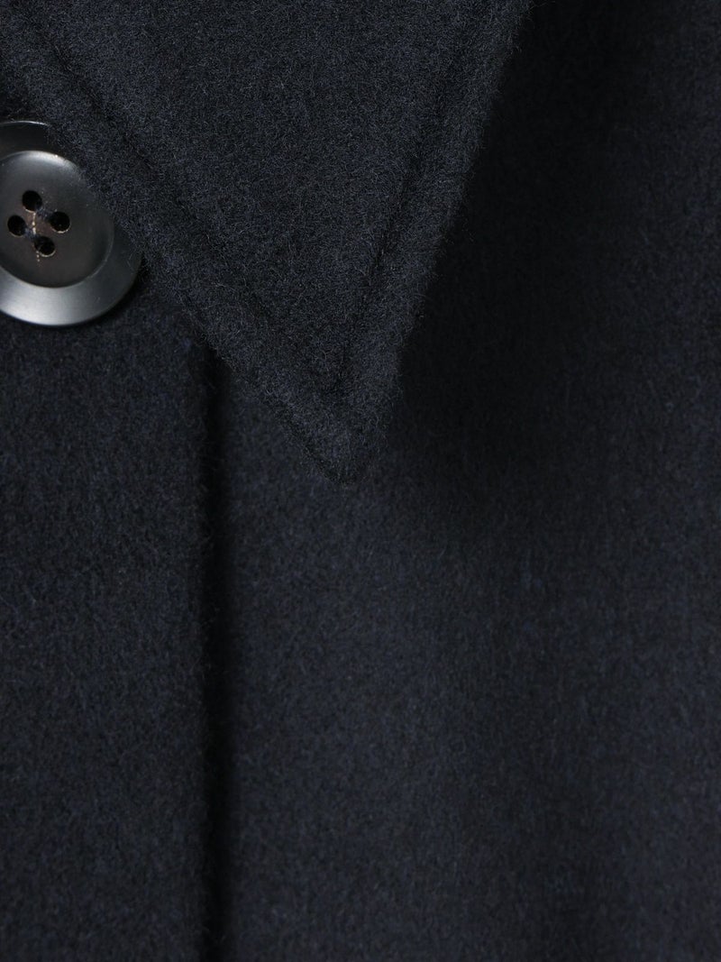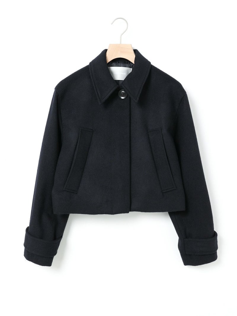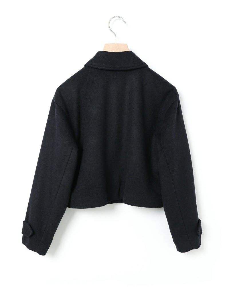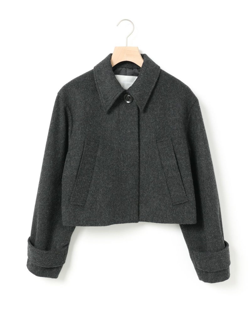 ややショート丈のウールコートを表現しました。今季らしいコンパクトなサイズとシルエットにあえて大きめの襟のバランスがポイント。フロントや袖口のベルトにはドット釦でスッキリとした見え方を演出しました。襟元は大きめの釦をワンポイントにしたのも特徴的。シンプルで馴染みやすさがあるコートながら水牛ボタンを使うなど拘りも取り入れた1枚です。裏地付き。スカートやボリュームのあるボトムに合わせたコーディネートがオススメです。