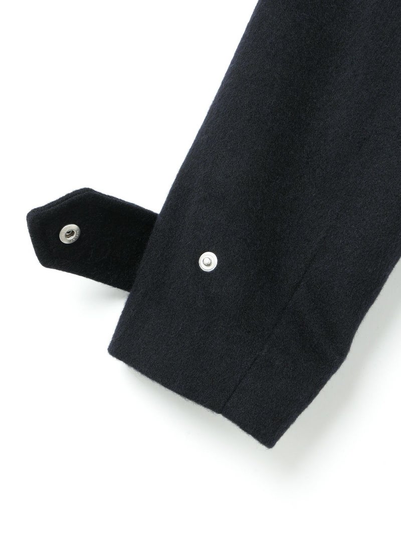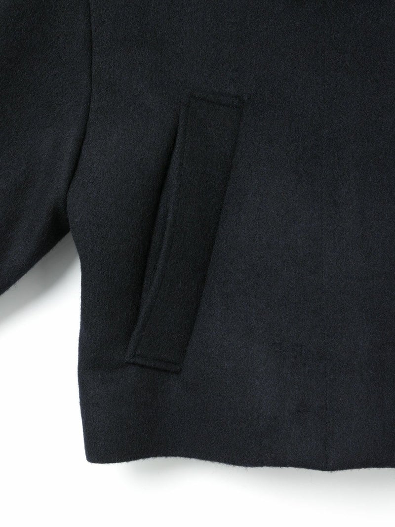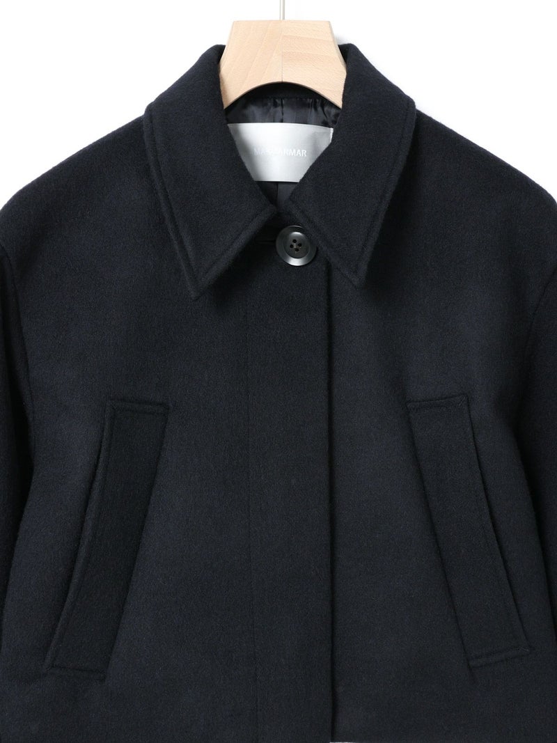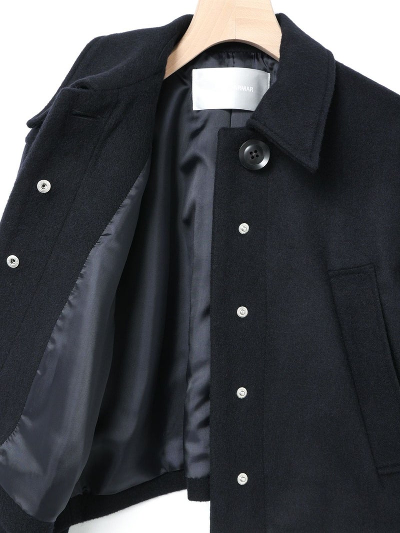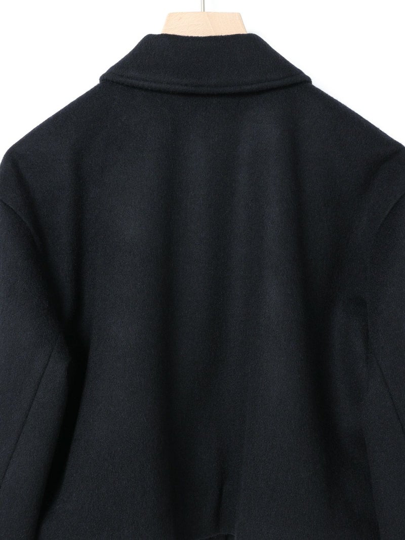 ややショート丈のウールコートを表現しました。今季らしいコンパクトなサイズとシルエットにあえて大きめの襟のバランスがポイント。フロントや袖口のベルトにはドット釦でスッキリとした見え方を演出しました。襟元は大きめの釦をワンポイントにしたのも特徴的。シンプルで馴染みやすさがあるコートながら水牛ボタンを使うなど拘りも取り入れた1枚です。裏地付き。スカートやボリュームのあるボトムに合わせたコーディネートがオススメです。