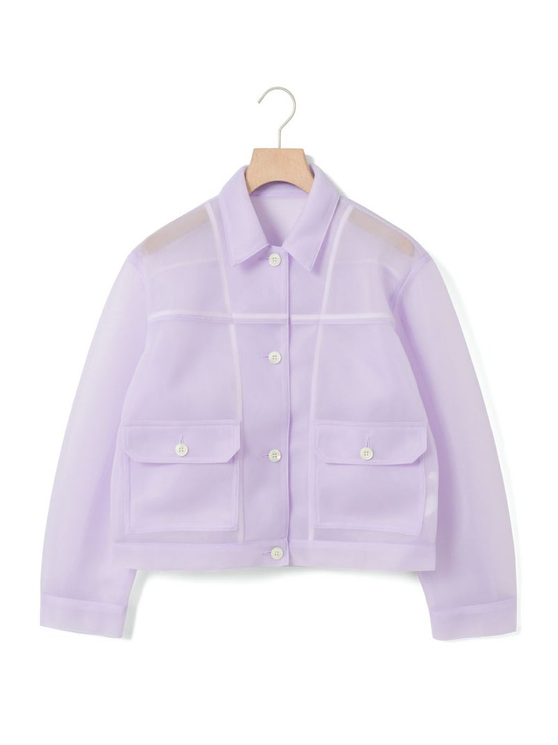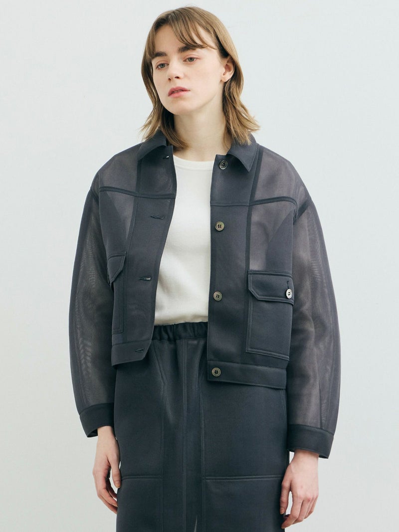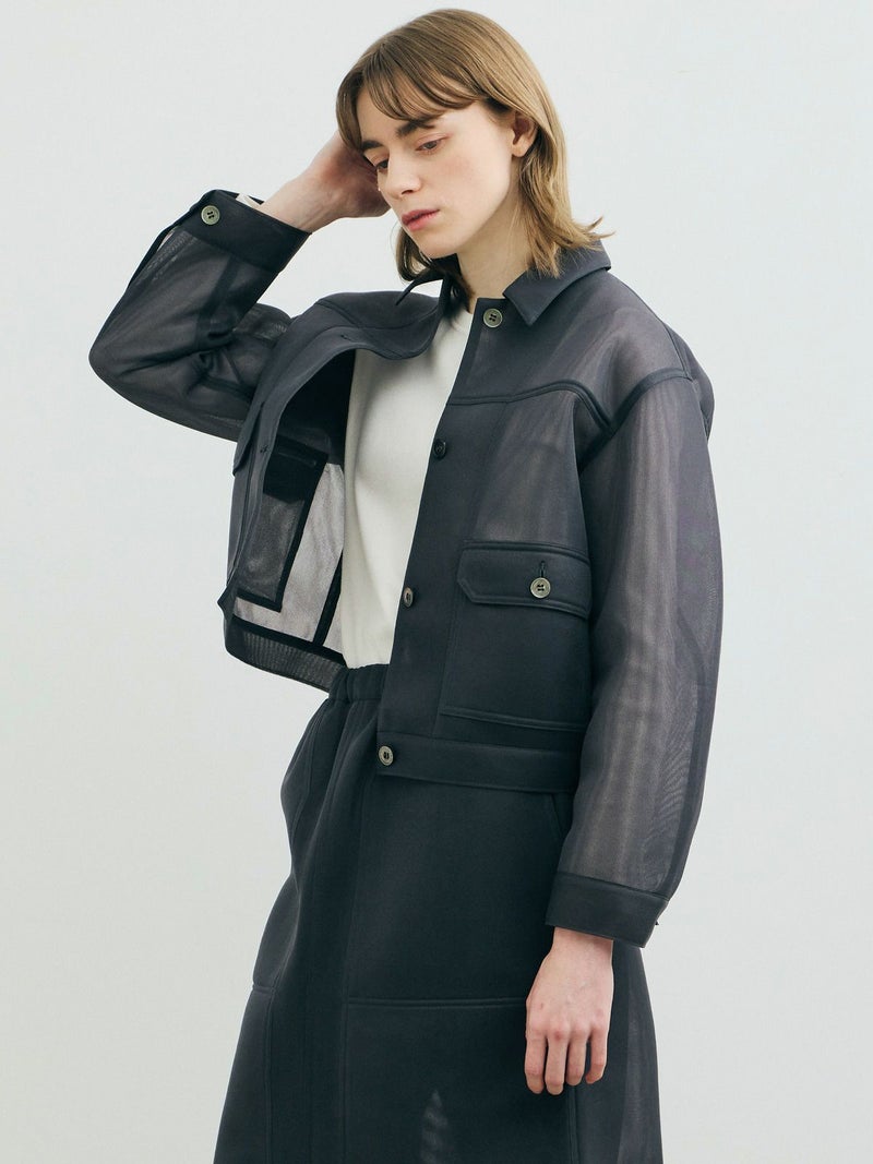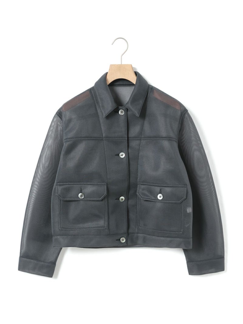 ワークジャケットをシアー素材で表現することで、トレンド感のあるアイテムに仕上げたシアーワークジャケット。立体感のあるユーロビンテージをイメージしてデザインした、ゆとりがあり女性的まるみのあるシルエットを表現。きれいなスラックス+ぴったりめのTシャツに羽織るなど着こなしも多様にできる1枚。肉厚なチュール素材なので取り扱いもしやすくなっています。同素材で仕上げた1-860094/シアーダブルニースカートとのセットアップでのコーディネートもお勧めです。