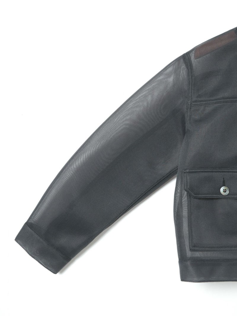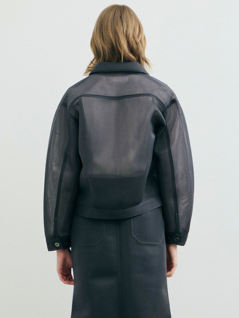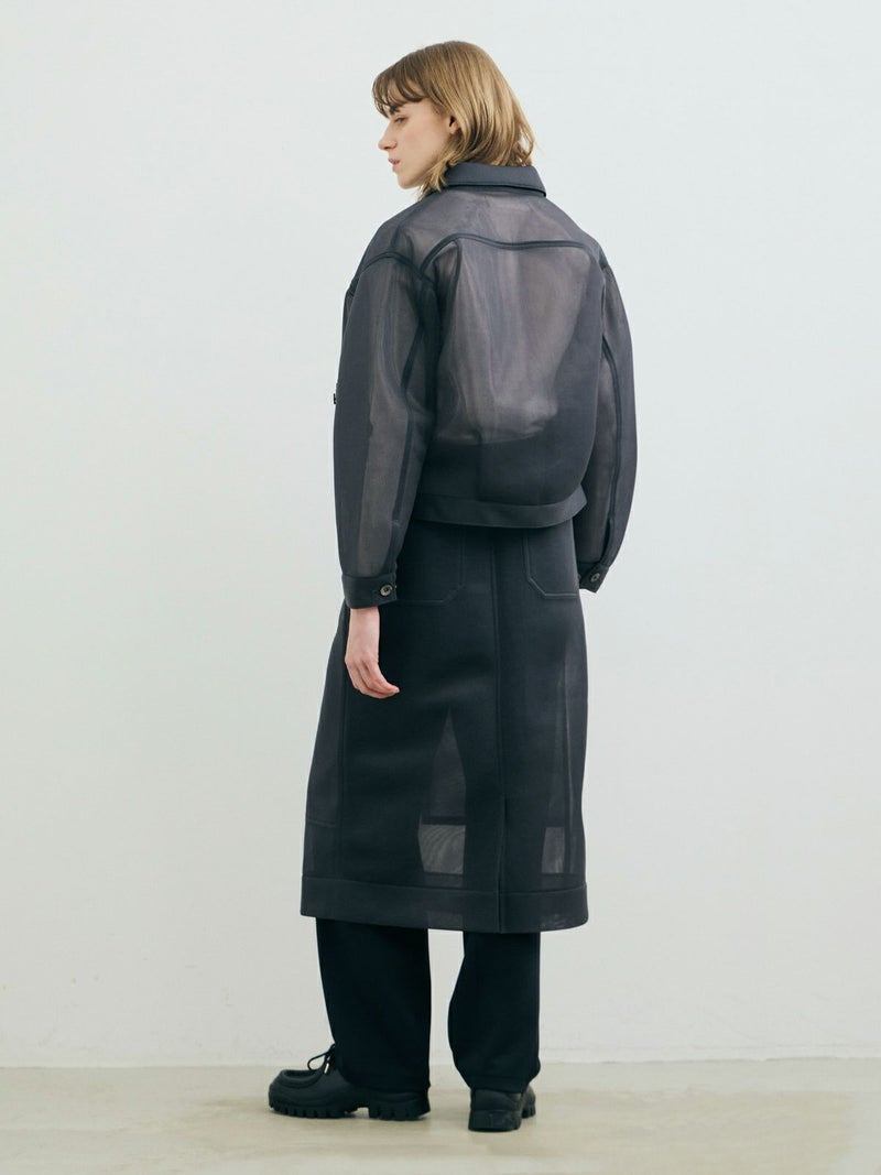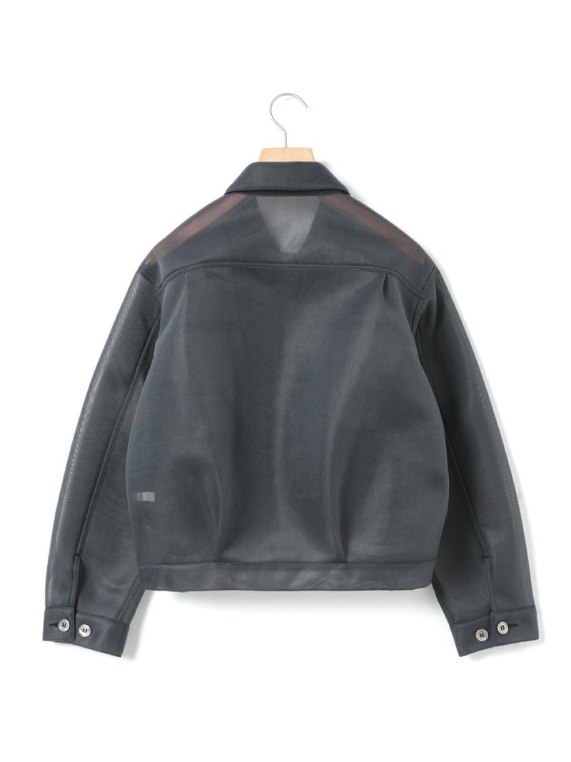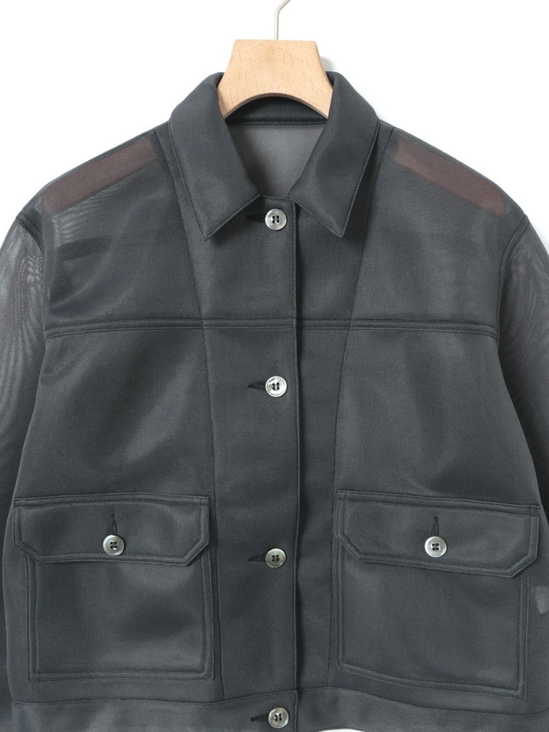 ワークジャケットをシアー素材で表現することで、トレンド感のあるアイテムに仕上げたシアーワークジャケット。立体感のあるユーロビンテージをイメージしてデザインした、ゆとりがあり女性的まるみのあるシルエットを表現。きれいなスラックス+ぴったりめのTシャツに羽織るなど着こなしも多様にできる1枚。肉厚なチュール素材なので取り扱いもしやすくなっています。同素材で仕上げた1-860094/シアーダブルニースカートとのセットアップでのコーディネートもお勧めです。