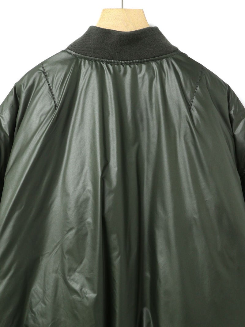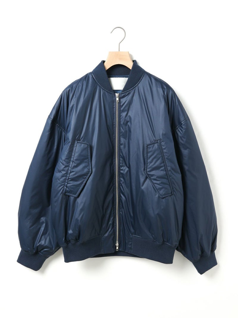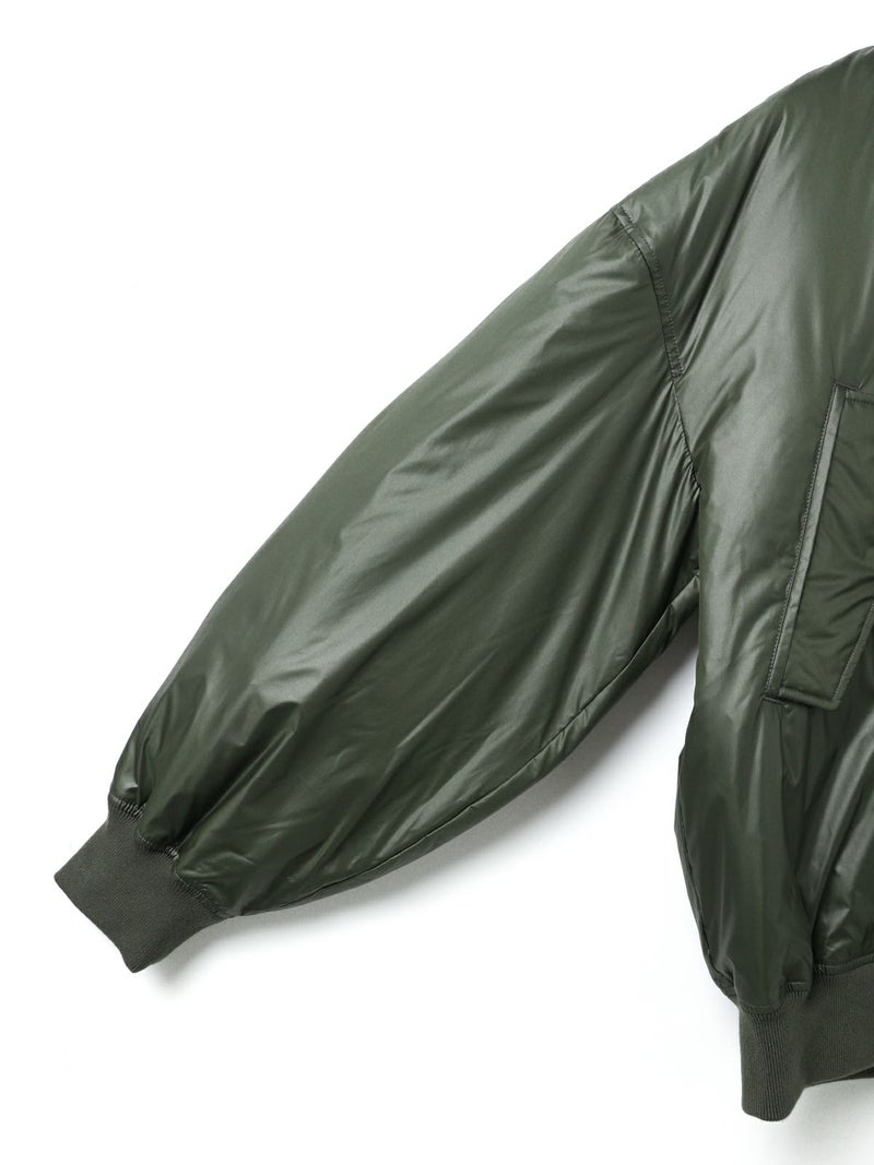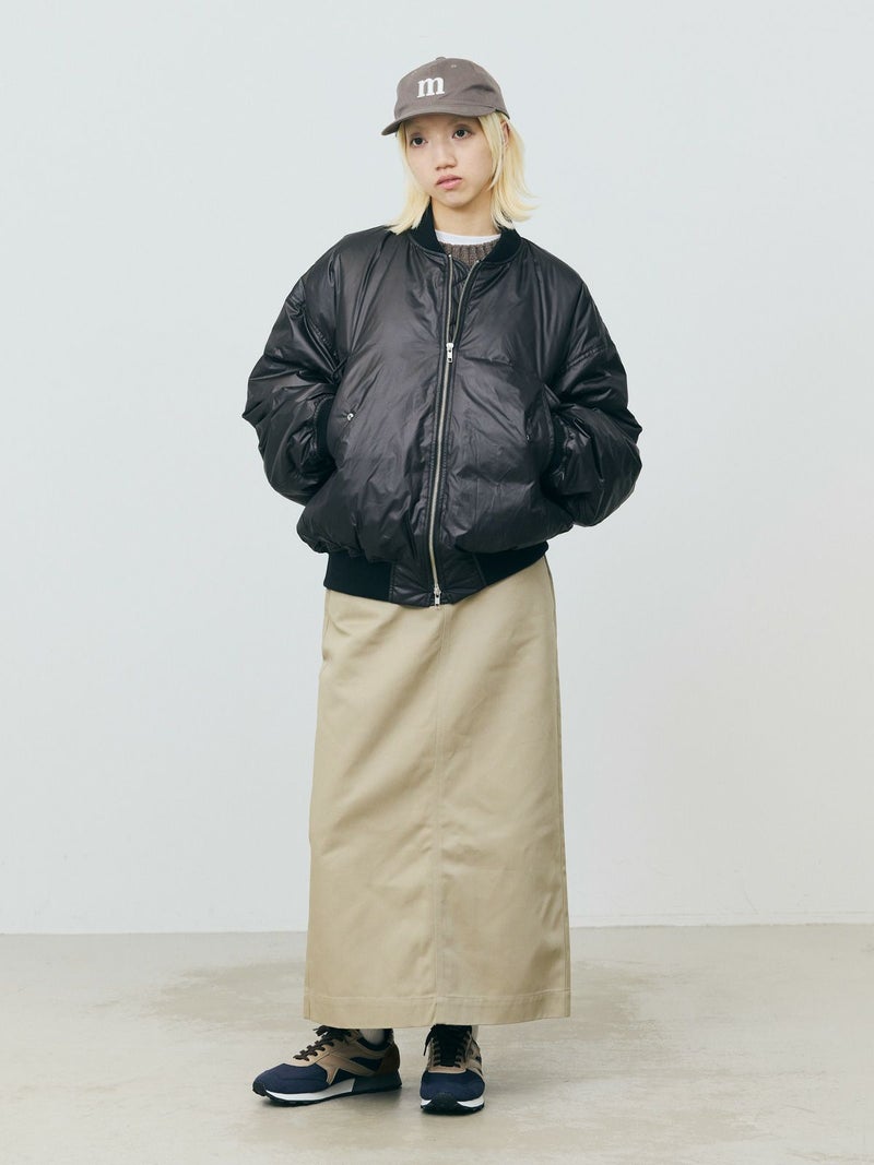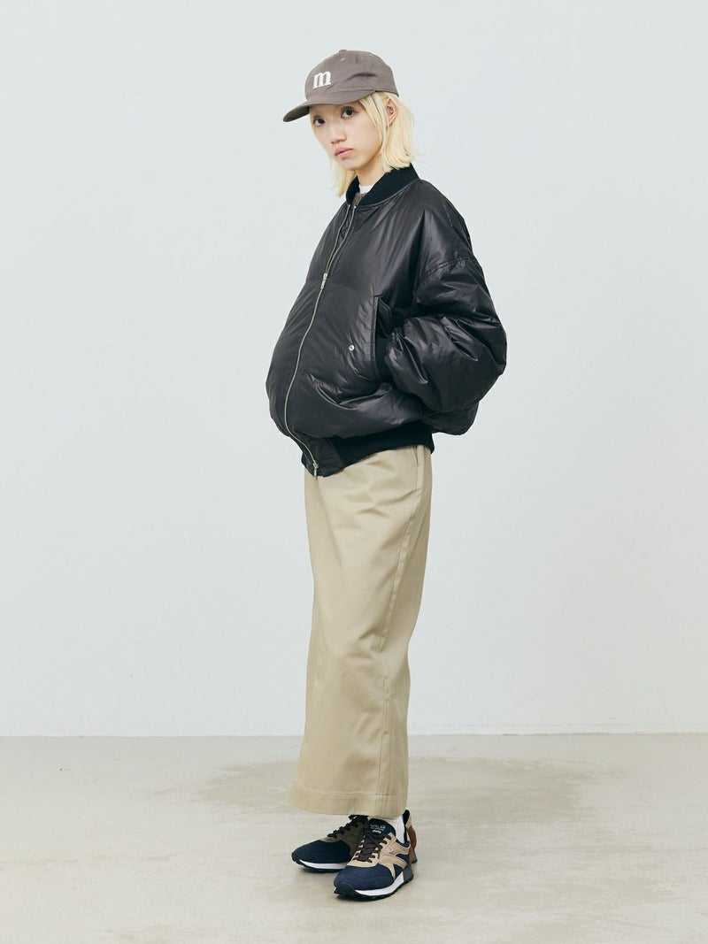 MA-1型のダウンジャケットです。ボリューム感やディティールに拘り、何度も試作を重ねて作成したビックサイズ且つボリューミーなMA-1を表現しました。基本的なMA-1のバランスやディティールはしっかり残しつつ、ボリューム感やサイズ感をMARMARMARらしく作り変えました。特に袖のボリューム感が目を引くワンポイントになっています。大きめのサイジングで仕上げているのでフロントを開けてラフに羽織るのはもちろん、裾まわりの寸法を少し絞っているのでフロントを留めて裾が腰辺りで止まるように着ていただくのもお勧めです。表地の光沢感を抑えるために敢えて裏側を表として使用しているのも隠れたポイント一つです。