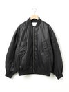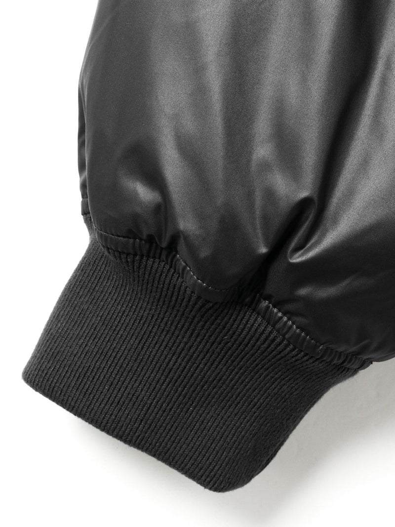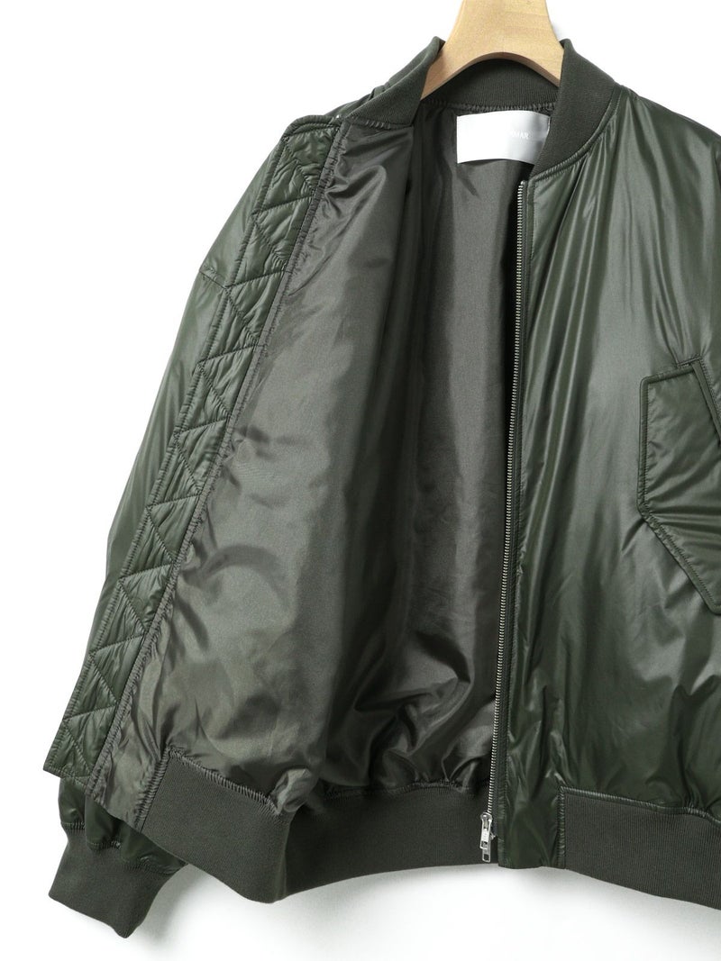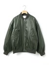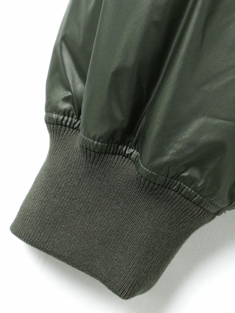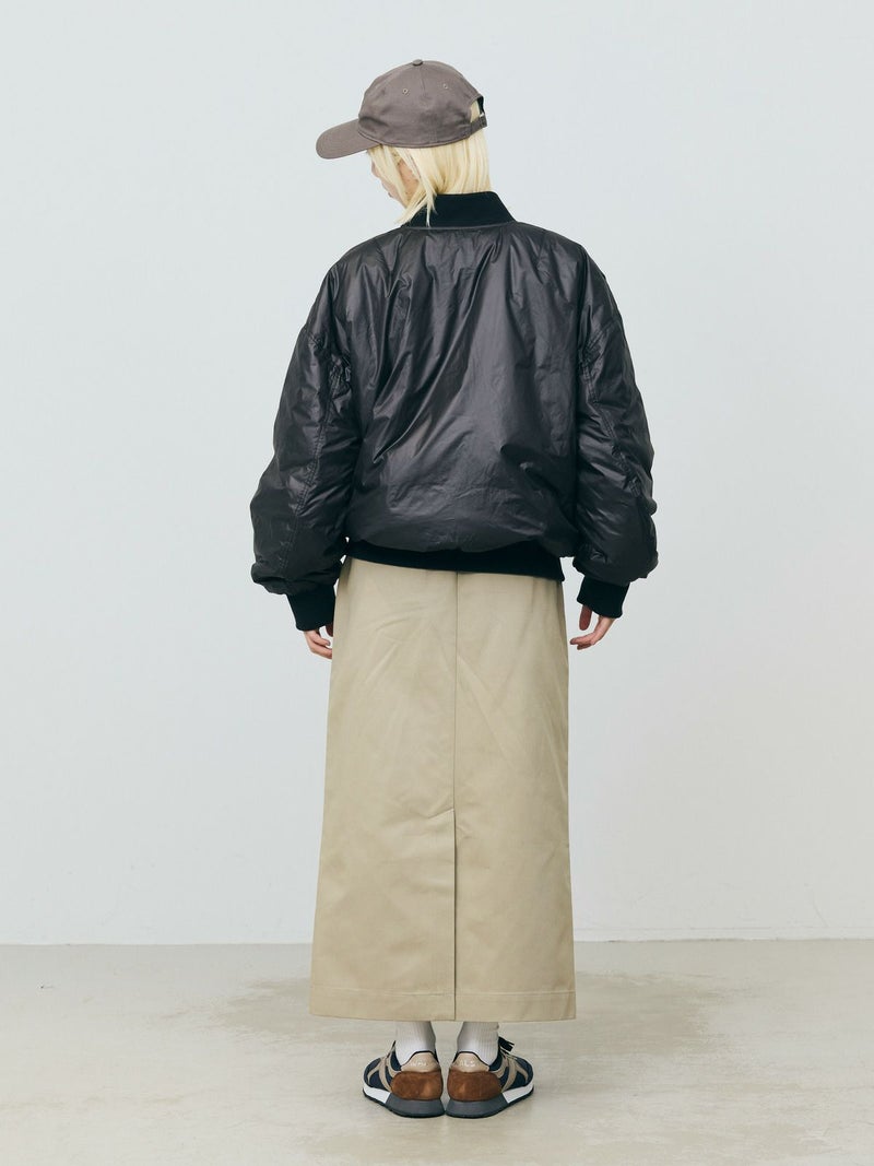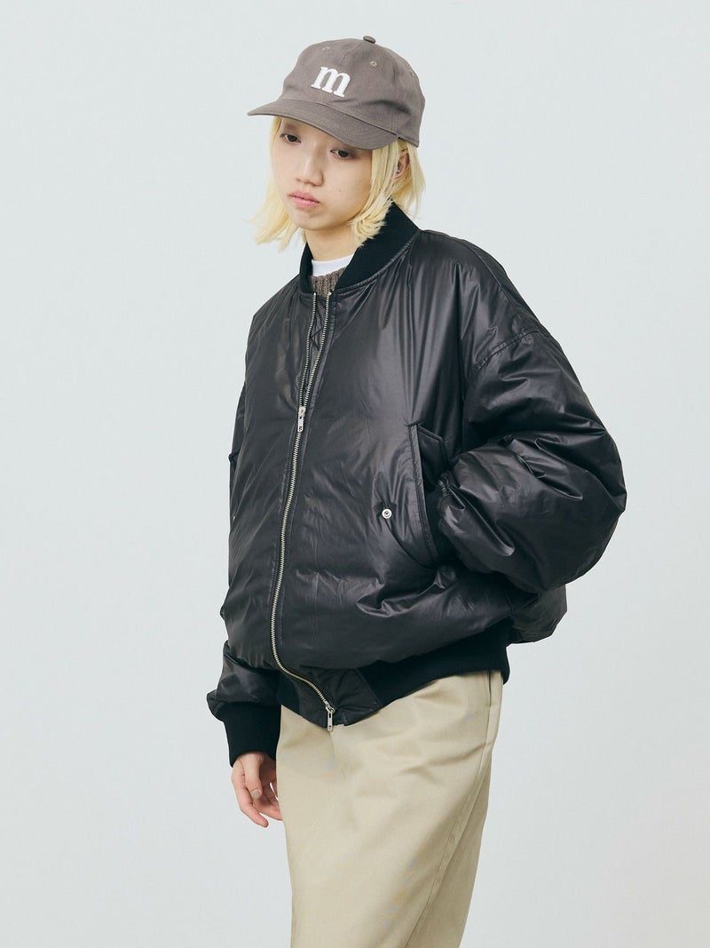 MA-1型のダウンジャケットです。ボリューム感やディティールに拘り、何度も試作を重ねて作成したビックサイズ且つボリューミーなMA-1を表現しました。基本的なMA-1のバランスやディティールはしっかり残しつつ、ボリューム感やサイズ感をMARMARMARらしく作り変えました。特に袖のボリューム感が目を引くワンポイントになっています。大きめのサイジングで仕上げているのでフロントを開けてラフに羽織るのはもちろん、裾まわりの寸法を少し絞っているのでフロントを留めて裾が腰辺りで止まるように着ていただくのもお勧めです。表地の光沢感を抑えるために敢えて裏側を表として使用しているのも隠れたポイント一つです。