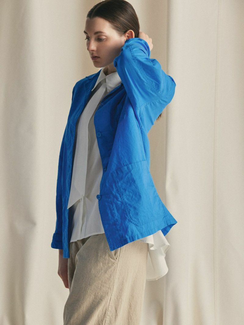 ポケットやボタンなど、ワークテイストなディテールが特徴的なシャツジャケットです。綿麻素材を使用したことでシャリ感が出て涼しげな印象のジャケットを表現しました。洗い&タンブラーでクッタリとさせシワ感を残した風合いに仕上げているので気軽に着脱可能。ゆとりがありながら程よく身体に沿う立体的なパターンがカジュアル過ぎずキレイに見えるのがポイントです。軽く見えるよう袖口はカフス仕様のシャツディテールに仕上がっています。