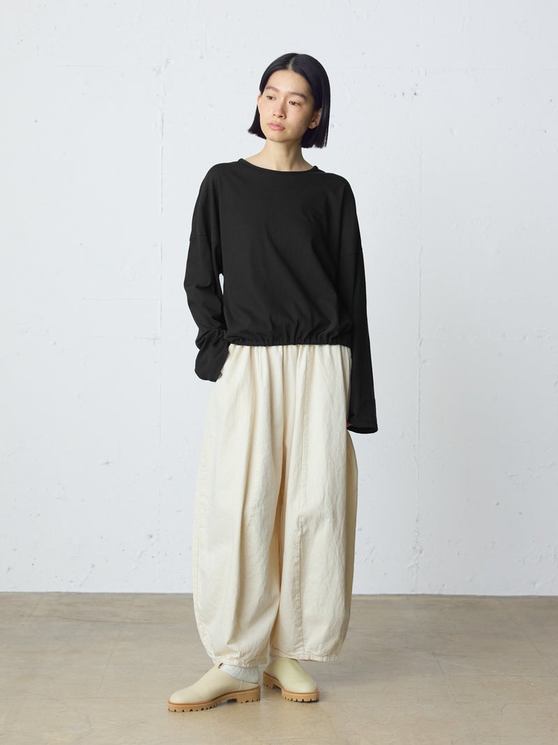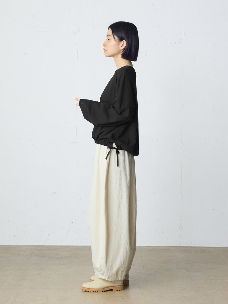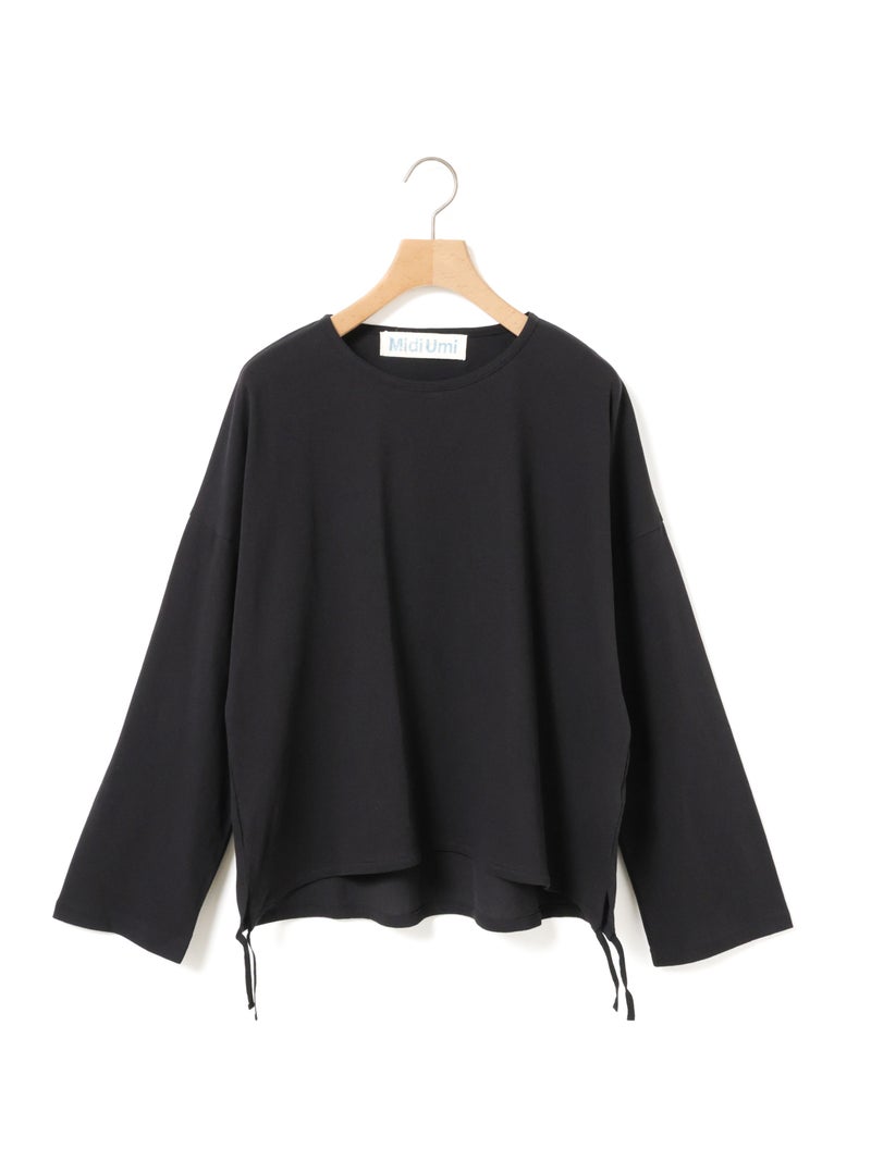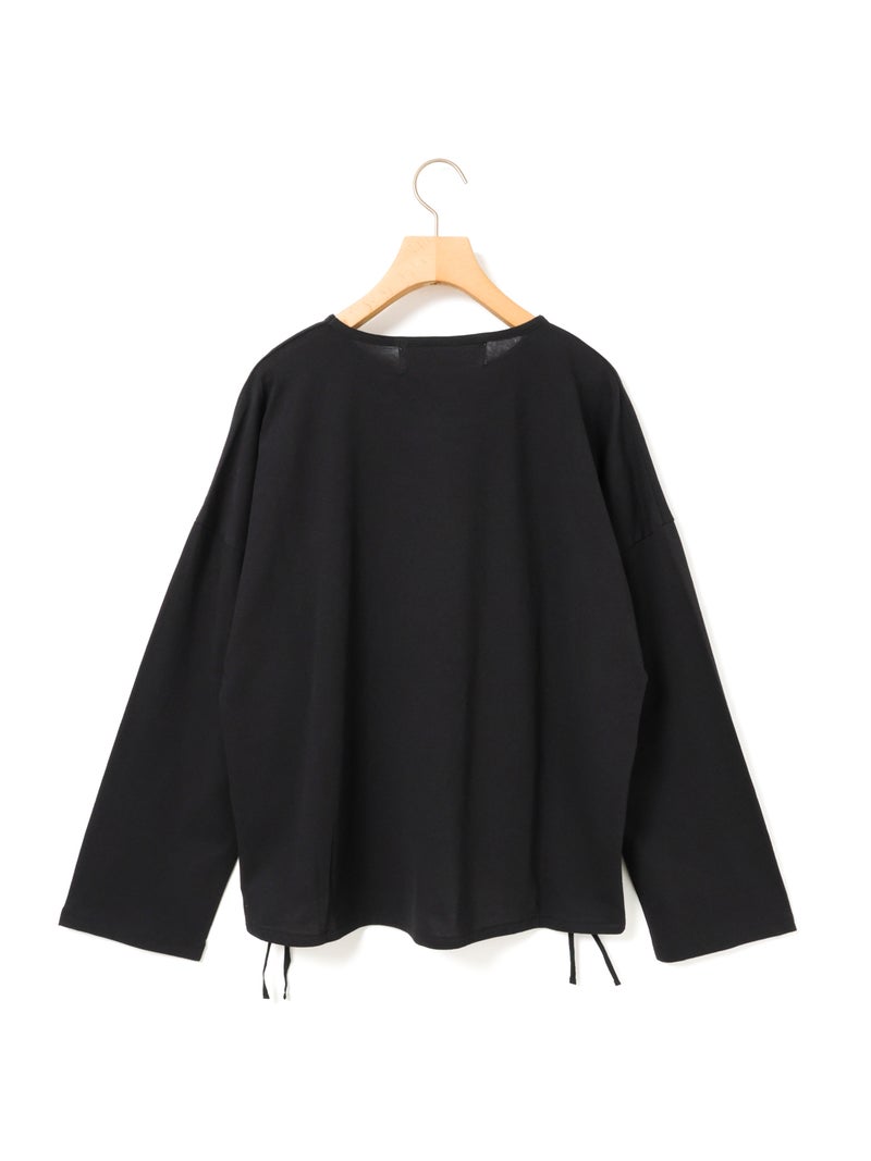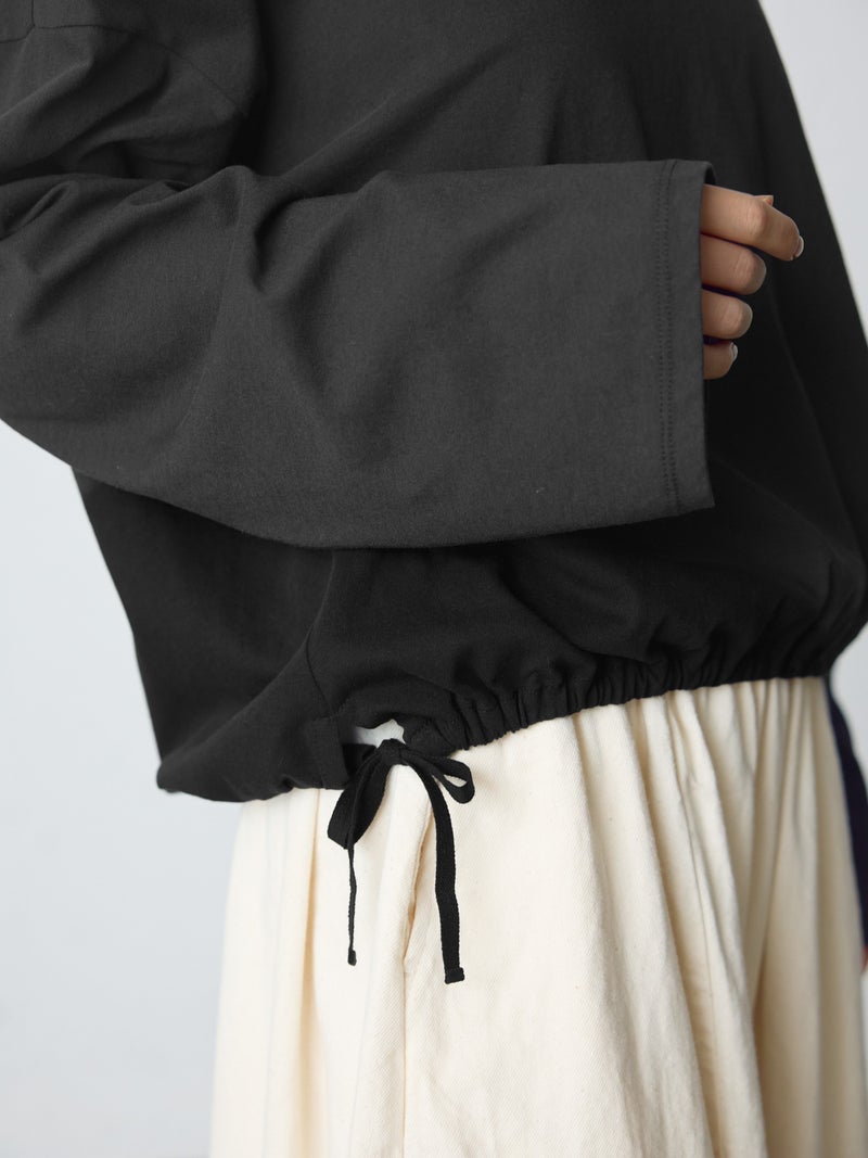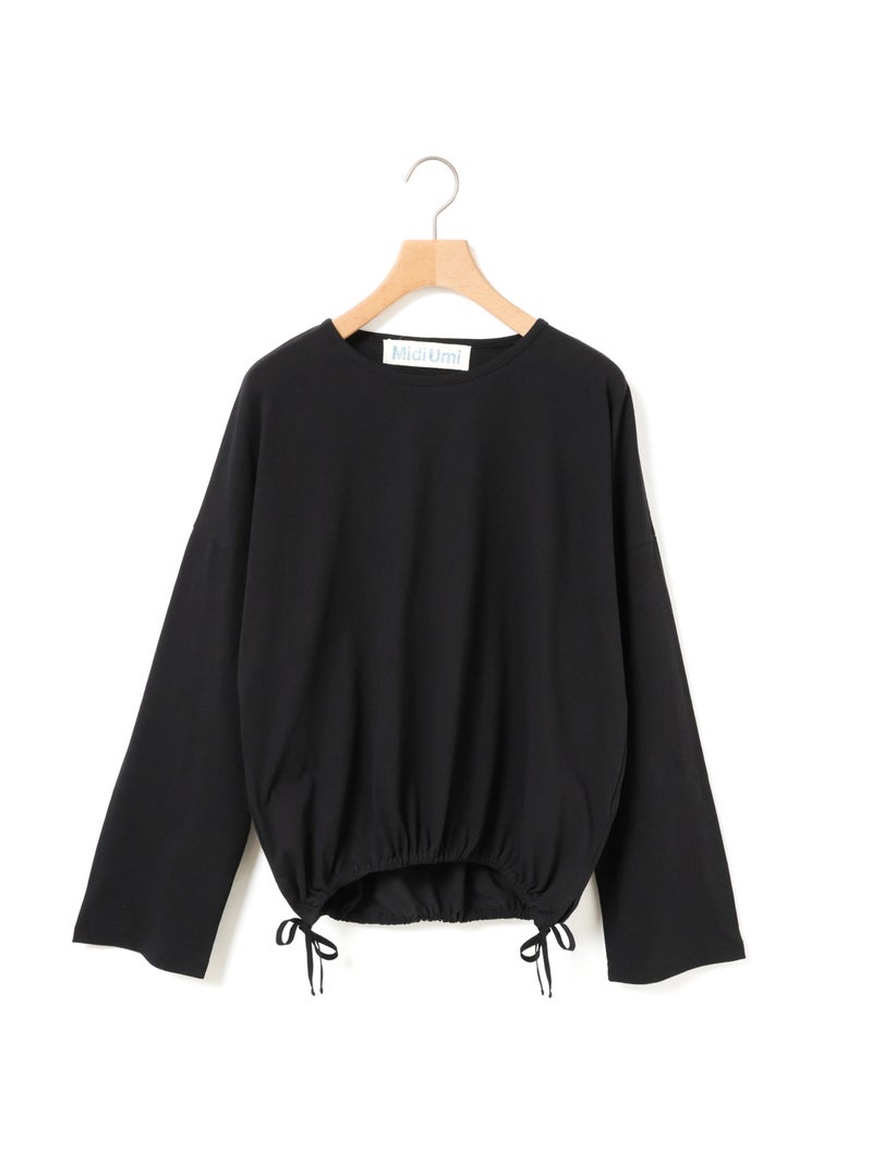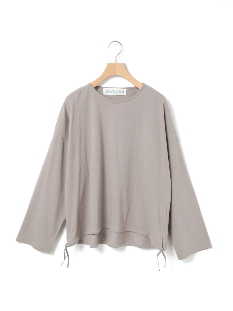 毛羽の少ないドライ天竺を使用したドローストリングプルオーバーです。程よい透け感と落ち感のある素材が特徴。ルーズなシルエットのロンTで、裾にドロスト紐をデザインしました。好みでドロストをすることによって雰囲気を変化させることができます。丈の長さもかわり、サイドリボンがアクセントにもなります。生地に透け感があるので、素材を生かしてレイヤードスタイルもお勧めです。同シリーズ 1-710106/ボリュームスリーブプルオーバーも展開。
