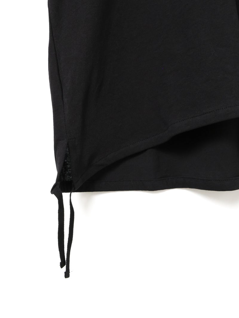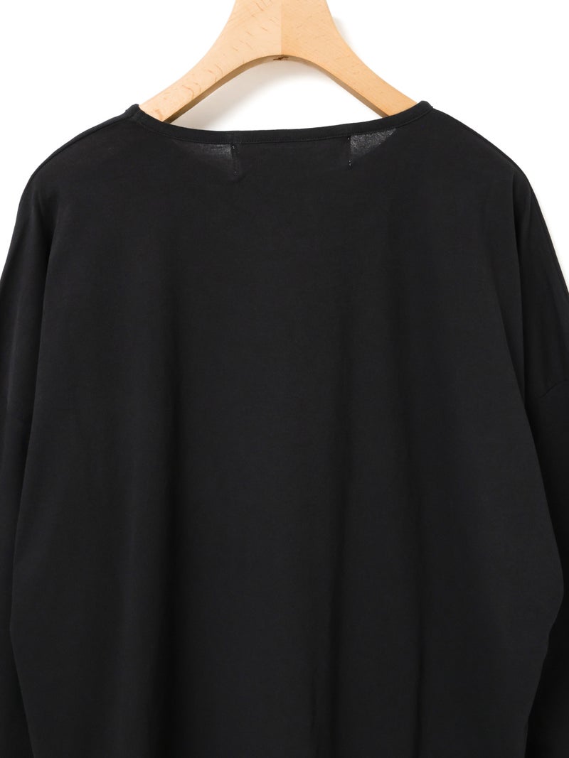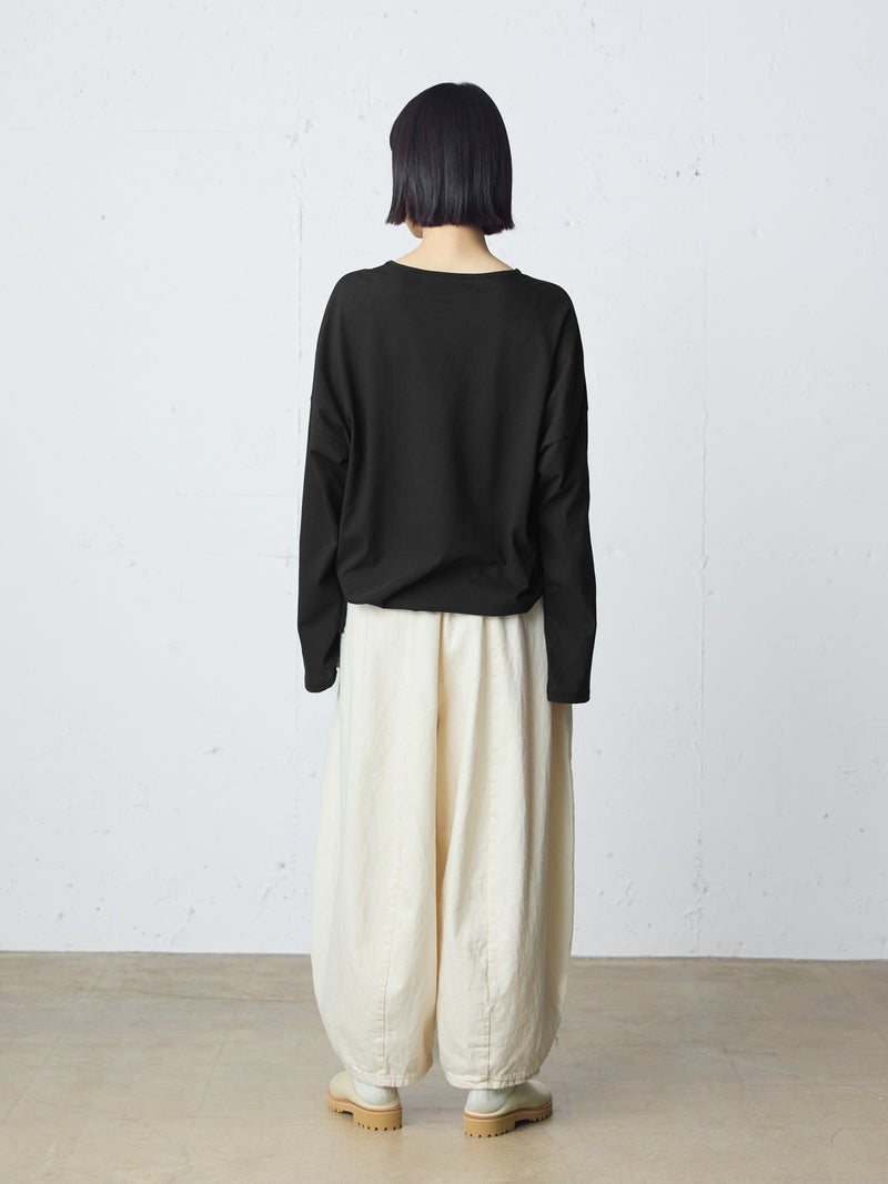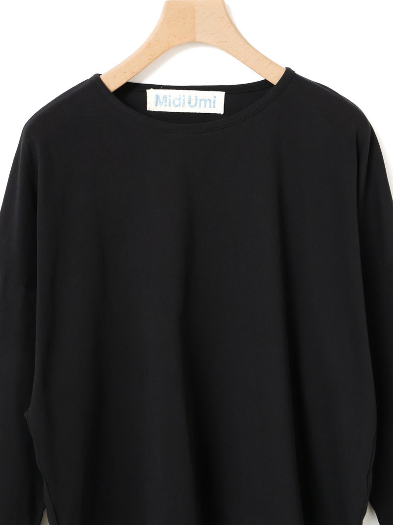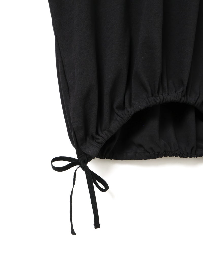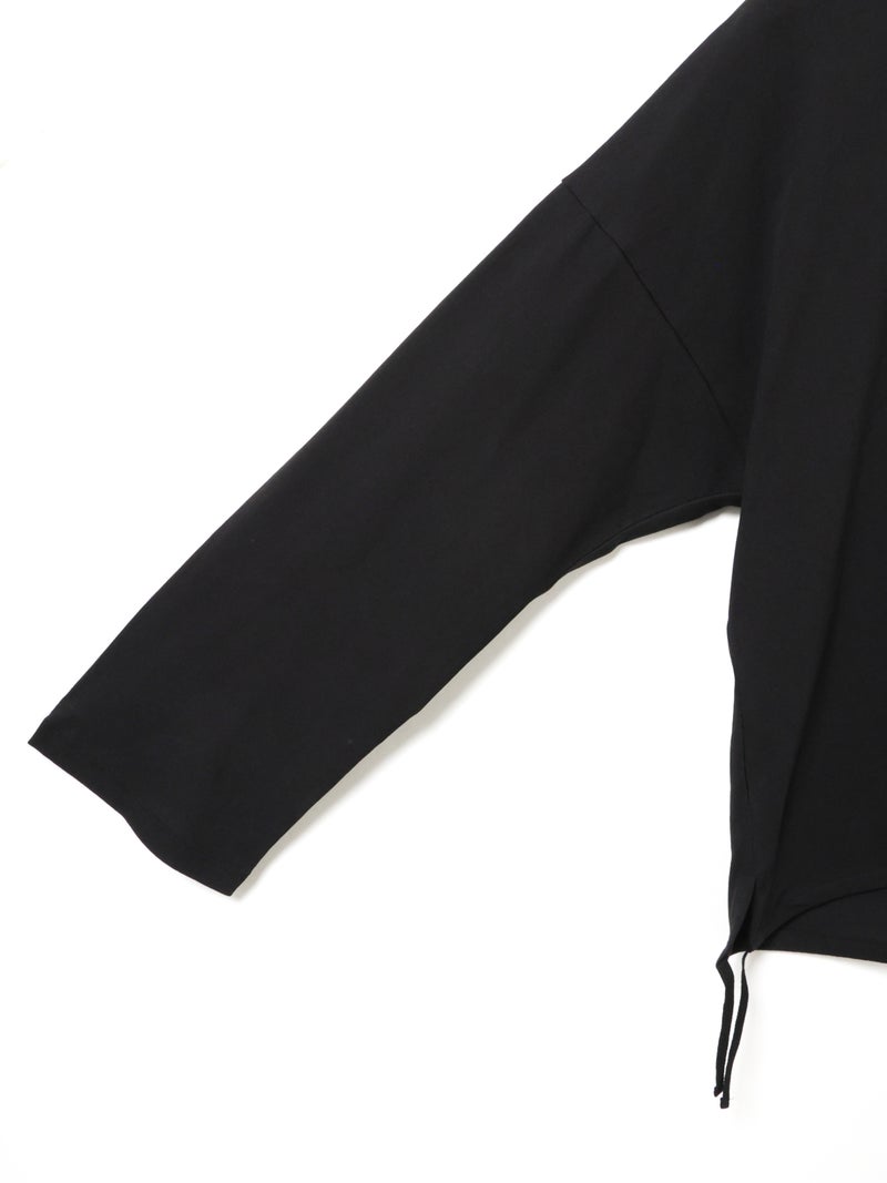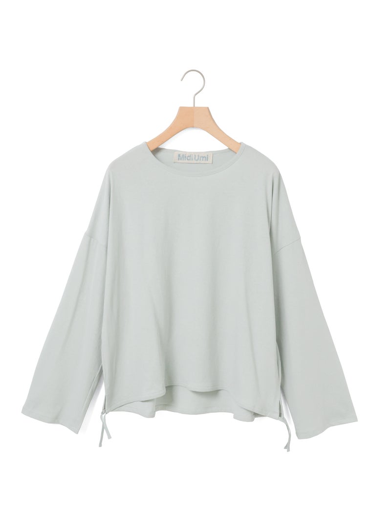 毛羽の少ないドライ天竺を使用したドローストリングプルオーバーです。程よい透け感と落ち感のある素材が特徴。ルーズなシルエットのロンTで、裾にドロスト紐をデザインしました。好みでドロストをすることによって雰囲気を変化させることができます。丈の長さもかわり、サイドリボンがアクセントにもなります。生地に透け感があるので、素材を生かしてレイヤードスタイルもお勧めです。同シリーズ 1-710106/ボリュームスリーブプルオーバーも展開。
