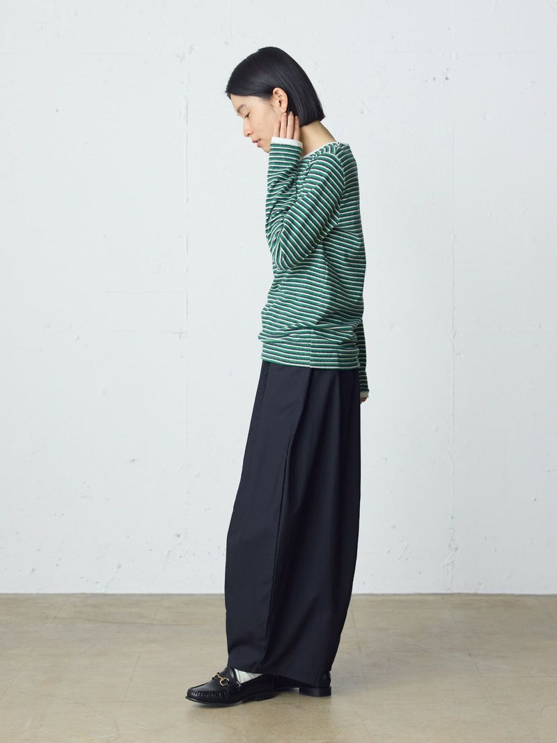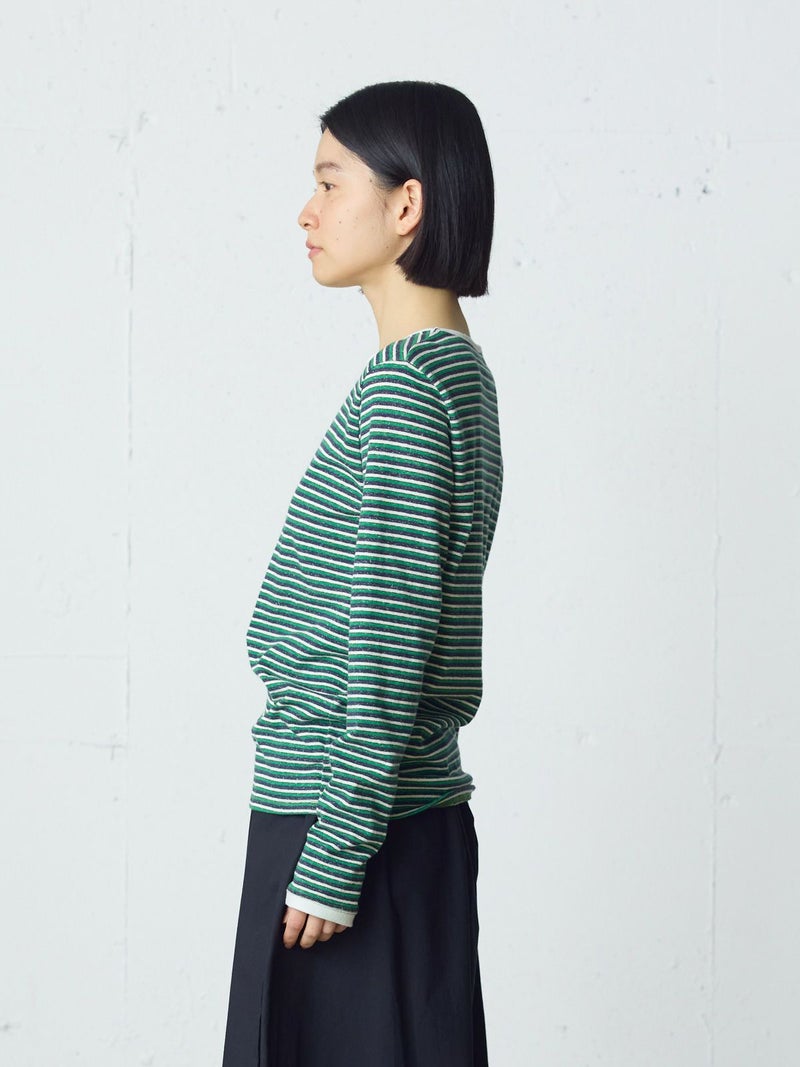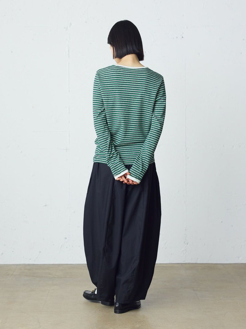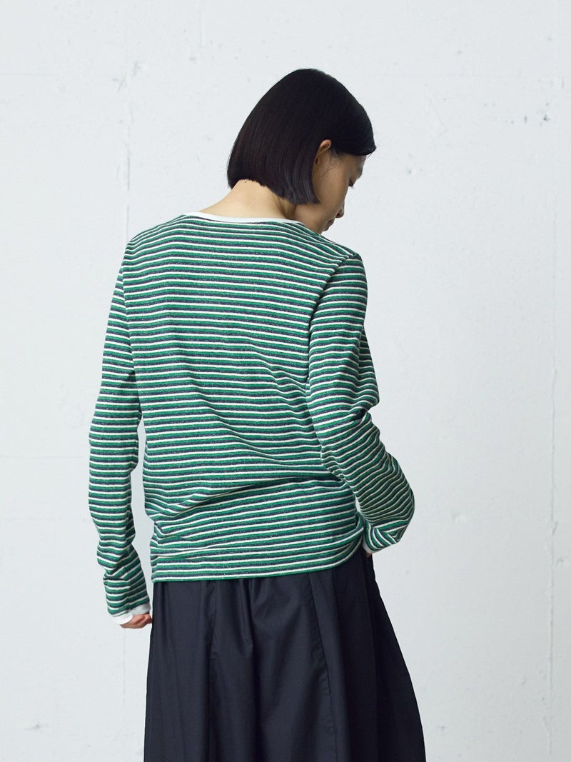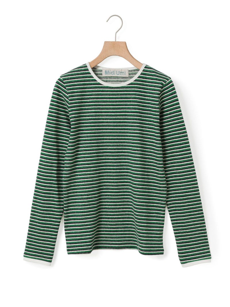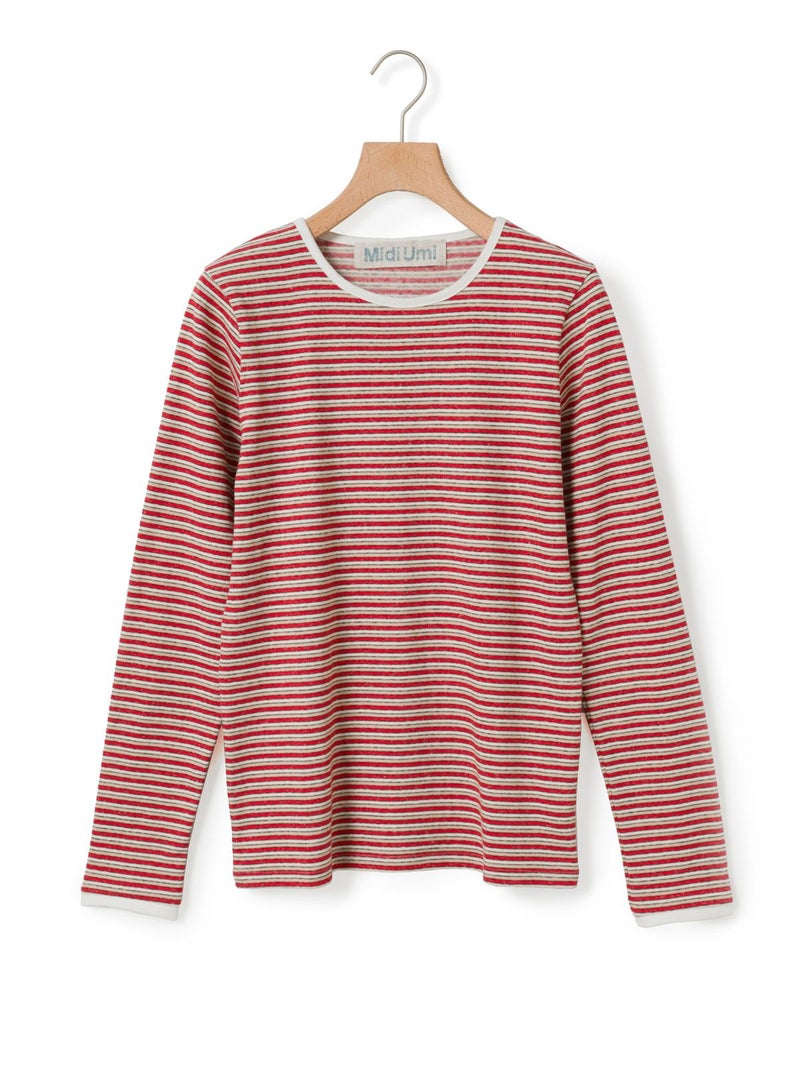 自然なムラ感が特徴のマルチボーダープルオーバーL/Sです。2本の糸を編地の表と裏に分けて編むプレーティング技法を用いてデザインしました。ボーダーの天竺素材を使用しており生地を重ねることで厚みがでて、透けづらい素材感となっています。首周りと袖口にボディと色違いの生地を輪状に補強したリンガーTのデザインが魅力的で、古着から着想を得ています。袖丈は重ね着したときように少し長めに仕上げました。インナー使いにも重宝できます。グリーンとレッドの2色展開で同シリーズ1-710110/マルチボーダープルオーバーも展開。