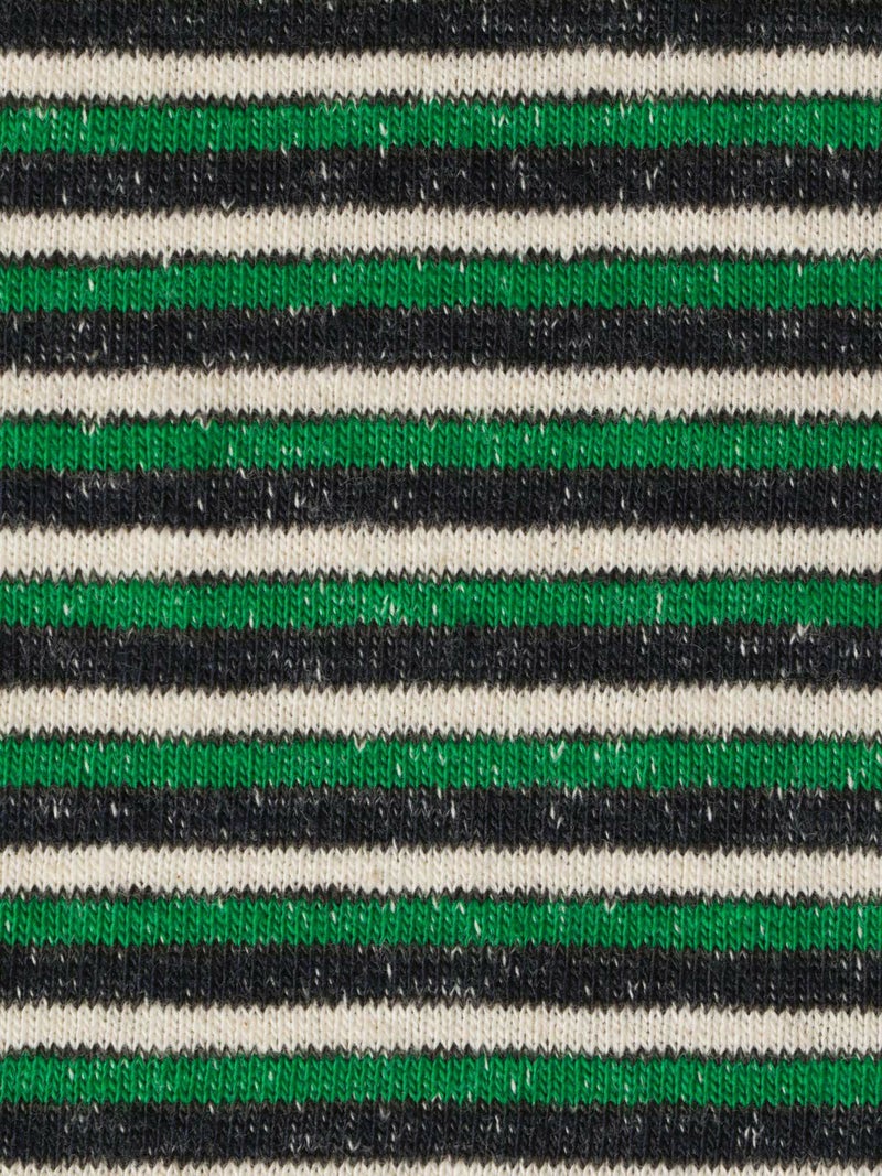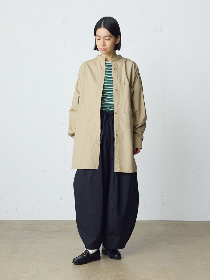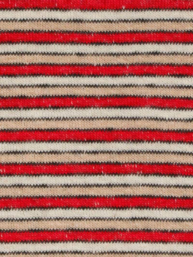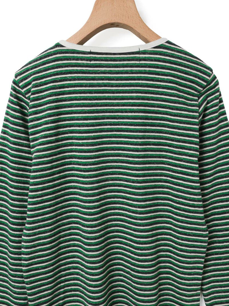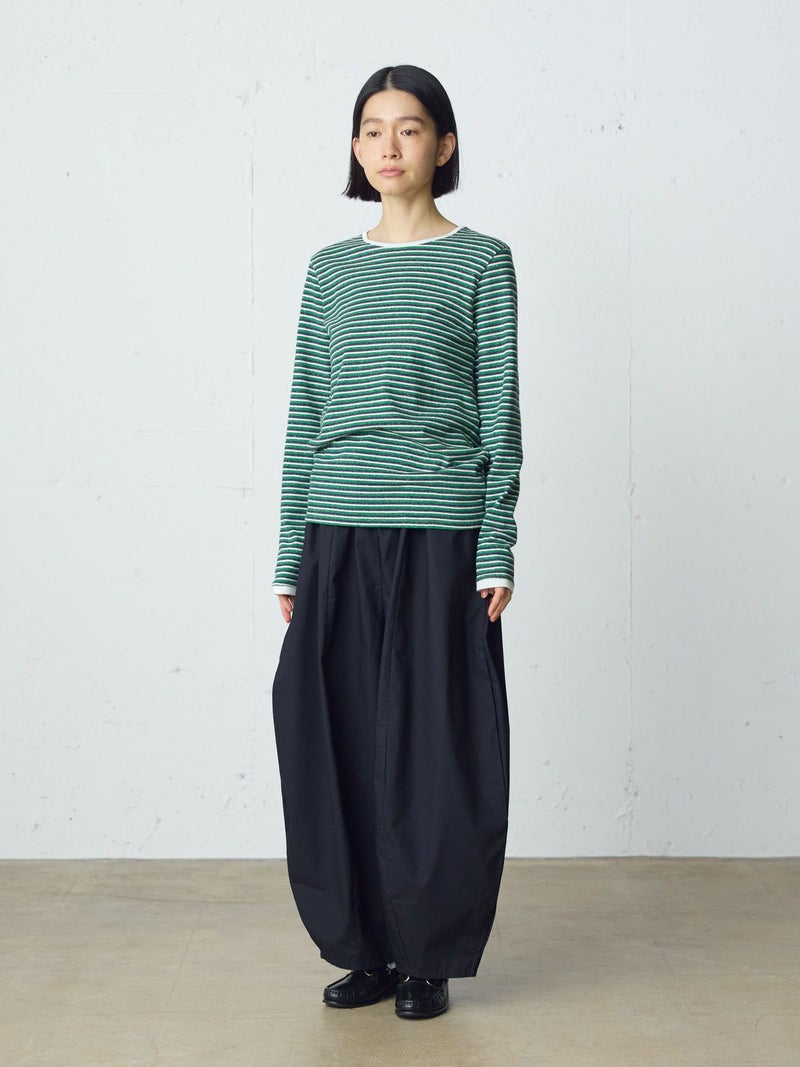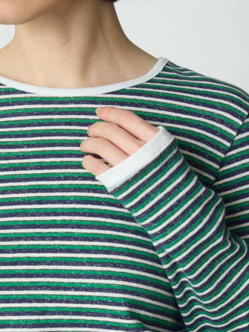自然なムラ感が特徴のマルチボーダープルオーバーL/Sです。2本の糸を編地の表と裏に分けて編むプレーティング技法を用いてデザインしました。ボーダーの天竺素材を使用しており生地を重ねることで厚みがでて、透けづらい素材感となっています。首周りと袖口にボディと色違いの生地を輪状に補強したリンガーTのデザインが魅力的で、古着から着想を得ています。袖丈は重ね着したときように少し長めに仕上げました。インナー使いにも重宝できます。グリーンとレッドの2色展開で同シリーズ1-710110/マルチボーダープルオーバーも展開。