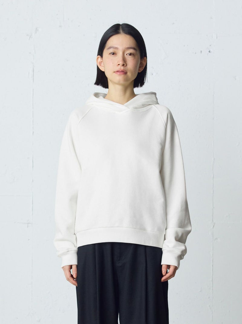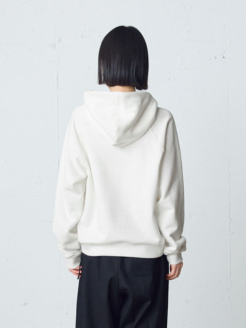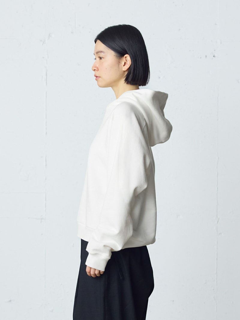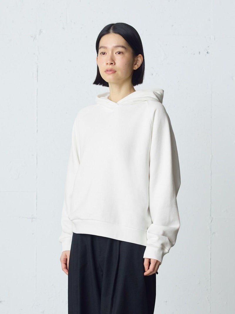 吊り裏毛を使用したスウェットアイテム、ループウィールスウェットパーカーです。和歌山にある旧式の吊り編み機を使用し、ゆっくりと空気を含みながら編まれていることで糸に負担をかけず、独特の柔らかさを楽しんでいただけるアイテムです。高速編み機で作ったものと違いふっくらと柔らかい着心地を体感していただけます。そのため型崩れしにくく、丈夫で長持ちする特性もあります。ラグランスリーブのパーカーのデザインで、良き古着のサイズ感から着想しています。重ね着ができ、ベーシックに着こなせる1枚です。 1-710126/ループウィールスウェットプルオーバーも展開。