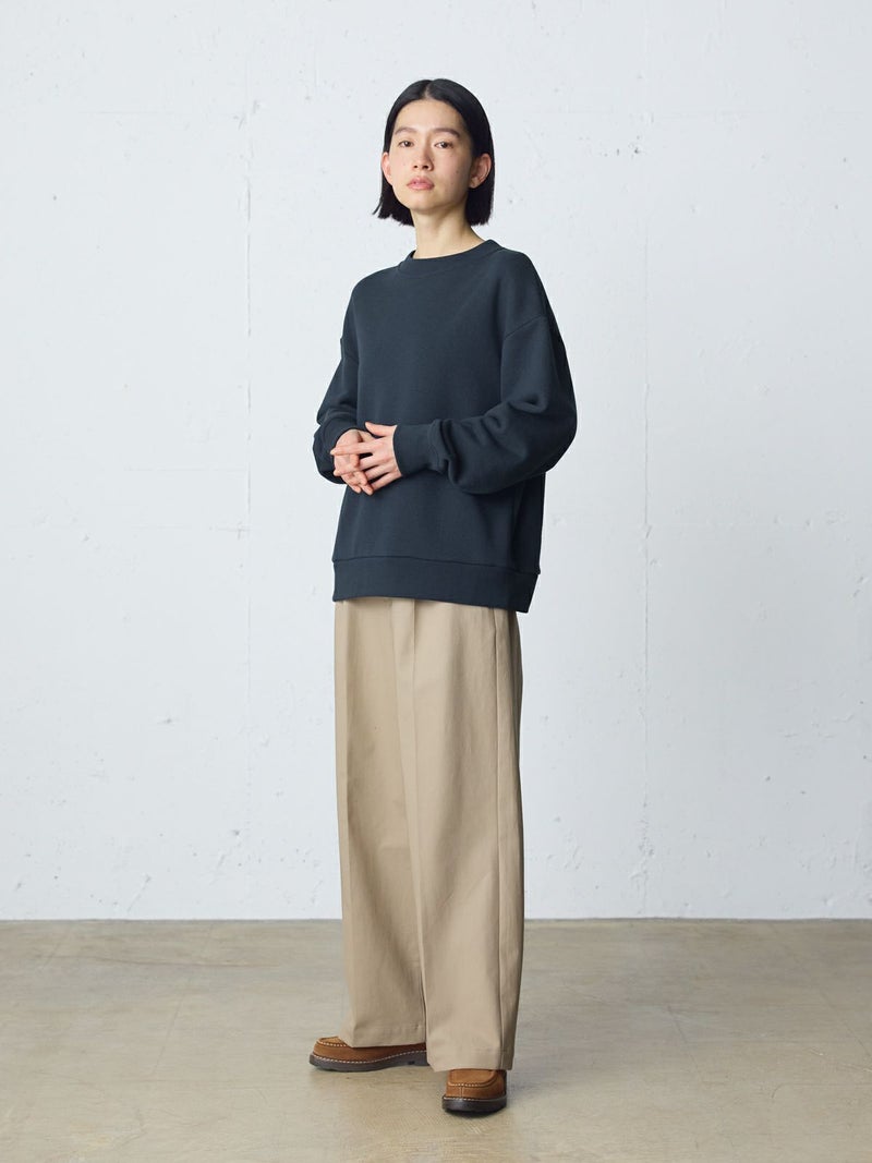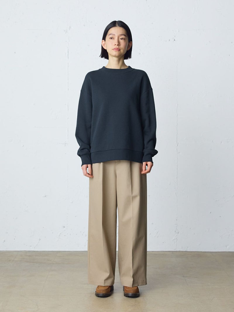 吊り裏毛を使用したスウェットアイテム、ループウィールスウェットプルオーバーです。和歌山にある旧式の吊り編み機を使用し、ゆっくりと空気を含みながら編まれていることで糸に負担をかけず、独特の柔らかさを楽しんでいただけるアイテムです。高速編み機で作ったものと違いふっくらと柔らかい着心地を体感していただけます。そのため型崩れしにくく、丈夫で長持ちする特性もあります。ややコンパクトなサイズ感で、良き古着のサイズ感から着想しています。重ね着ができ、ベーシックに着こなせる1枚です。 1-710125/ループウィールスウェットパーカーループウィールスウェットプルオーバーも展開。