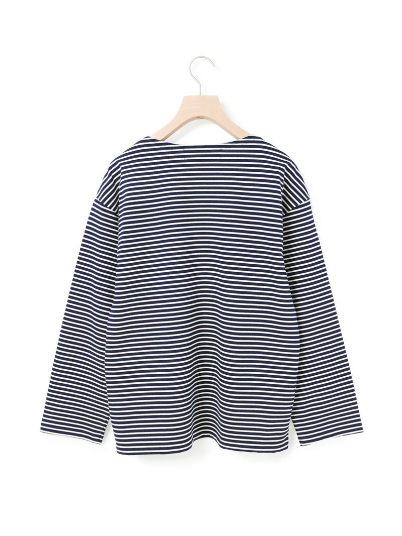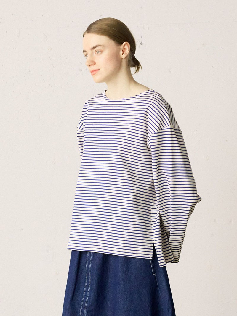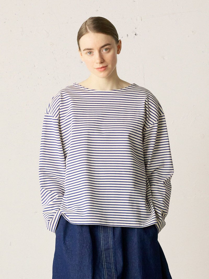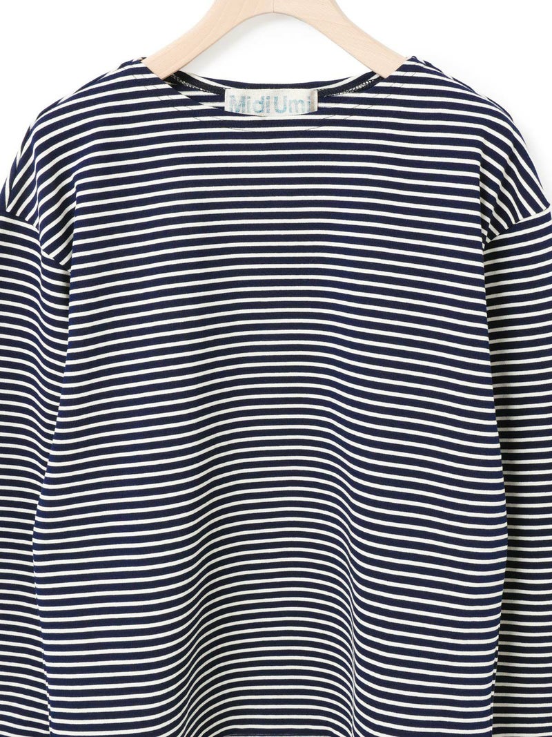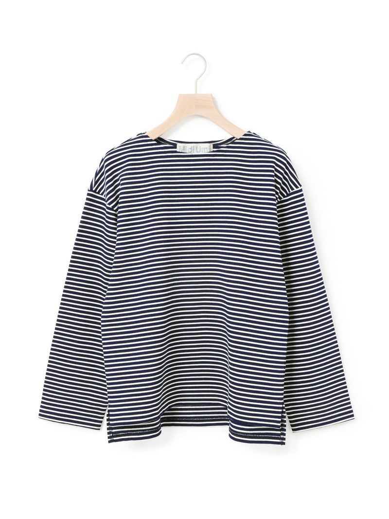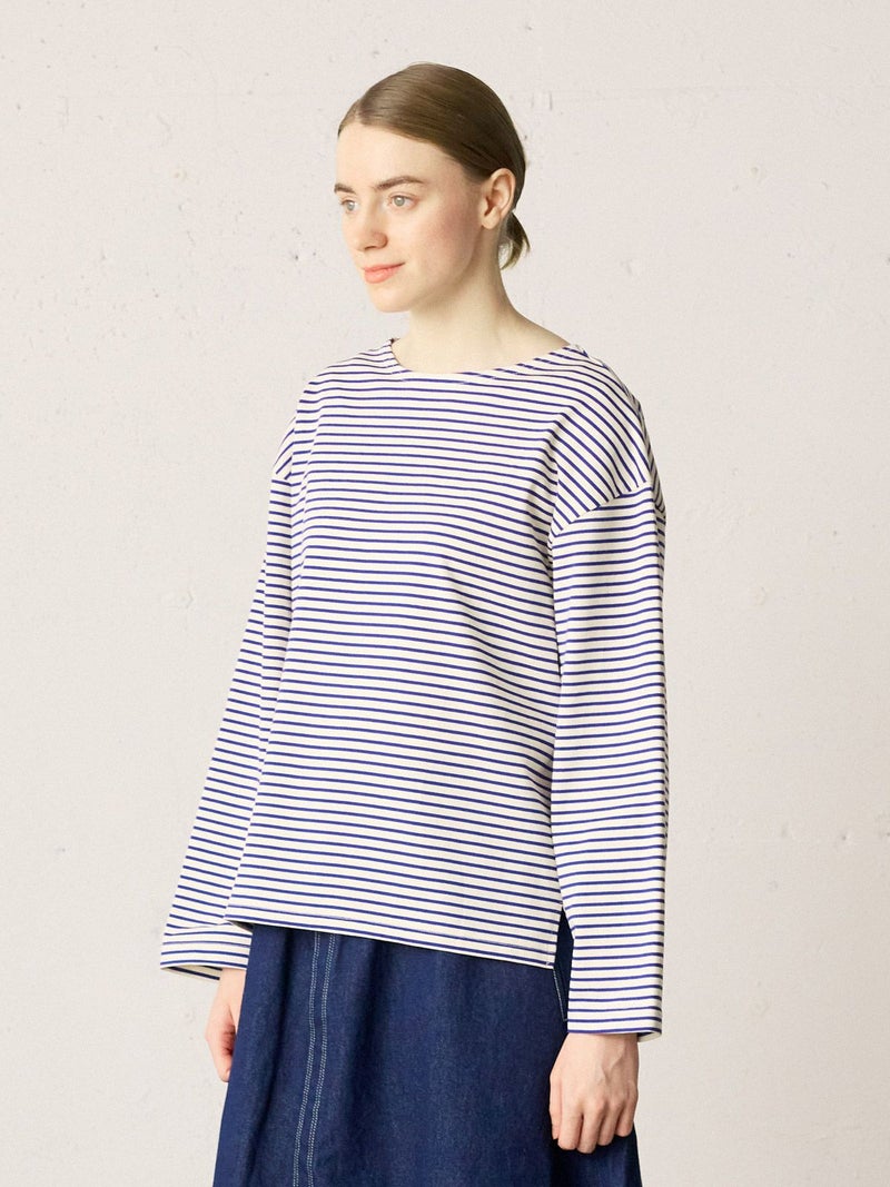 糸を引き揃えて編まれたボーダー天竺素材を使用したボーダーTシャツです。透け感が無くキレイな目面が特徴。今回は細ピッチのボーダーでデザインした1-719790/ボーダースタンドネックカーディガンも展開。春先には爽やかに演出できる、カットソーのアイテムながらちゃんと見えするアイテムになっています。