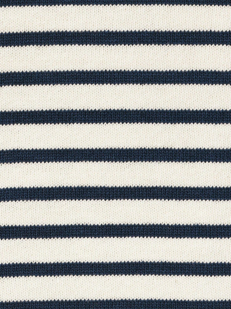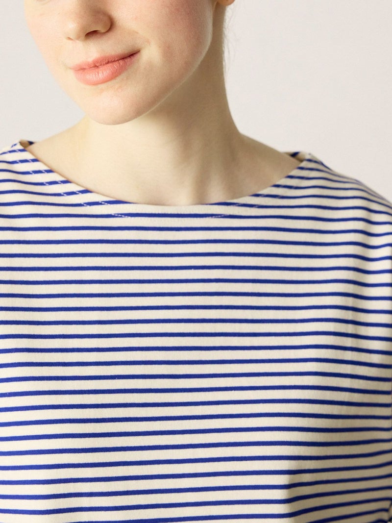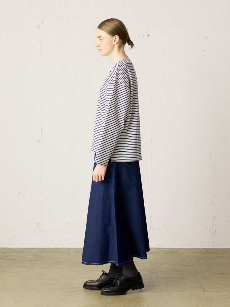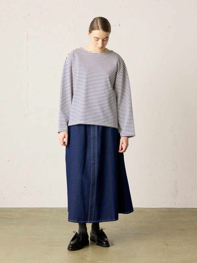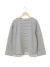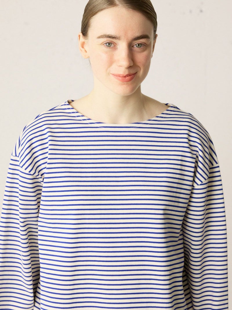 糸を引き揃えて編まれたボーダー天竺素材を使用したボーダーTシャツです。透け感が無くキレイな目面が特徴。今回は細ピッチのボーダーでデザインした1-719790/ボーダースタンドネックカーディガンも展開。春先には爽やかに演出できる、カットソーのアイテムながらちゃんと見えするアイテムになっています。