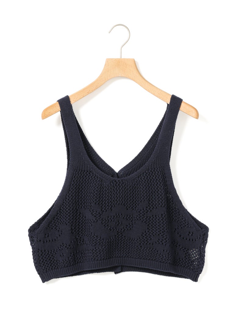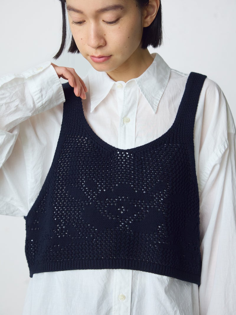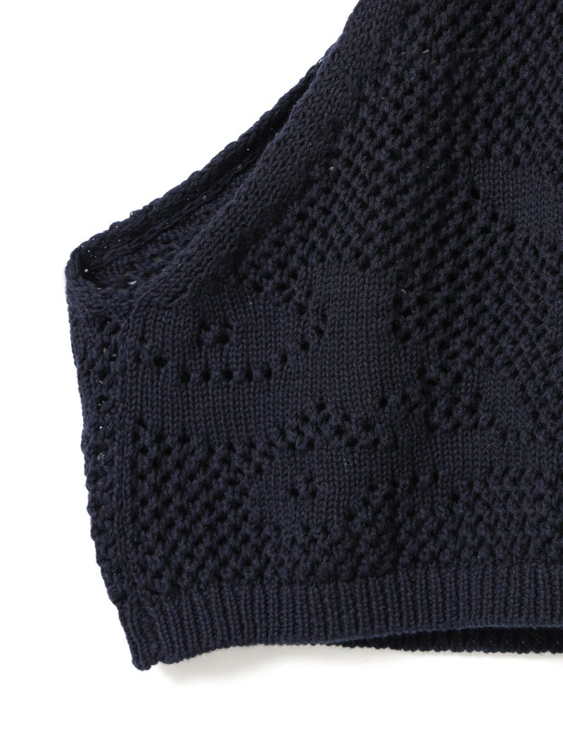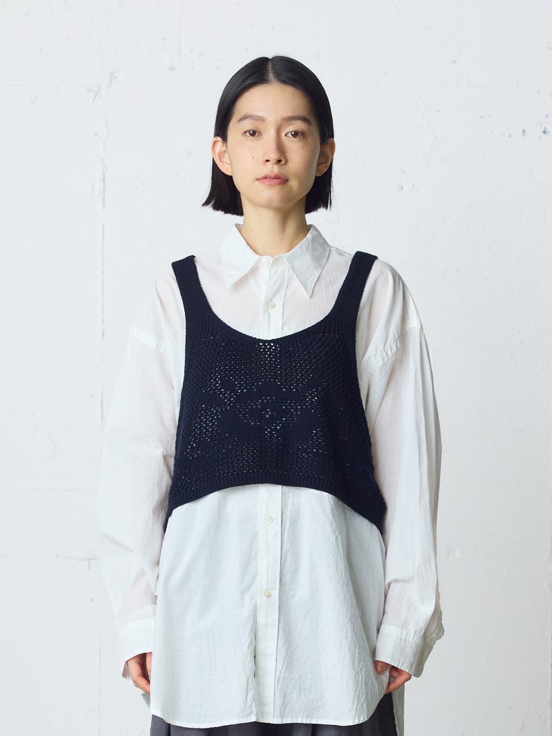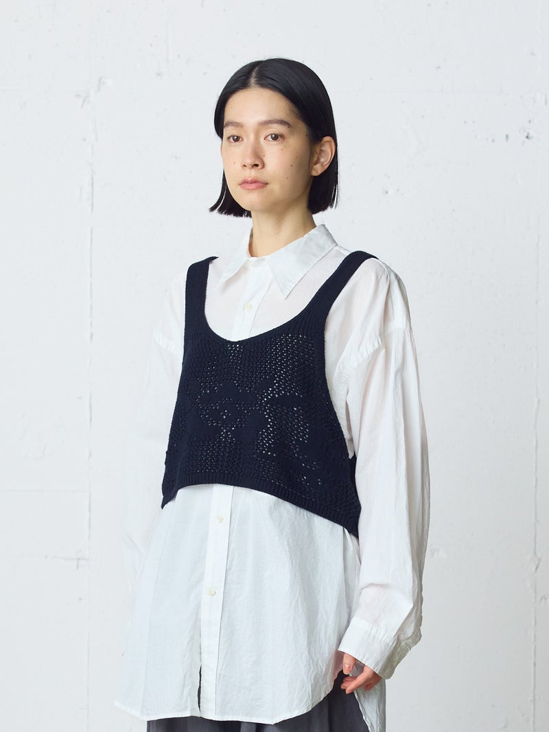 かぎ針編み風ニット、2WAYニードルワークベストです。透けて浮き出る、さりげないお花のモチーフが素敵な一枚です。前後2WAYで着用可能なニットベストで前後でお花のデザインも違うのがポイント。肩紐の細さや短い丈感でコンパクトなサイズ感を表現。アームは広くワイドなインナーを重ねても袖周りの窮屈さはありません。透け感のあるニット生地なので、色柄の重ねも楽しんでいただけけるベストです。コーディネートしやすいネイビーとブラックの2色展開です。