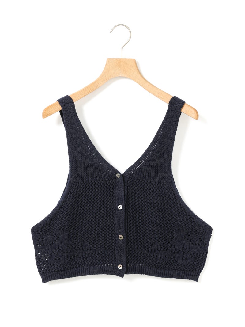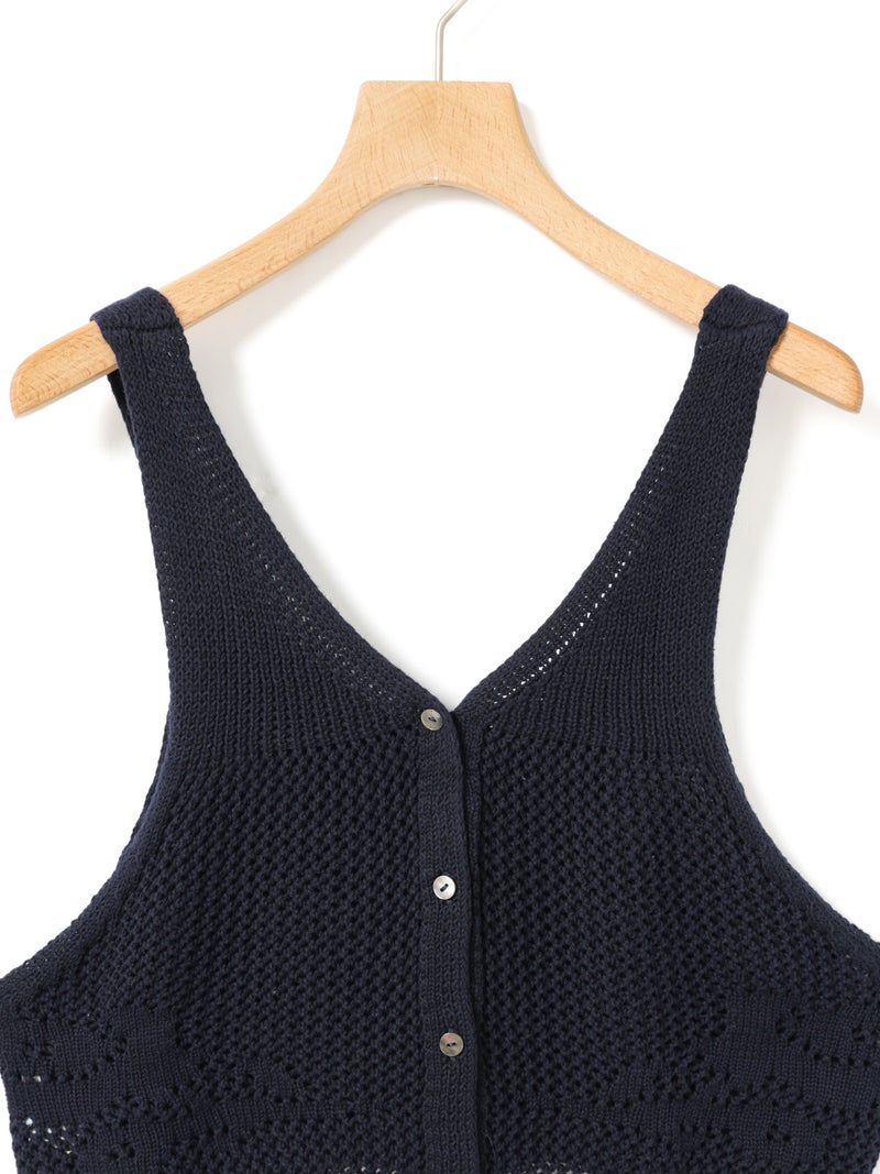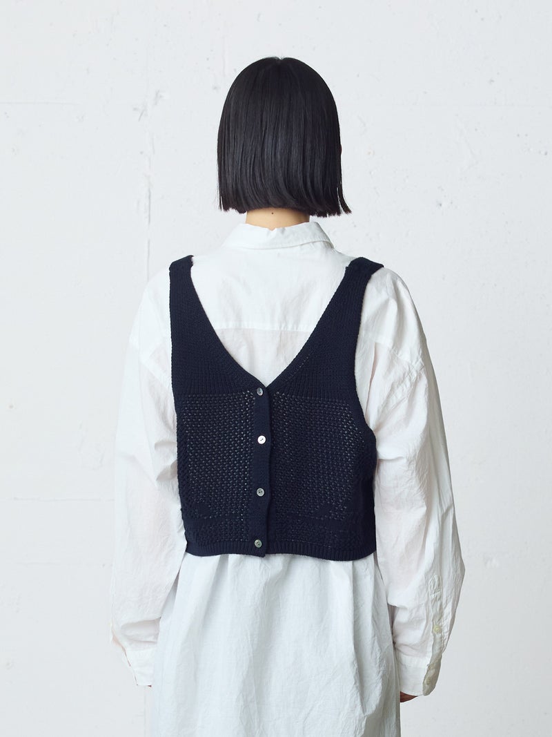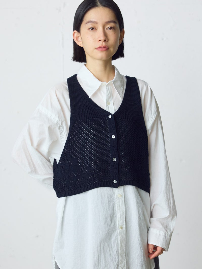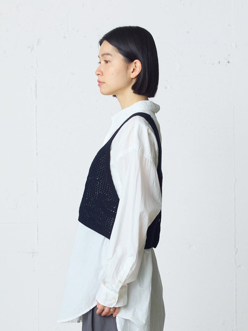 かぎ針編み風ニット、2WAYニードルワークベストです。透けて浮き出る、さりげないお花のモチーフが素敵な一枚です。前後2WAYで着用可能なニットベストで前後でお花のデザインも違うのがポイント。肩紐の細さや短い丈感でコンパクトなサイズ感を表現。アームは広くワイドなインナーを重ねても袖周りの窮屈さはありません。透け感のあるニット生地なので、色柄の重ねも楽しんでいただけけるベストです。コーディネートしやすいネイビーとブラックの2色展開です。