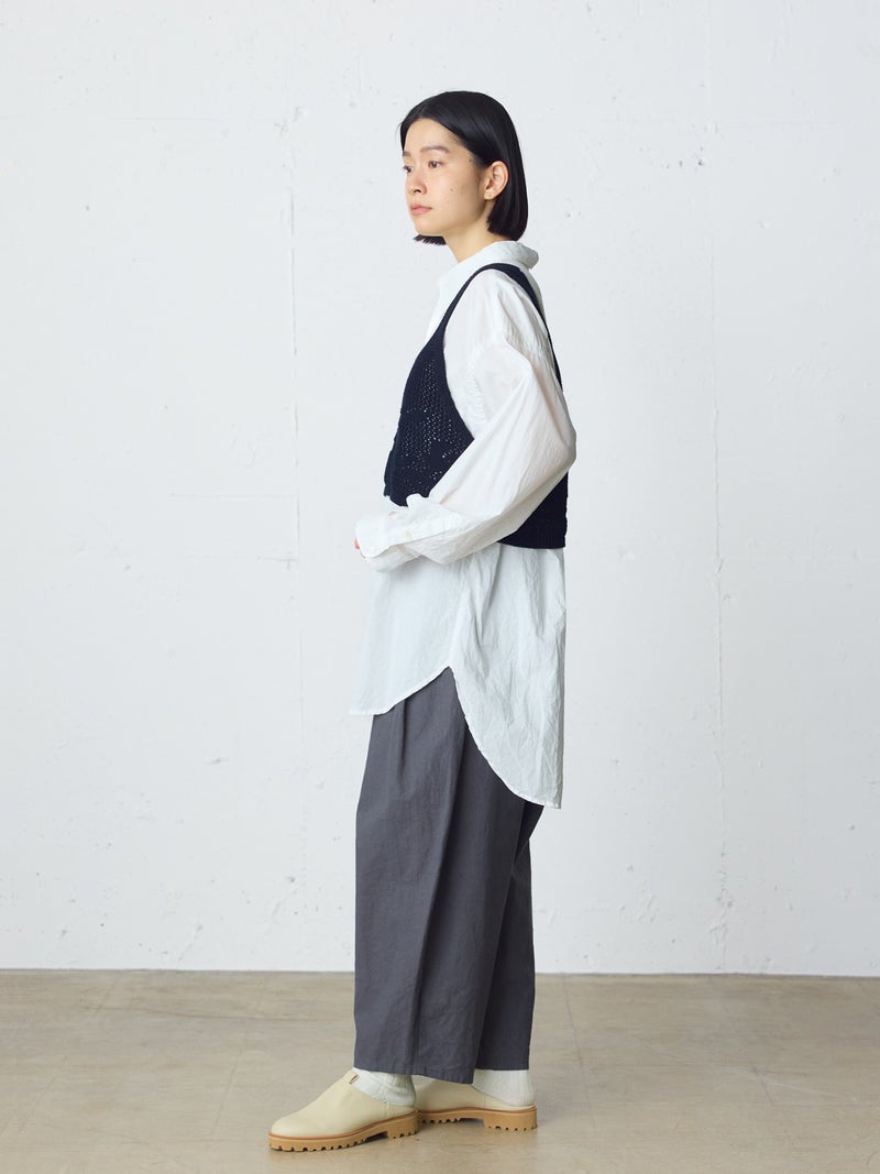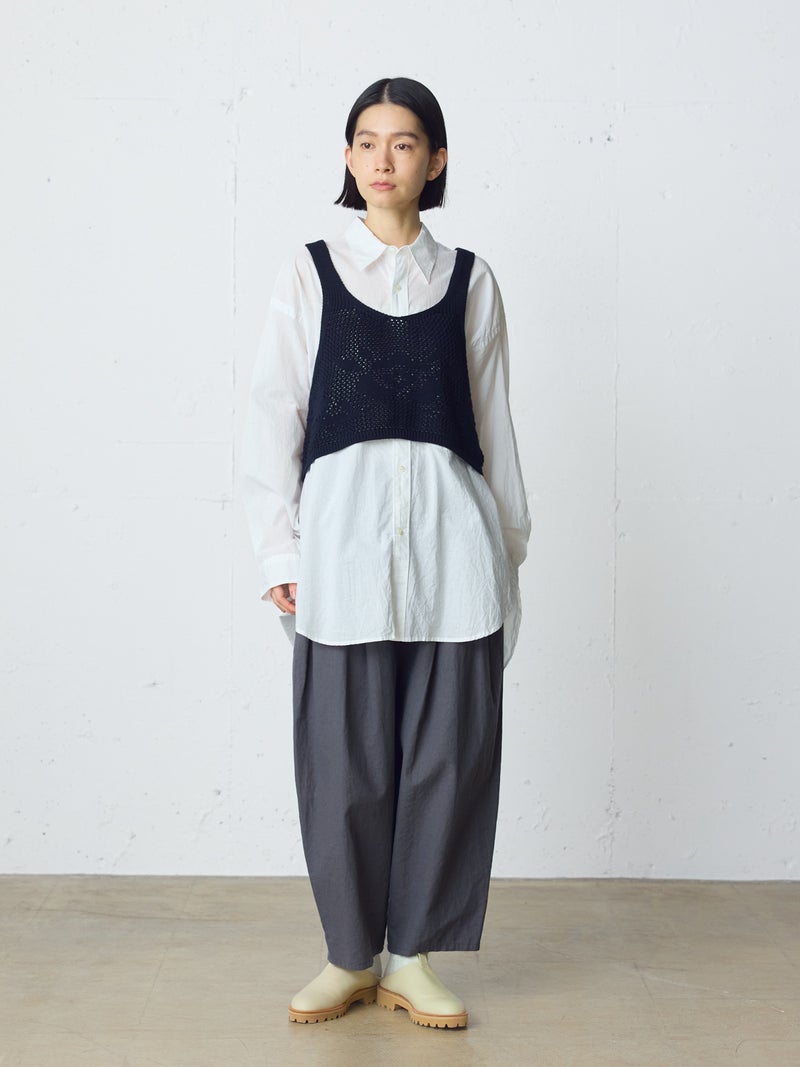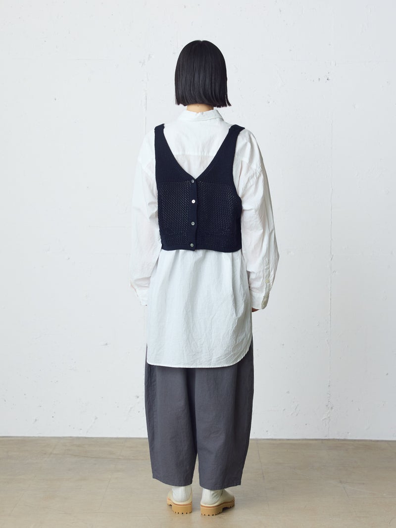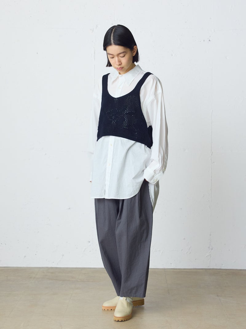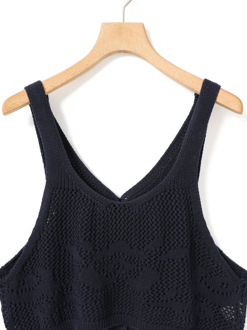 かぎ針編み風ニット、2WAYニードルワークベストです。透けて浮き出る、さりげないお花のモチーフが素敵な一枚です。前後2WAYで着用可能なニットベストで前後でお花のデザインも違うのがポイント。肩紐の細さや短い丈感でコンパクトなサイズ感を表現。アームは広くワイドなインナーを重ねても袖周りの窮屈さはありません。透け感のあるニット生地なので、色柄の重ねも楽しんでいただけけるベストです。コーディネートしやすいネイビーとブラックの2色展開です。
