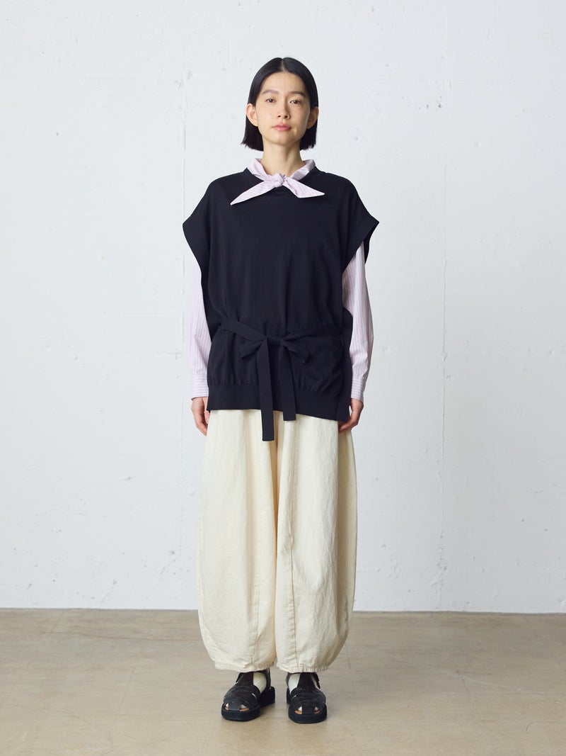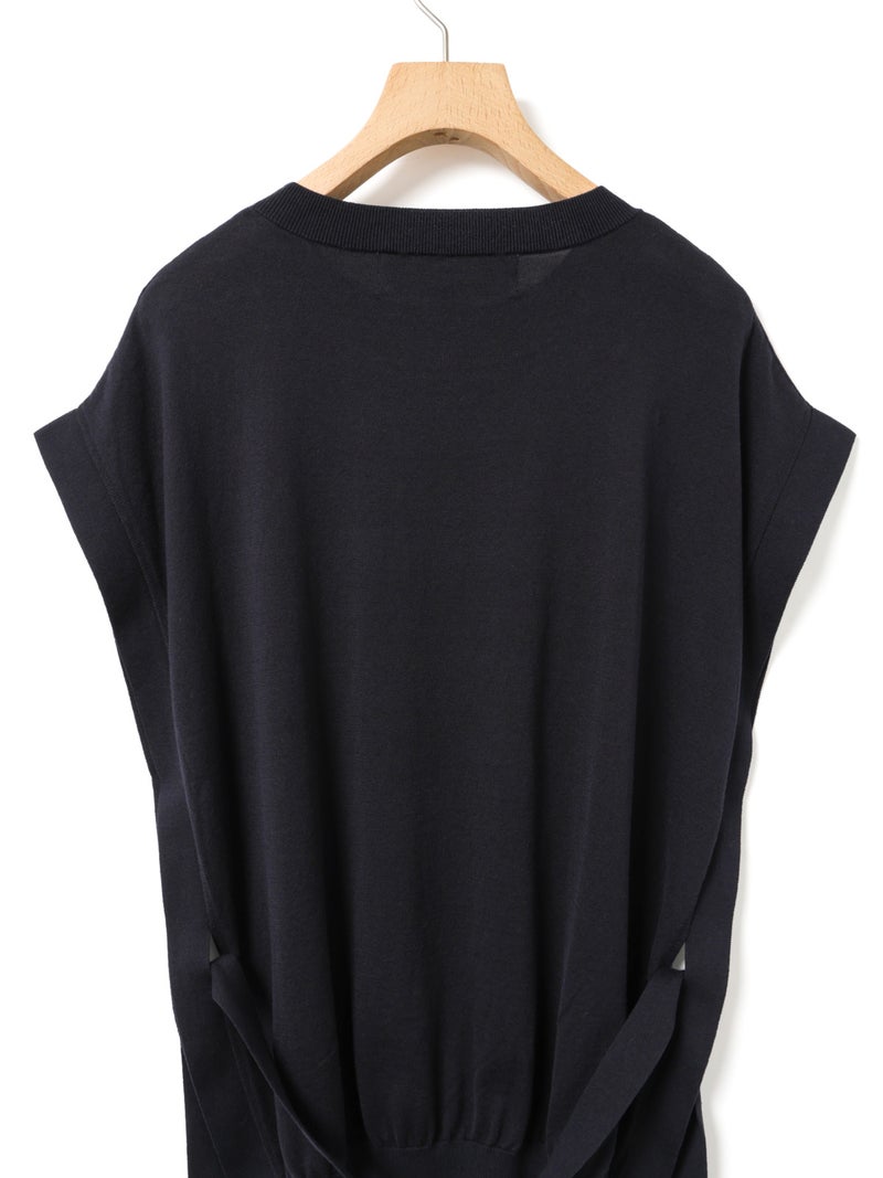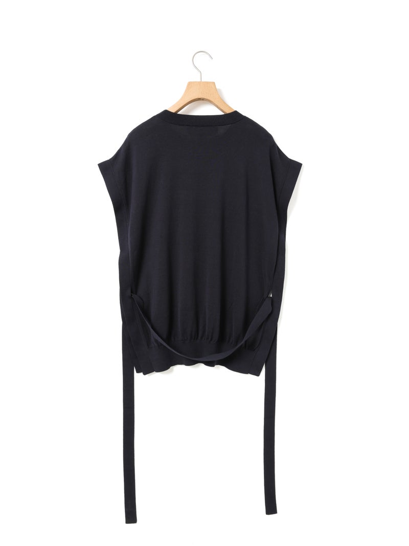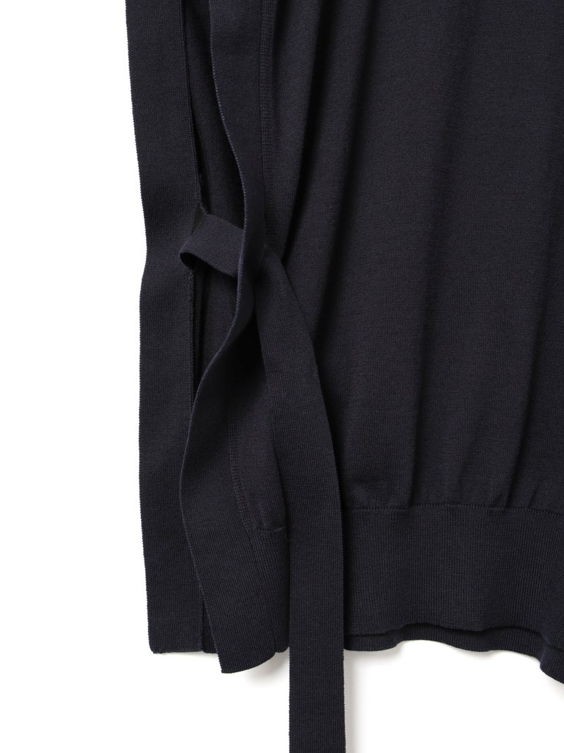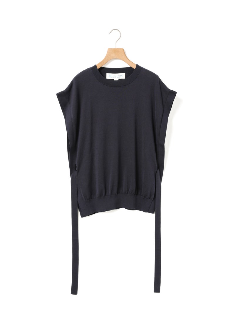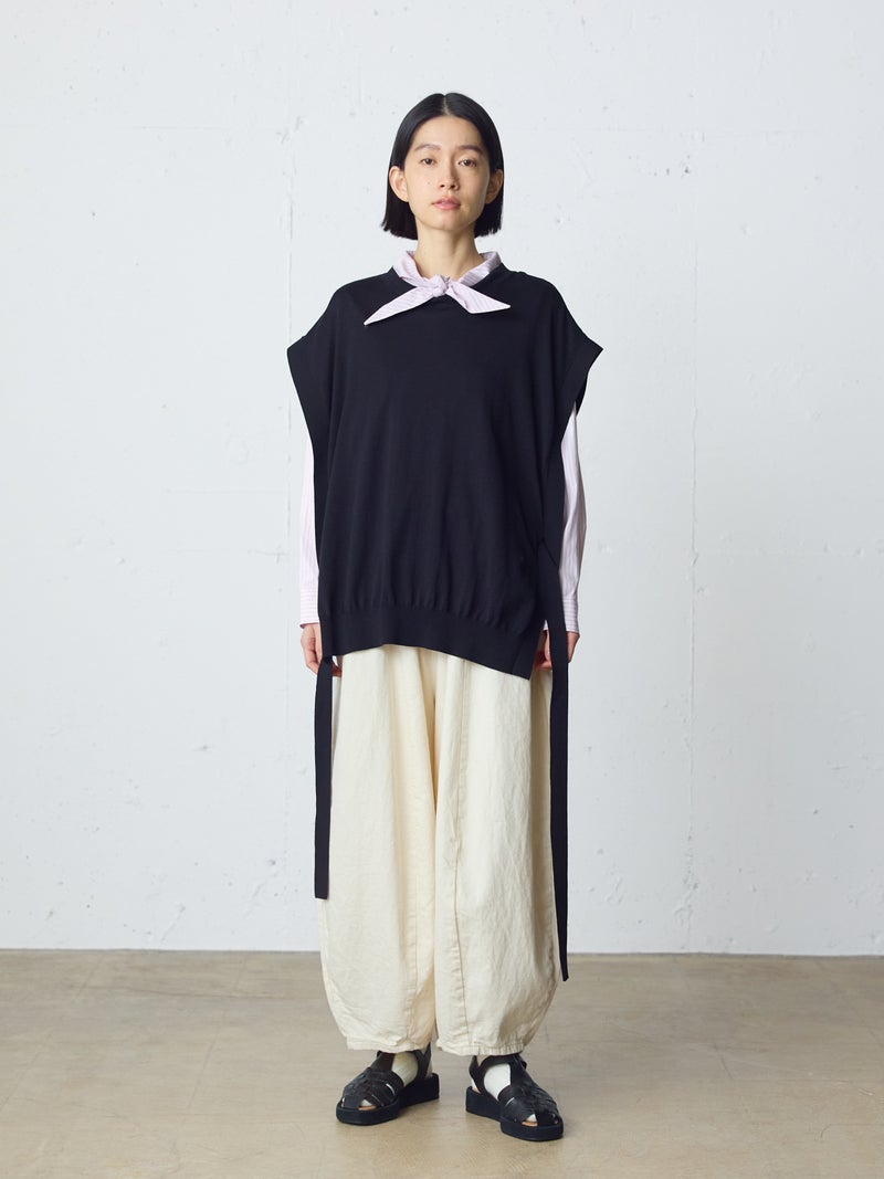 ハイゲージで編立たニットシリーズ、サイドリボンベストです。目面がキレイで毛羽も出にくい素材感が特徴。サイドは大きく開きのあるデザインで、紐が付いています。紐の使い方としてウエストマークする着方もオススメです。ゆったりとしたサイズ感で肩を包んでくれるデザインです。長袖から半袖まで季節に合わせてコーディネートが可能。コットンニットなのでお洗濯もしやすく、長く愛用いただける1枚です。同シリーズ1-720145/襟付きニットベストも展開。