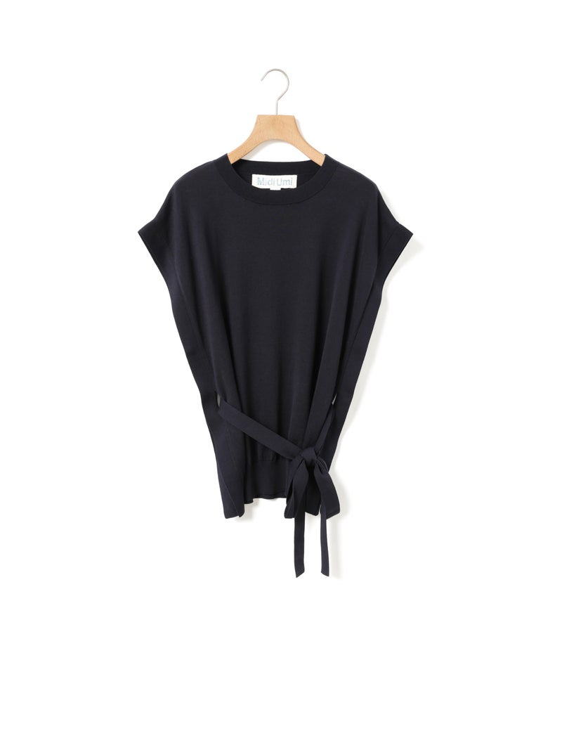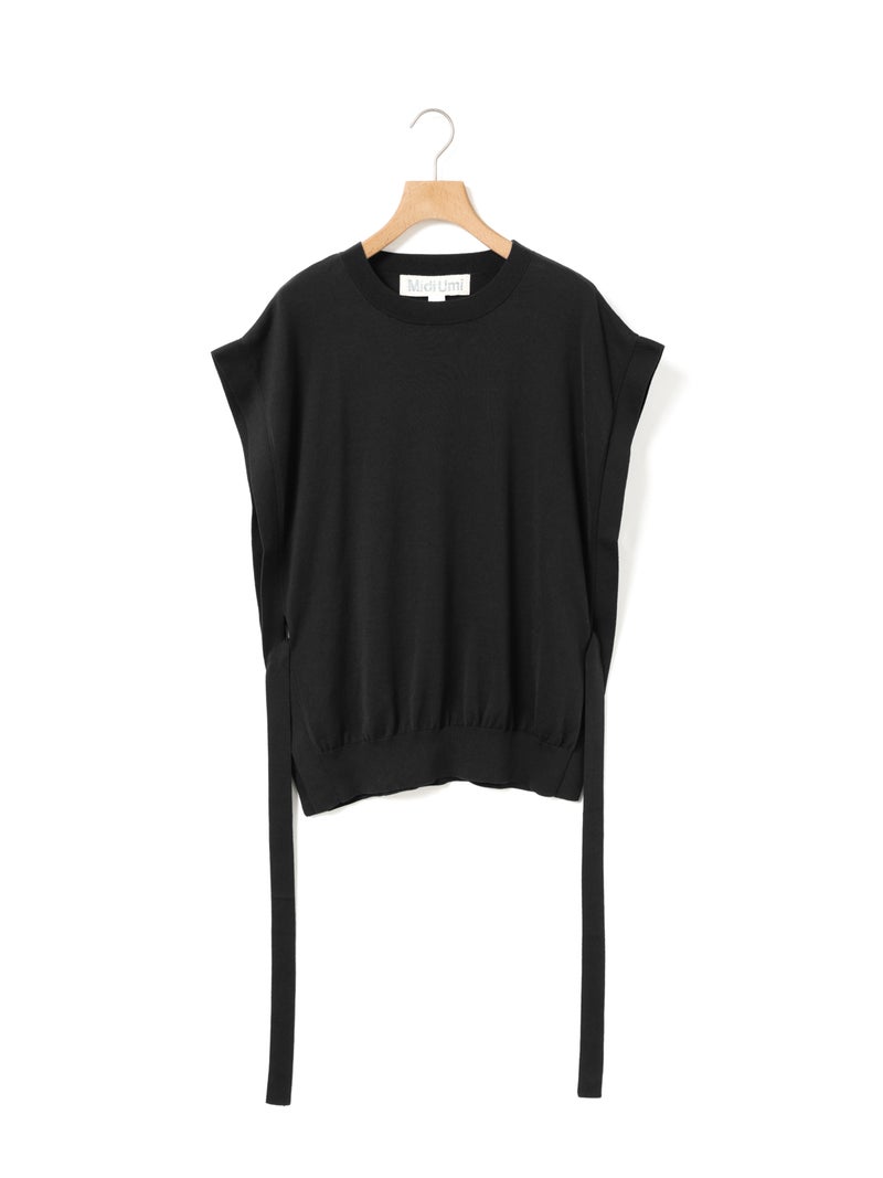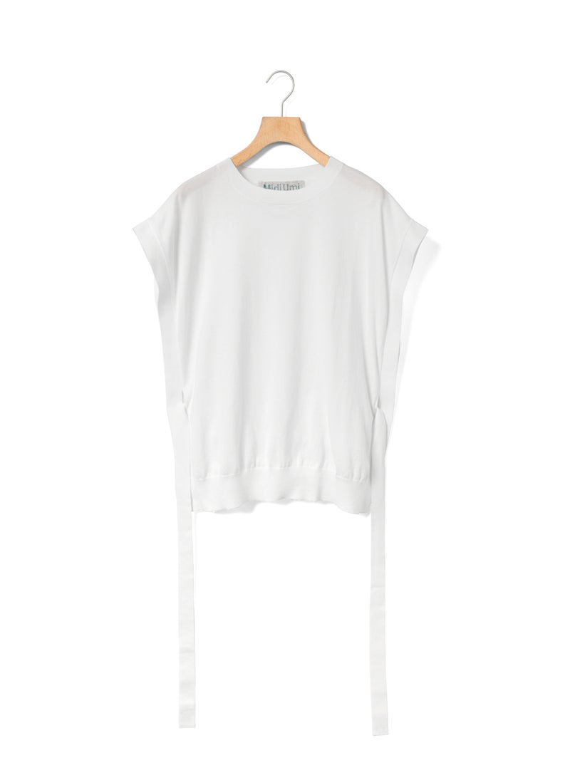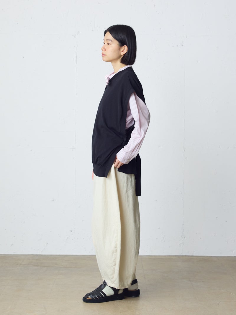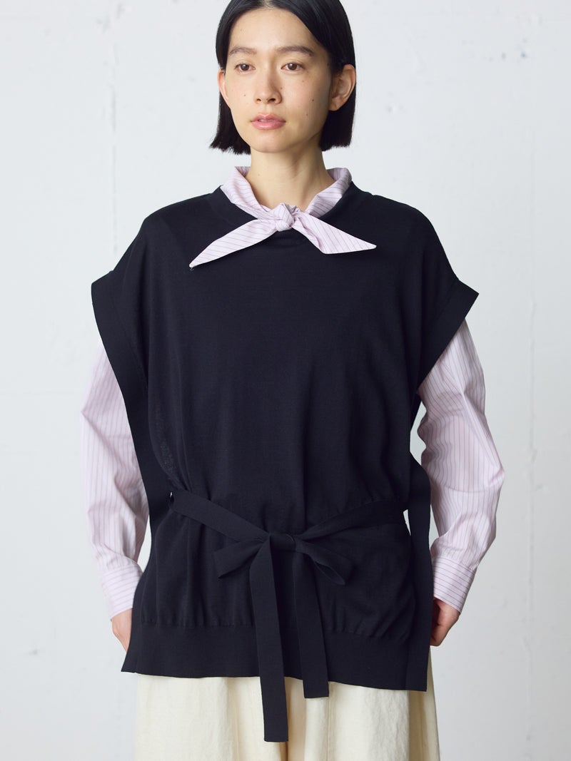 ハイゲージで編立たニットシリーズ、サイドリボンベストです。目面がキレイで毛羽も出にくい素材感が特徴。サイドは大きく開きのあるデザインで、紐が付いています。紐の使い方としてウエストマークする着方もオススメです。ゆったりとしたサイズ感で肩を包んでくれるデザインです。長袖から半袖まで季節に合わせてコーディネートが可能。コットンニットなのでお洗濯もしやすく、長く愛用いただける1枚です。同シリーズ1-720145/襟付きニットベストも展開。