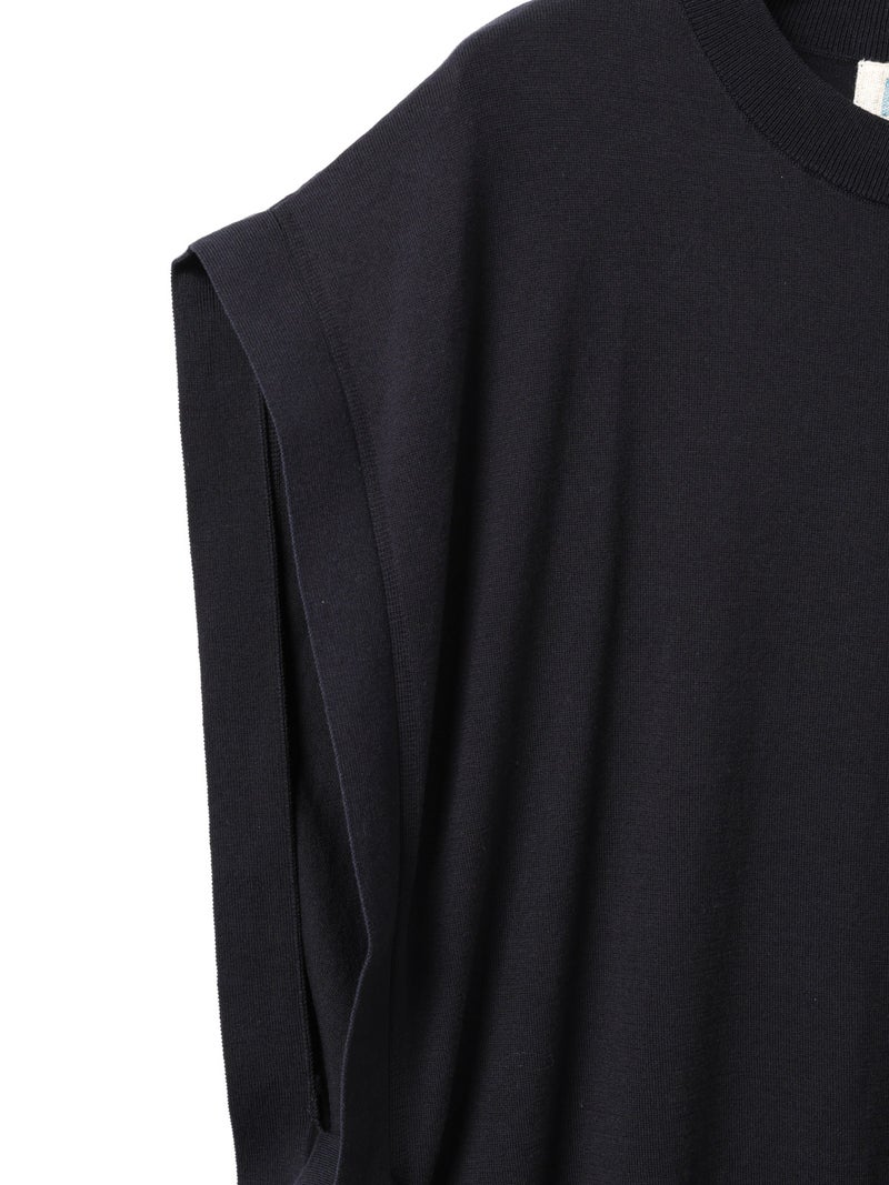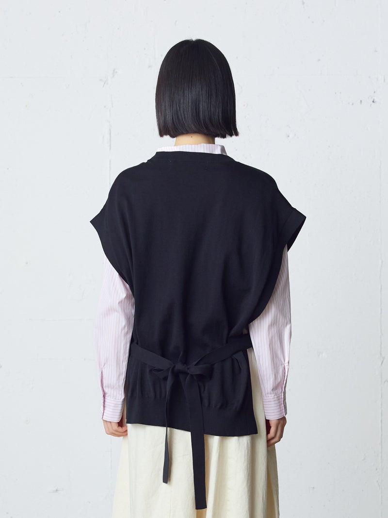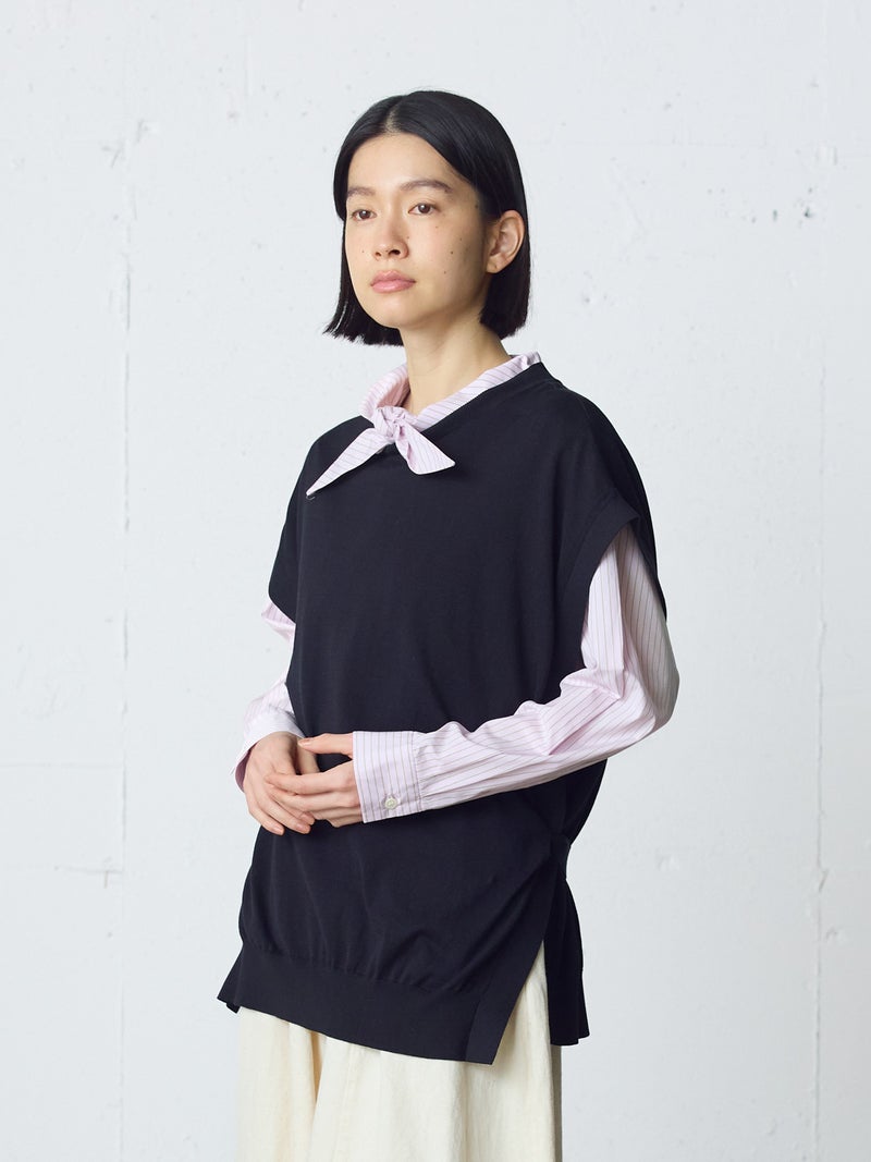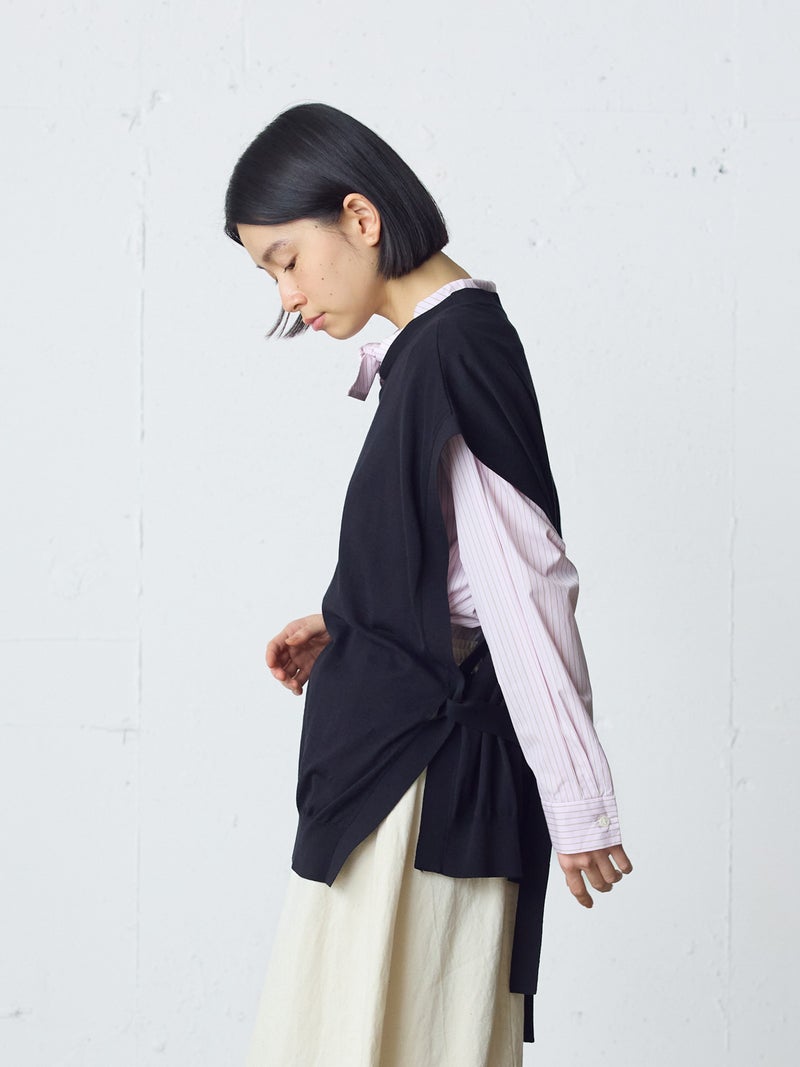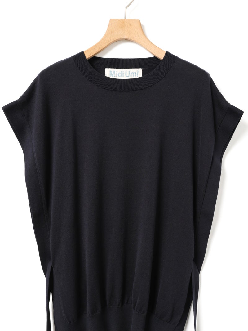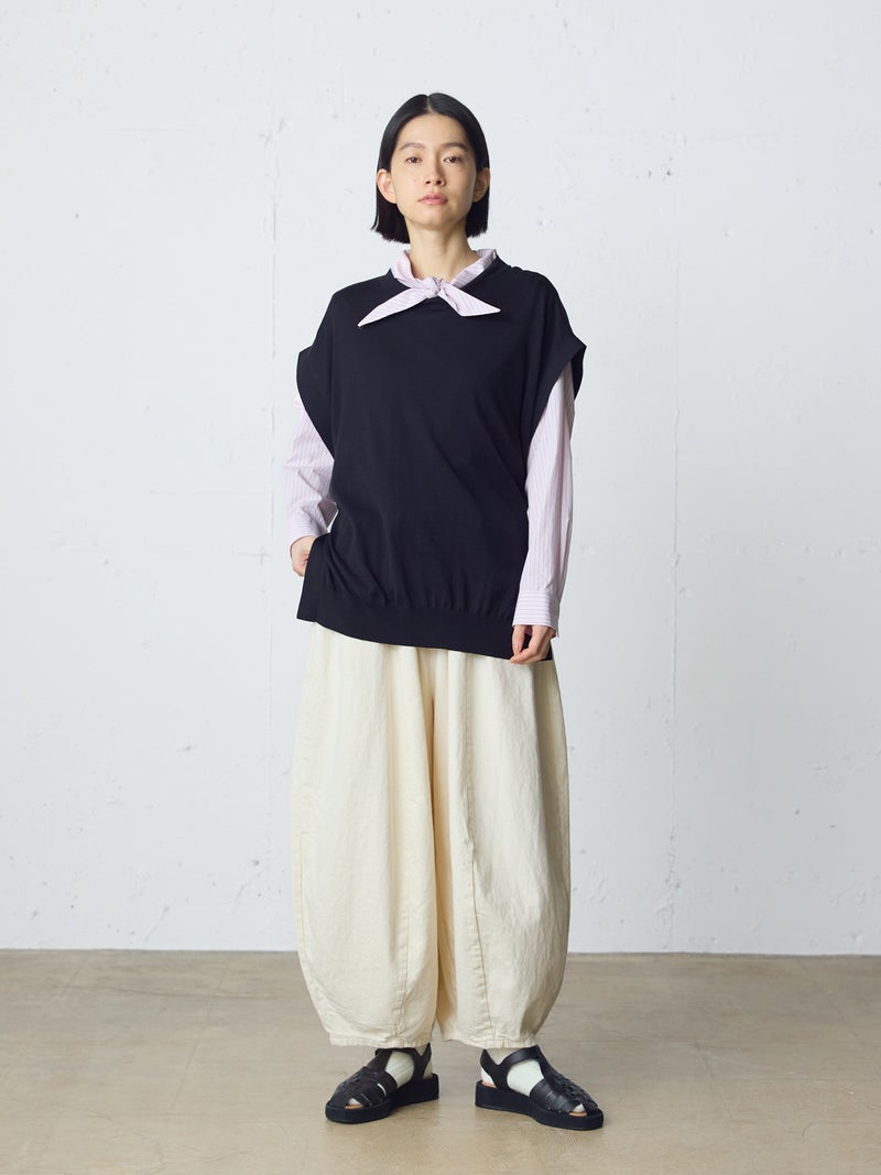 ハイゲージで編立たニットシリーズ、サイドリボンベストです。目面がキレイで毛羽も出にくい素材感が特徴。サイドは大きく開きのあるデザインで、紐が付いています。紐の使い方としてウエストマークする着方もオススメです。ゆったりとしたサイズ感で肩を包んでくれるデザインです。長袖から半袖まで季節に合わせてコーディネートが可能。コットンニットなのでお洗濯もしやすく、長く愛用いただける1枚です。同シリーズ1-720145/襟付きニットベストも展開。