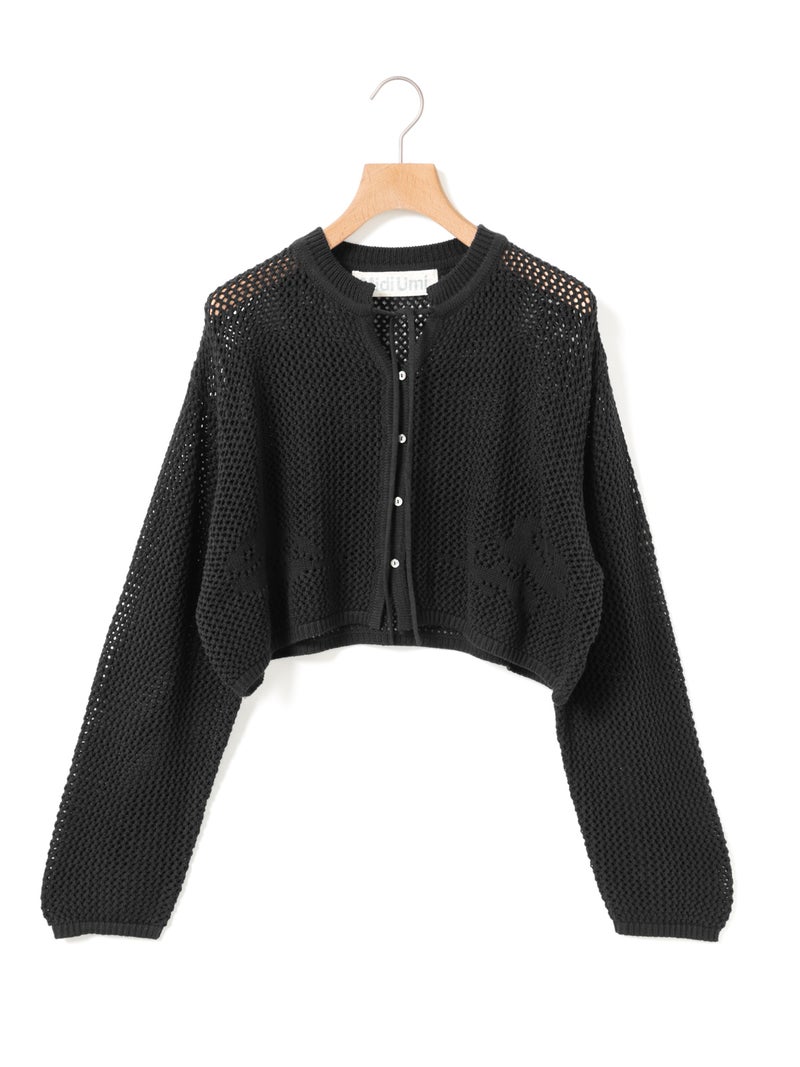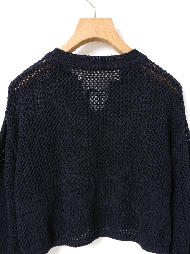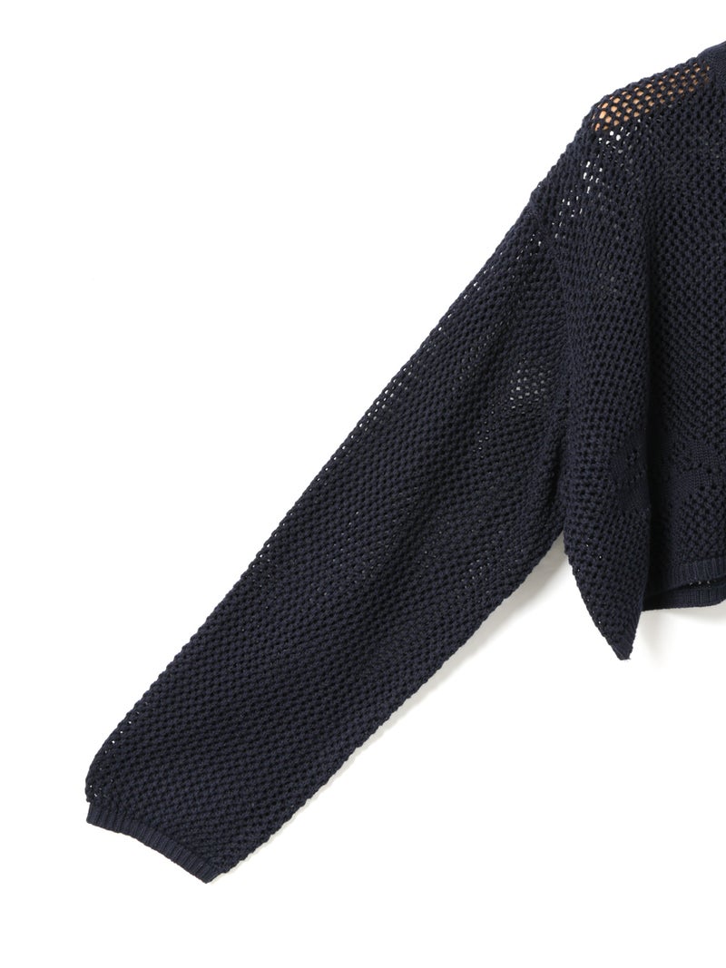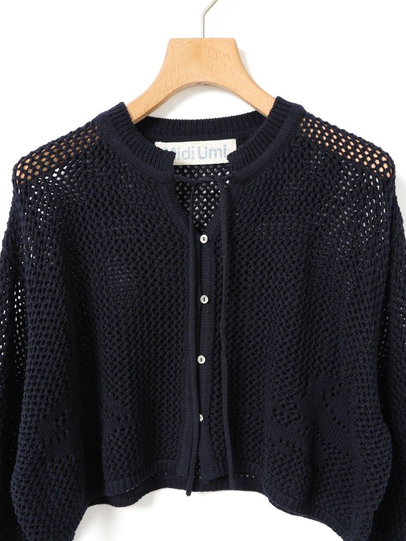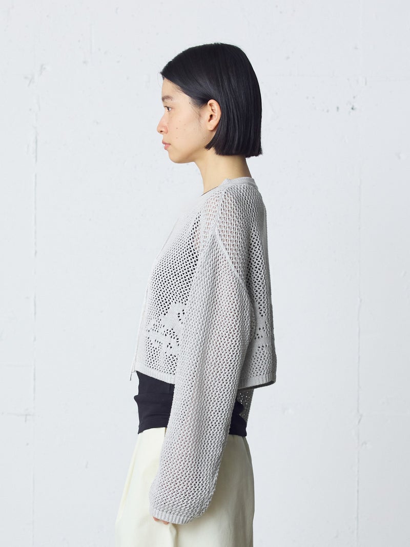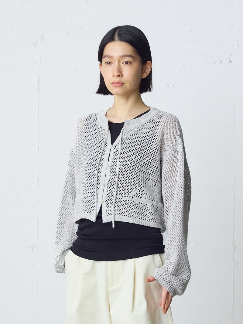 かぎ針編み風ニット、ニードルワークカーディガンです。透けて浮き出る、メッシュニットに花柄を施したし短め丈のニットカーデ。袖は少し長めのゆとりのあるデザインで、首元を結んでいただける紐付きとなっています。ノースリーブのアイテムにさりげなく羽織っていただいても素敵です。色柄の重ねも楽しんでいただけ、春先も軽やかに羽織っていただける1枚です。