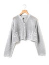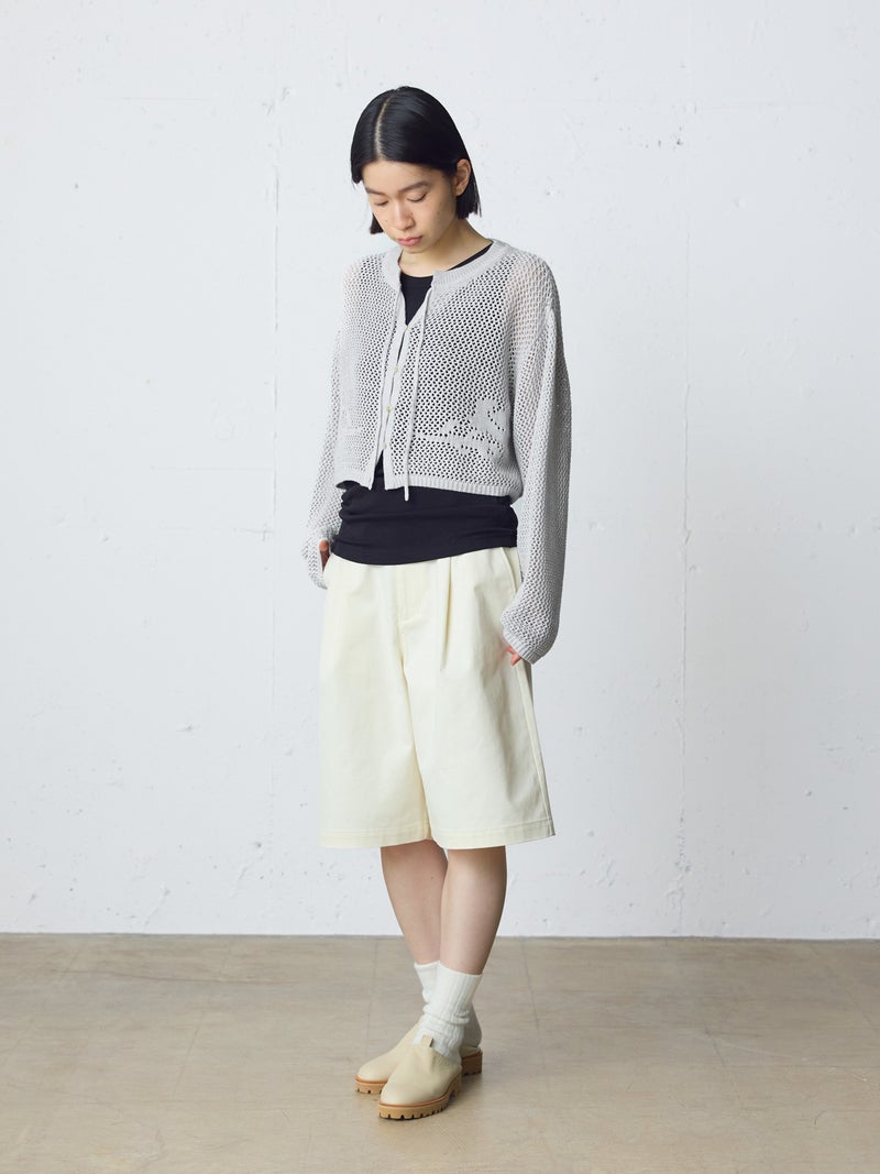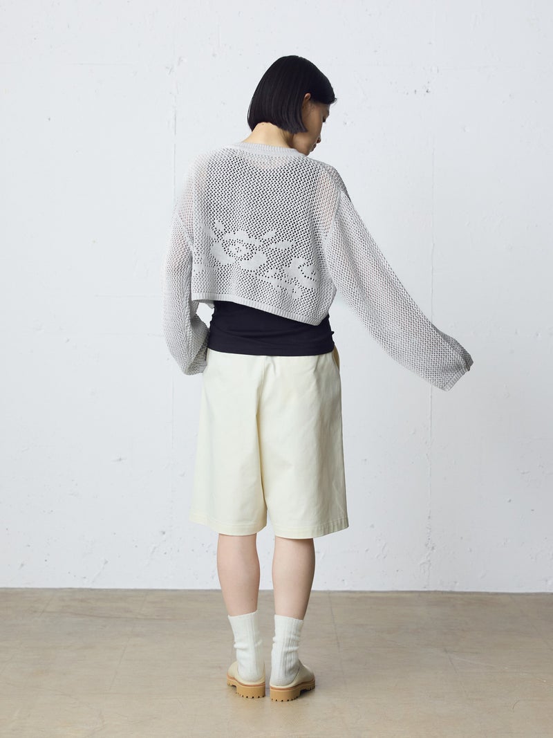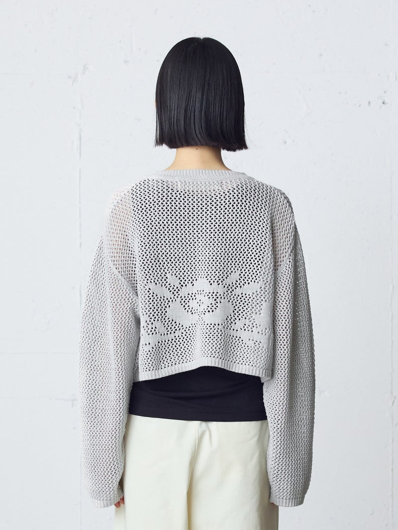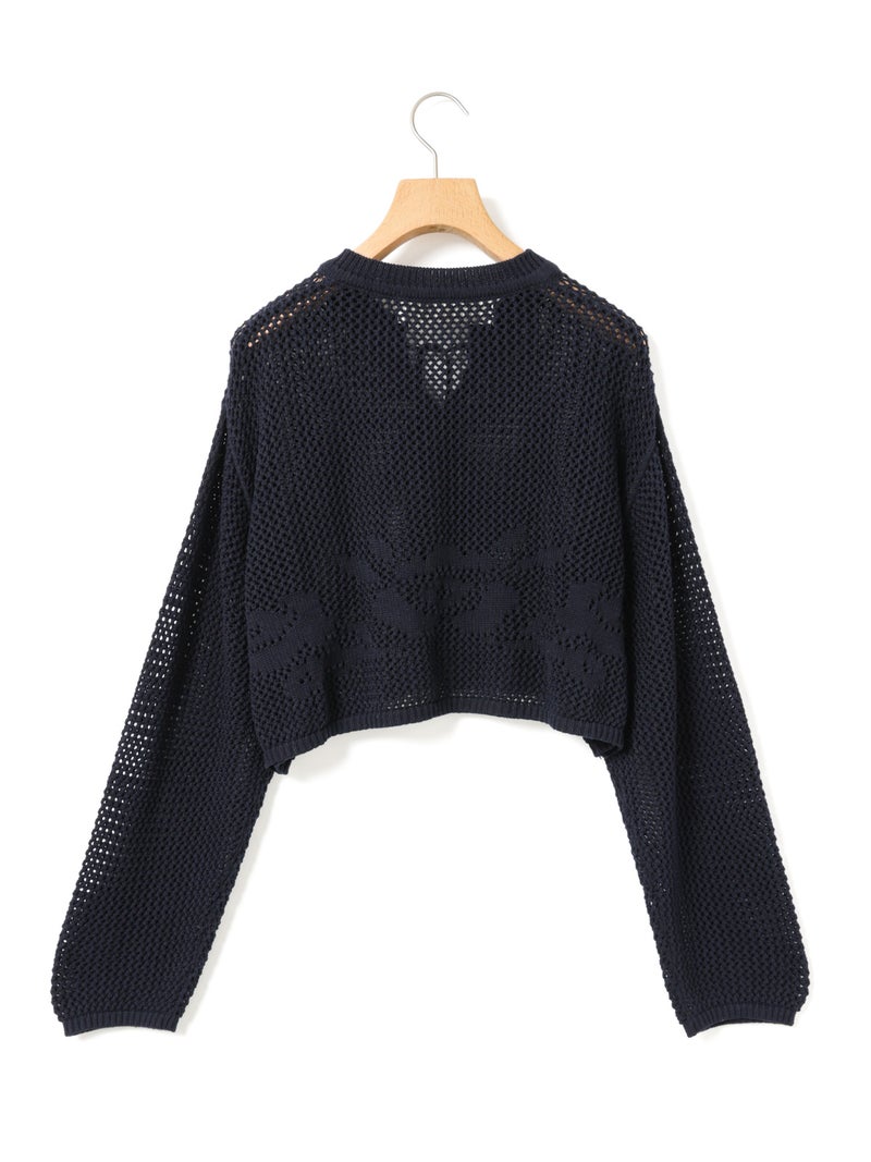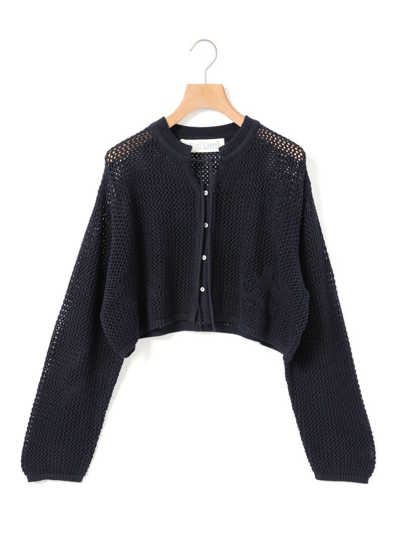 かぎ針編み風ニット、ニードルワークカーディガンです。透けて浮き出る、メッシュニットに花柄を施したし短め丈のニットカーデ。袖は少し長めのゆとりのあるデザインで、首元を結んでいただける紐付きとなっています。ノースリーブのアイテムにさりげなく羽織っていただいても素敵です。色柄の重ねも楽しんでいただけ、春先も軽やかに羽織っていただける1枚です。