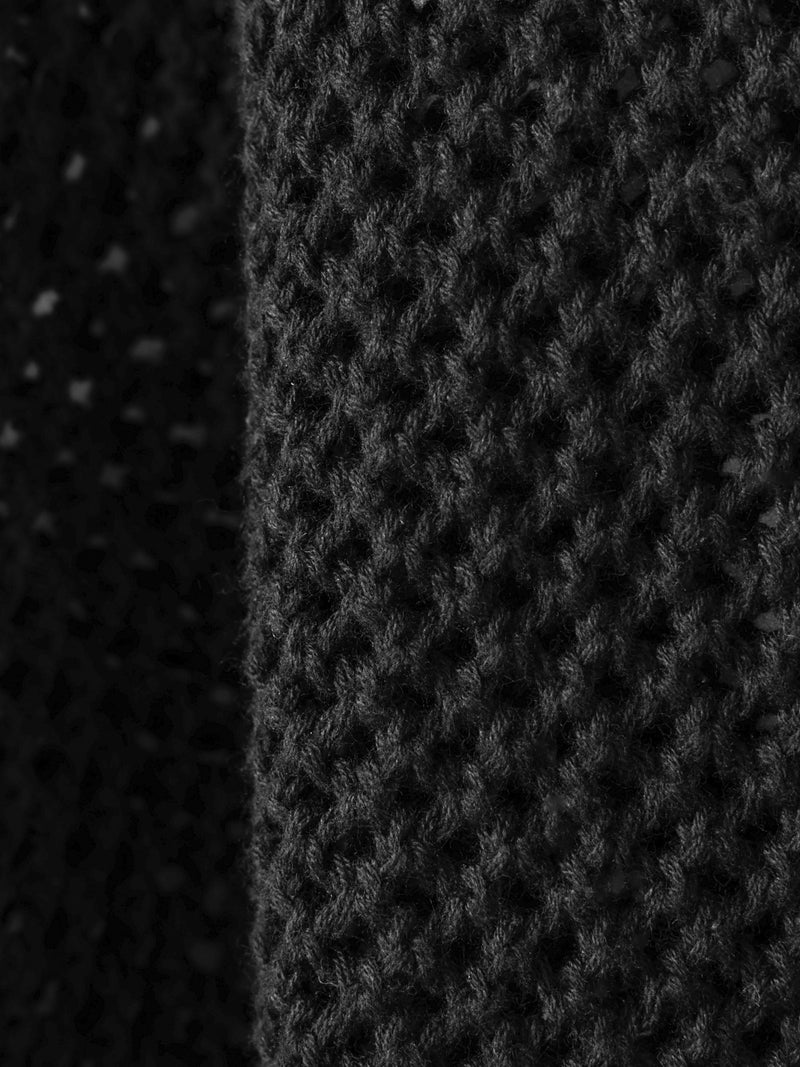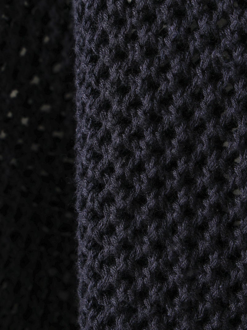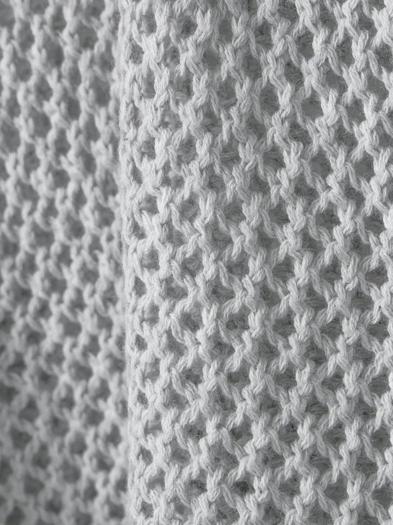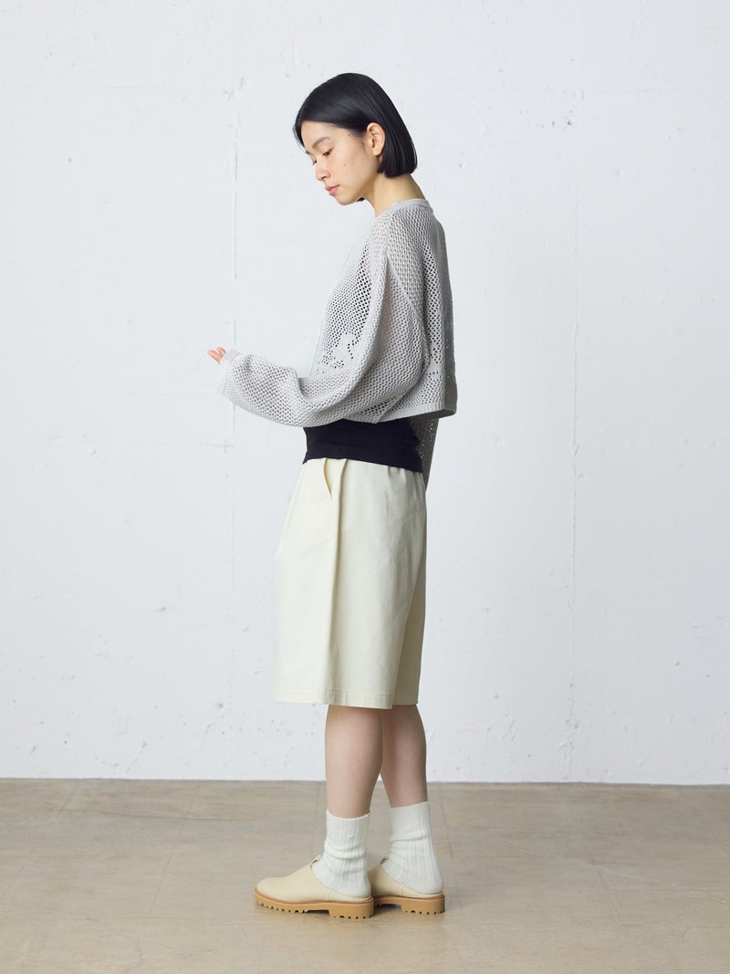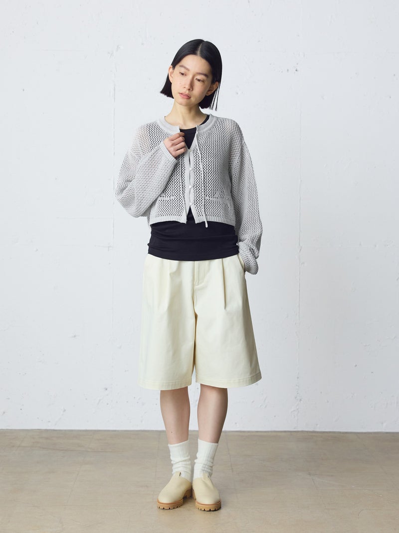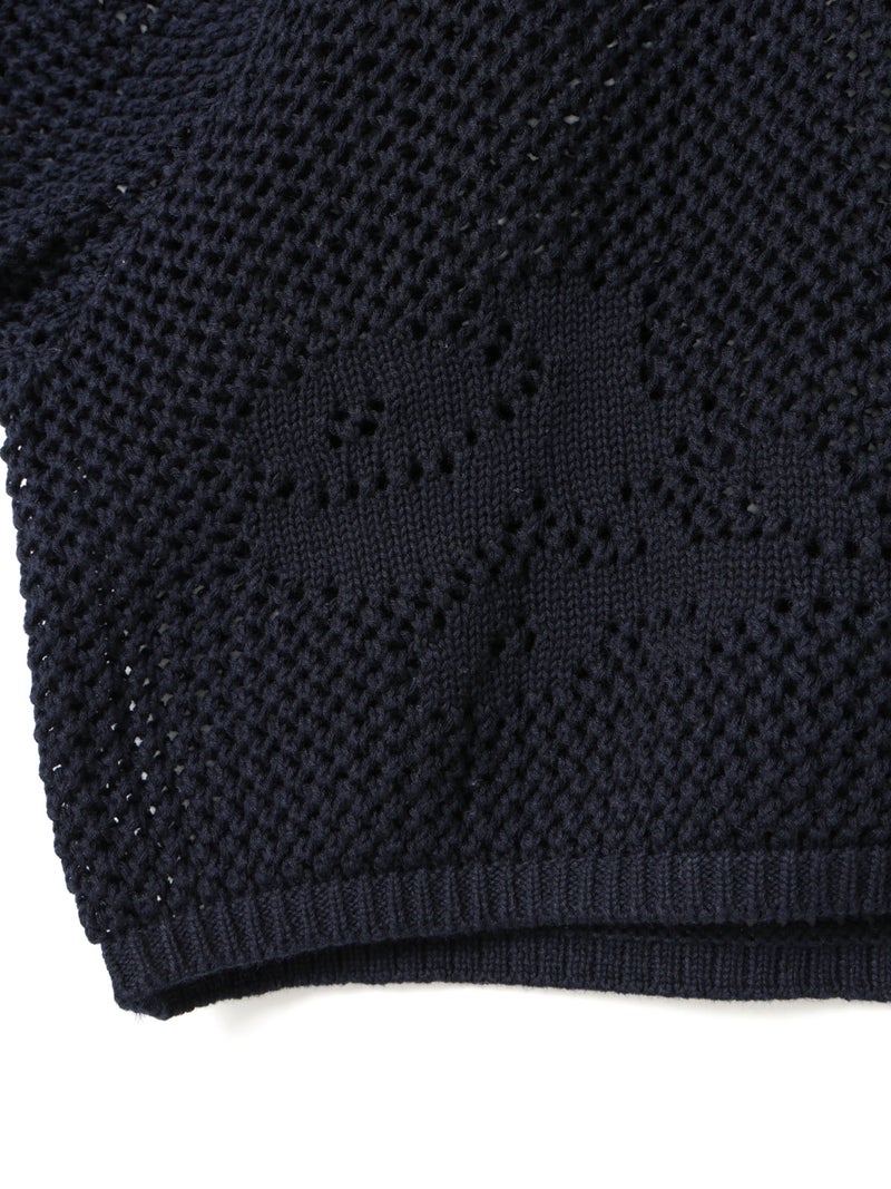 かぎ針編み風ニット、ニードルワークカーディガンです。透けて浮き出る、メッシュニットに花柄を施したし短め丈のニットカーデ。袖は少し長めのゆとりのあるデザインで、首元を結んでいただける紐付きとなっています。ノースリーブのアイテムにさりげなく羽織っていただいても素敵です。色柄の重ねも楽しんでいただけ、春先も軽やかに羽織っていただける1枚です。
