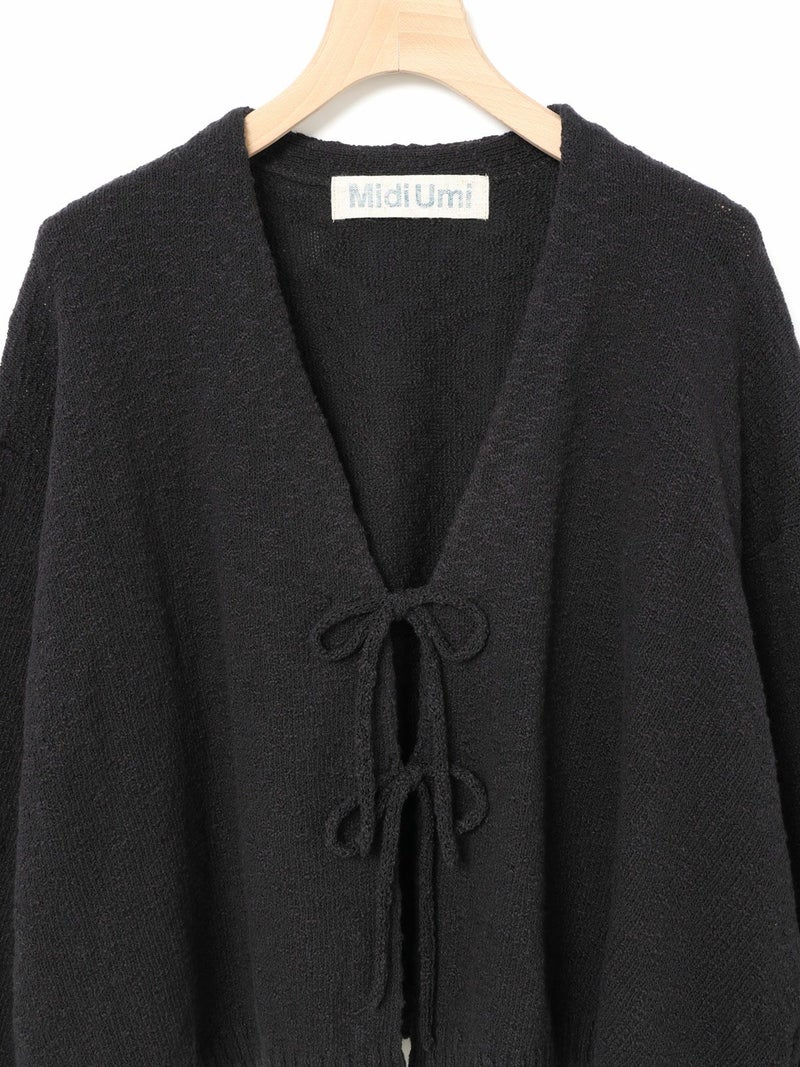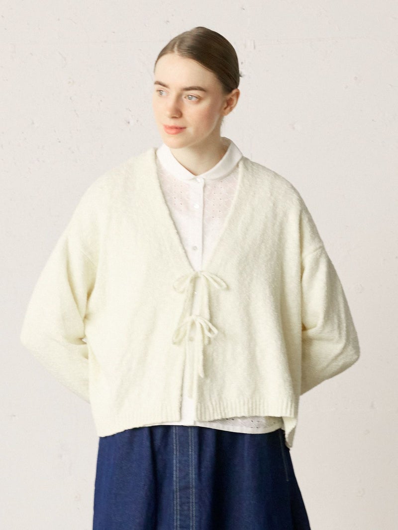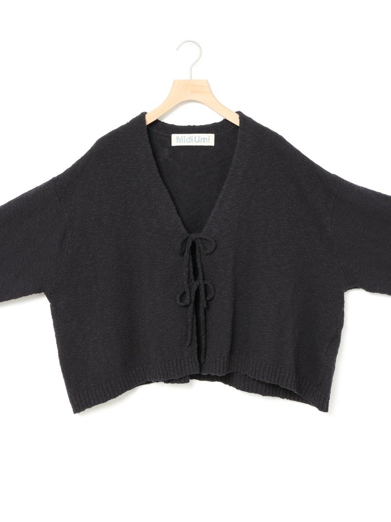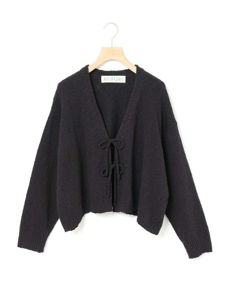 コットンナイロン糸を使用したリボンニットカーディガンです。スラブ感のある風合いのニットシリーズで1-729781/ドローストリングニットベスト、1-729782/ワイドニットベストも展開。フロントのリボンが特徴のニットカーデ。着丈は短めになっております。春先に気軽に羽織っていただける女性らしい1枚です。